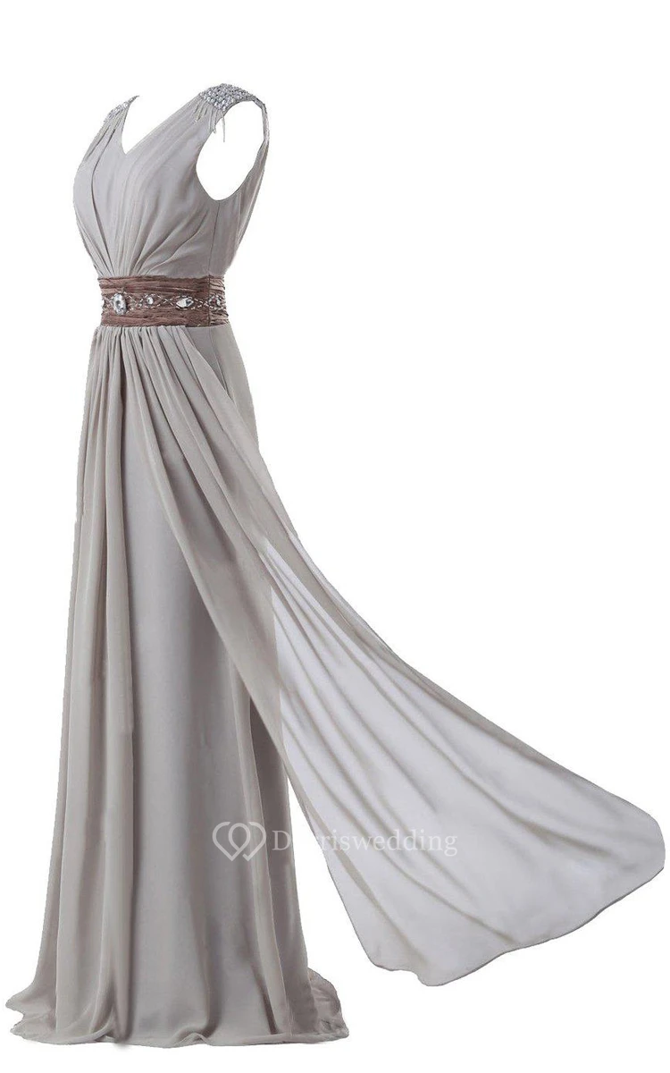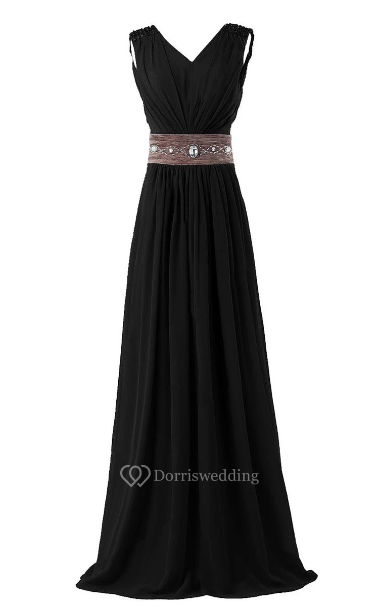 Sleeveless V-neck Long Chiffon Gown With Rhinestone