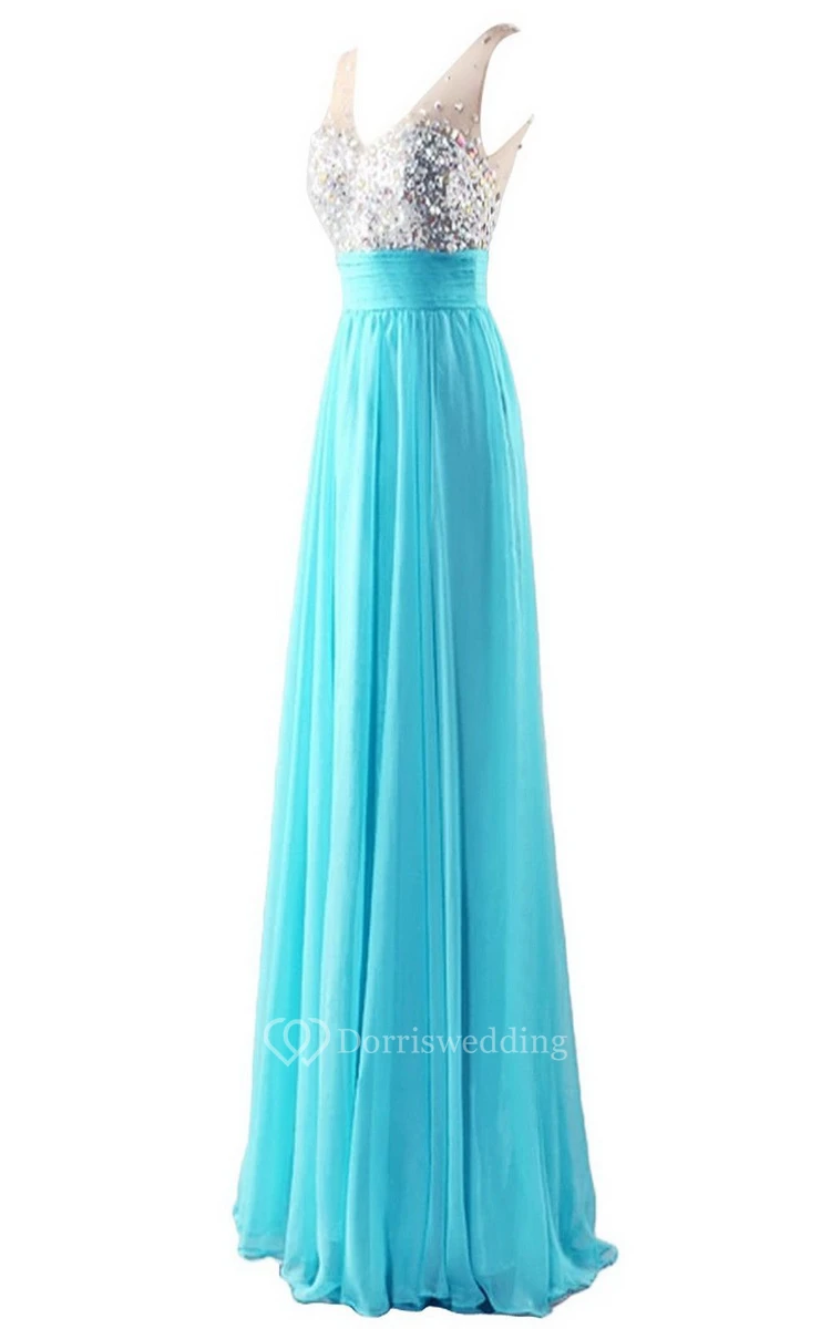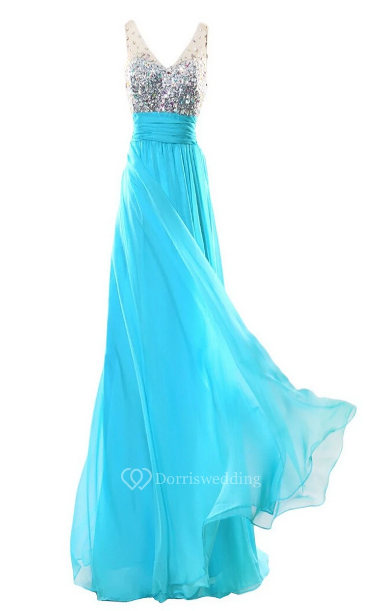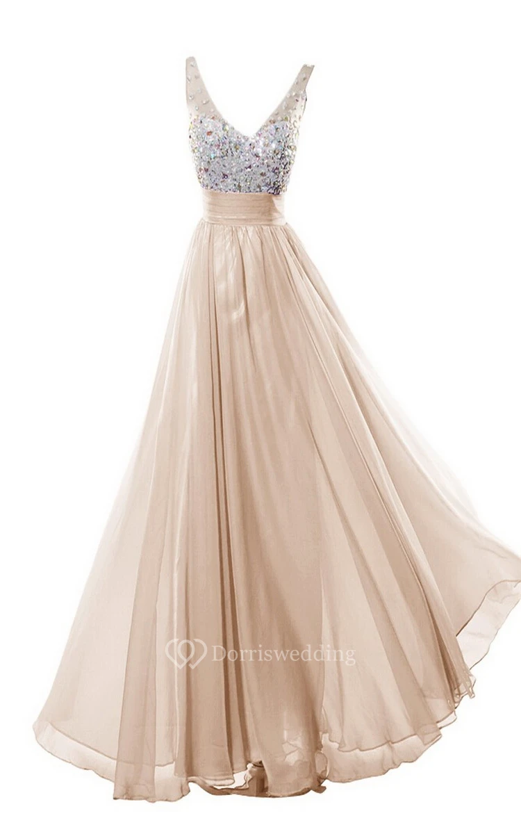 Sleeveless V-neck Long Dress With Rhinestone Bodice