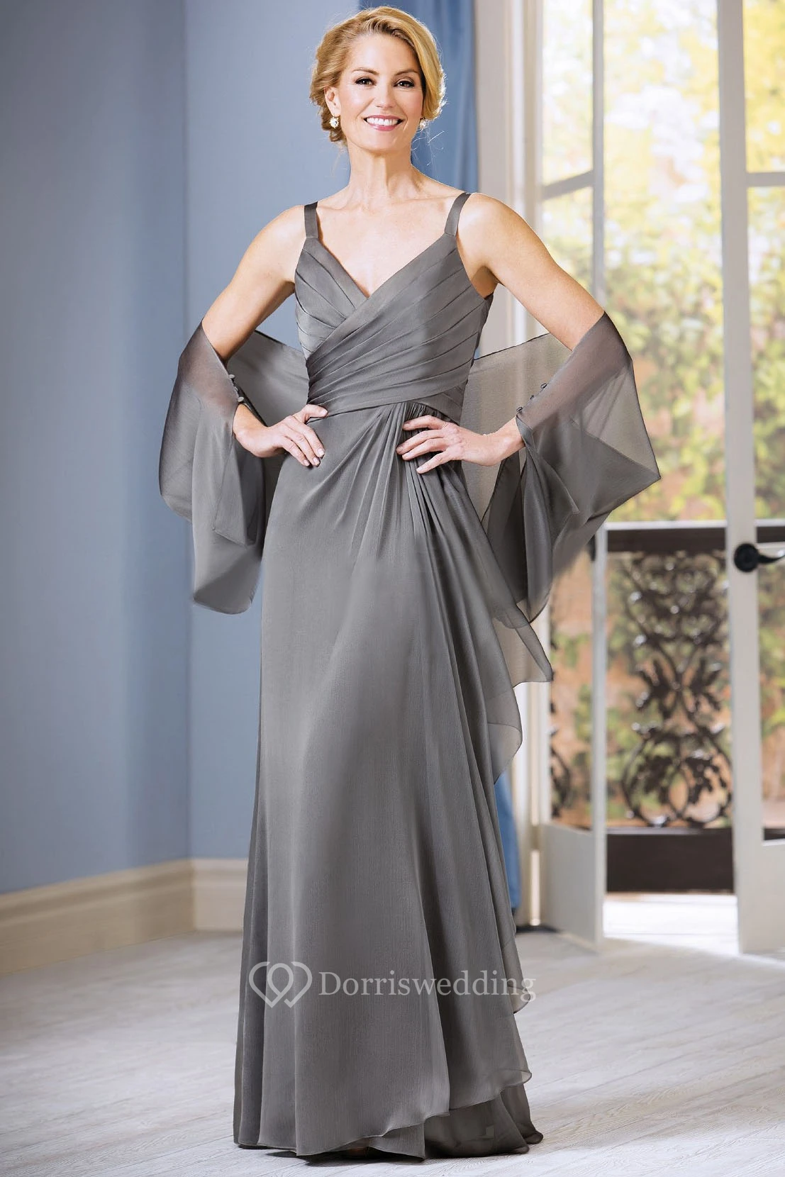 Sleeveless V-Neck Long Mother Of The Bride Dress With Ruching And Matching Shawl