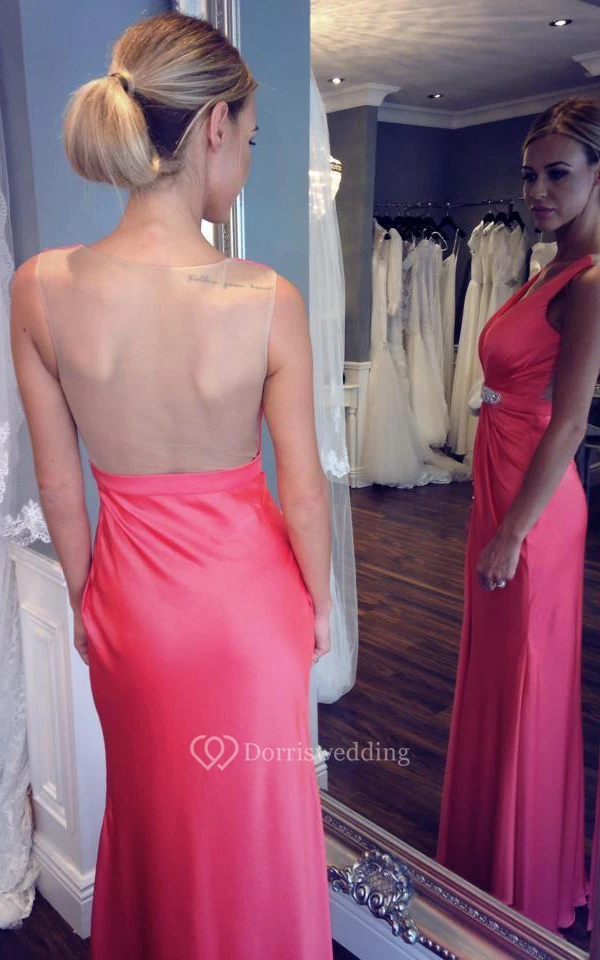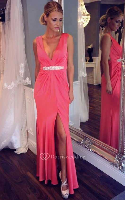 Sleeveless V-neck Long Sheath Dress with Beadings