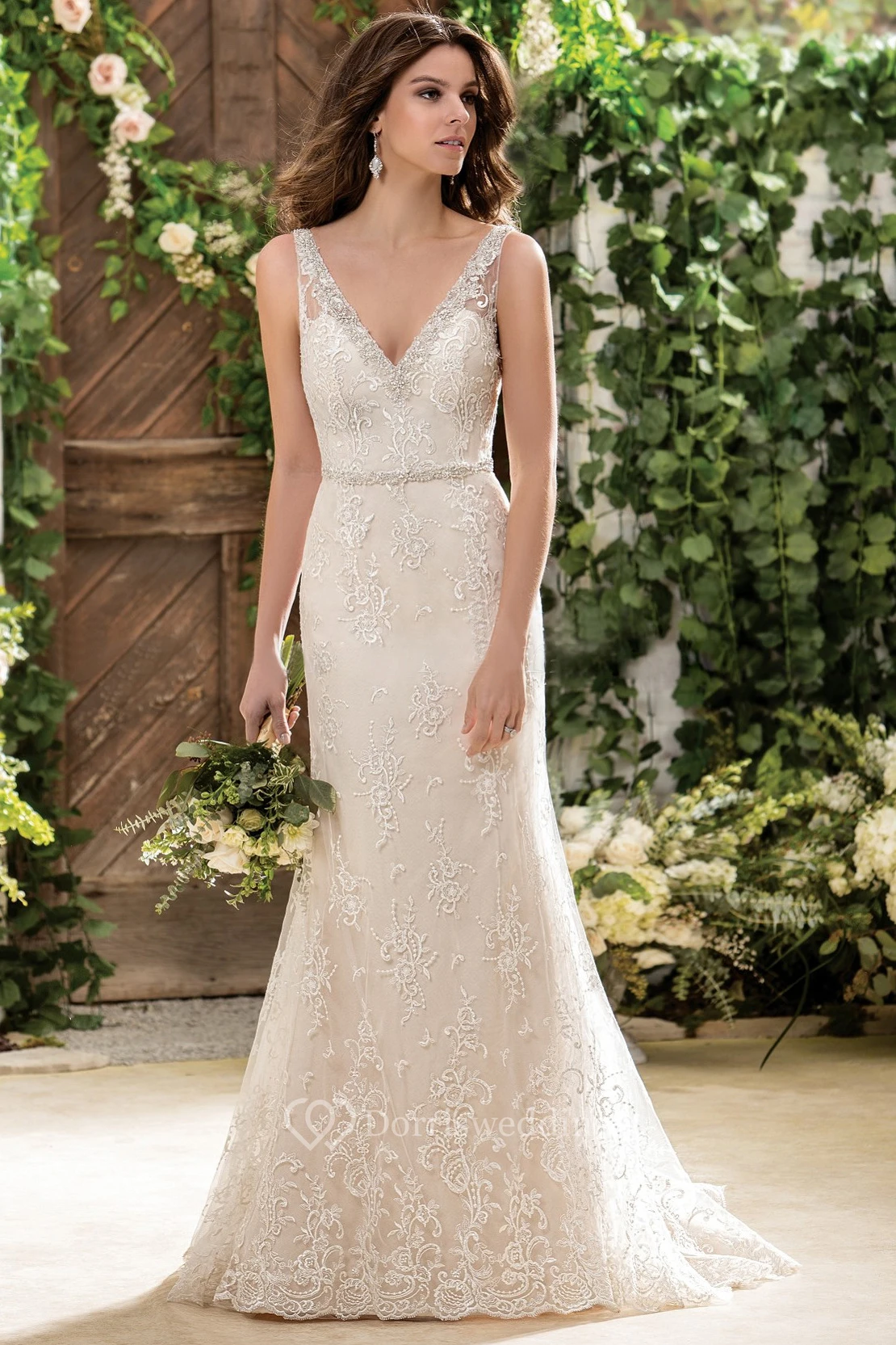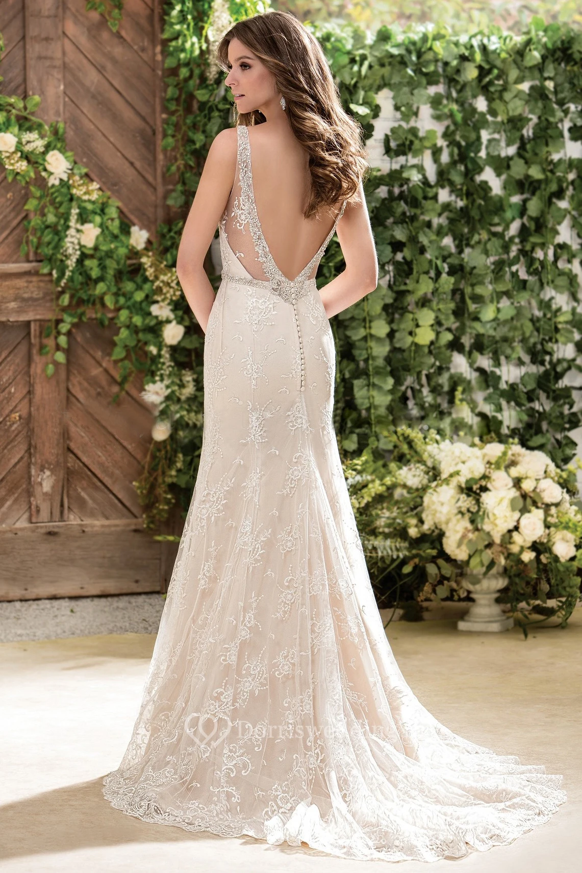 Sleeveless V-Neck Long Wedding Dress With Appliques And Deep V-Back
