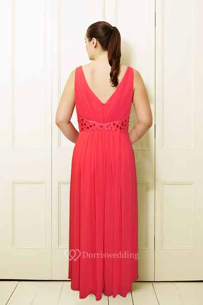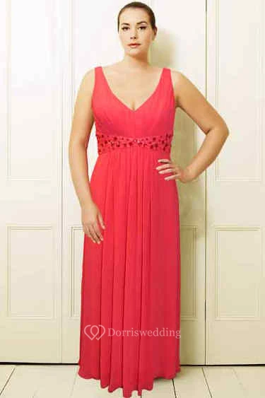Sleeveless V-Neck Maxi Beaded Chiffon Plus Size Prom Dress With Pleats