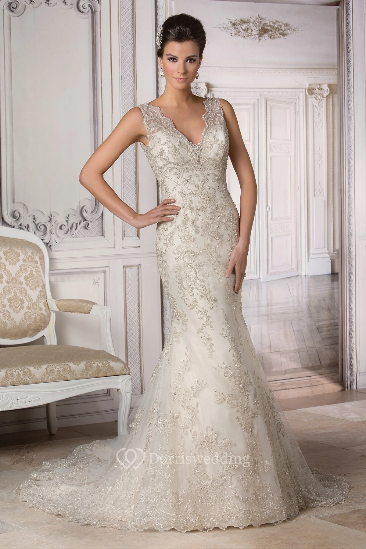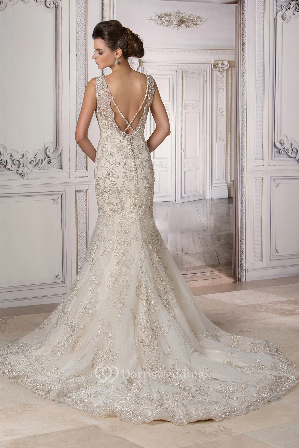 Sleeveless V-Neck Mermaid Wedding Dress With Crystals And Deep V-Back