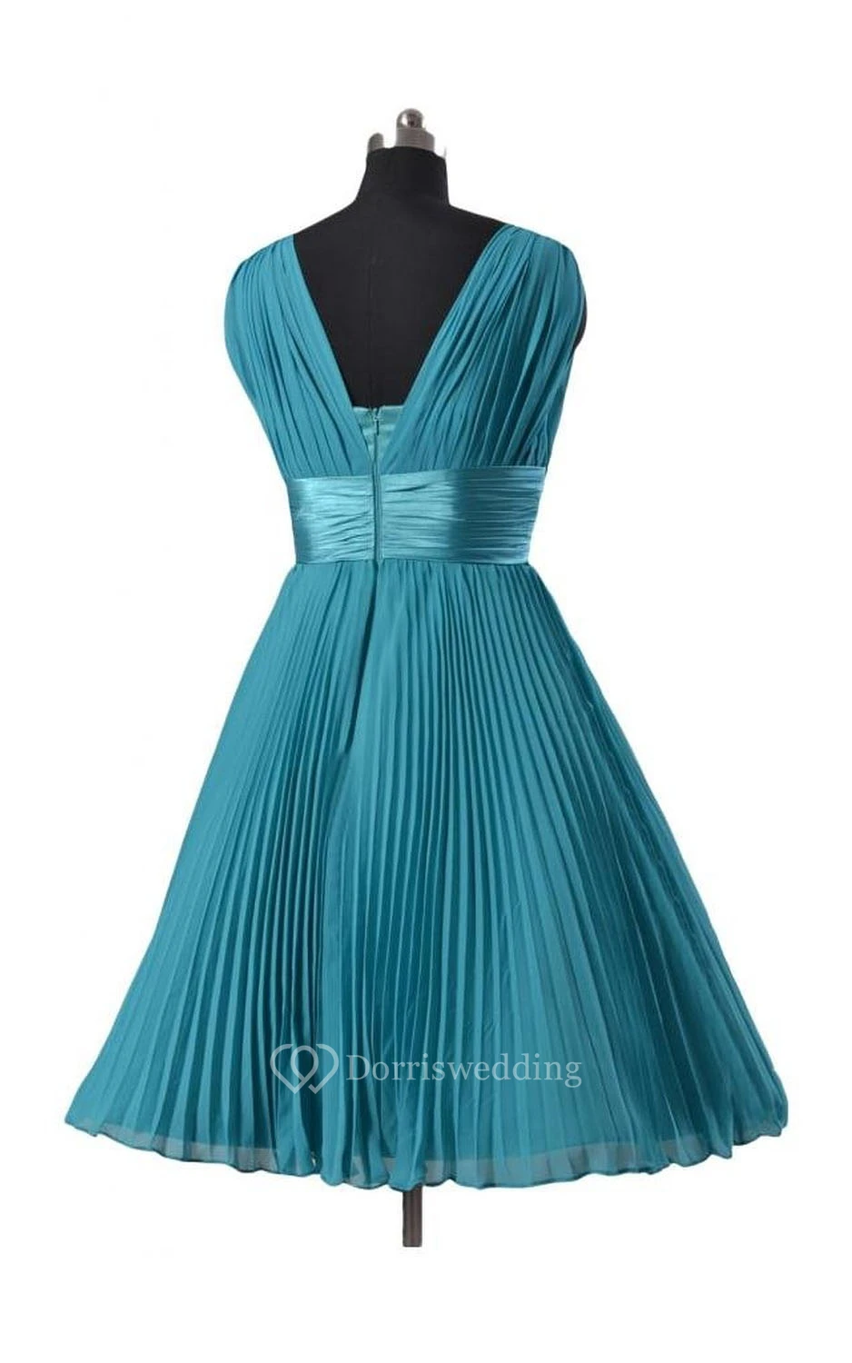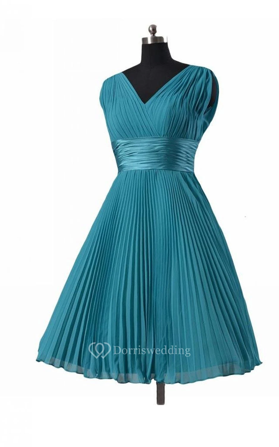 Sleeveless V-neck Ruched Sash Knee-length Pleated Chiffon Dress