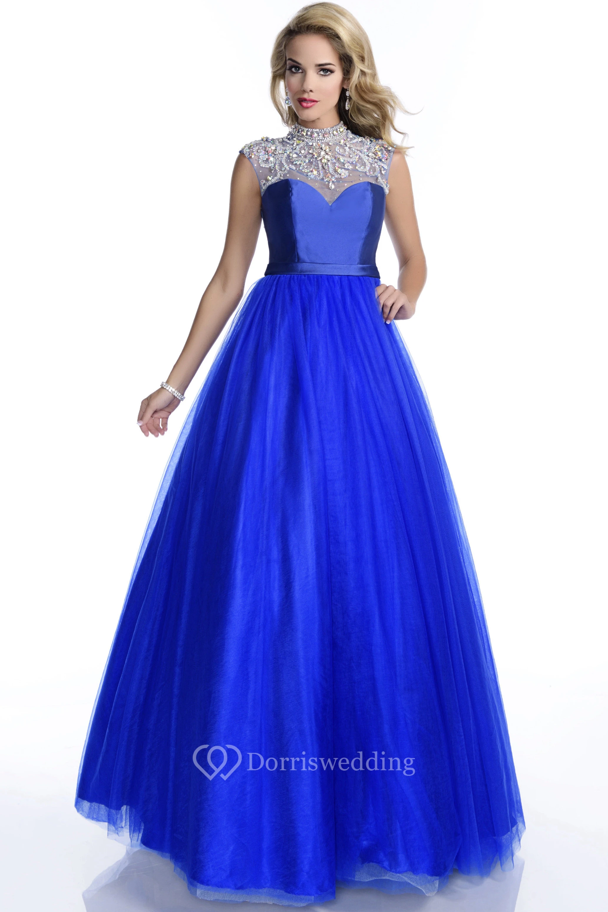 Sophisticated A-Line Cap Sleeve High Neck Tulle Prom Dress With Rhinestones Appliques