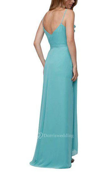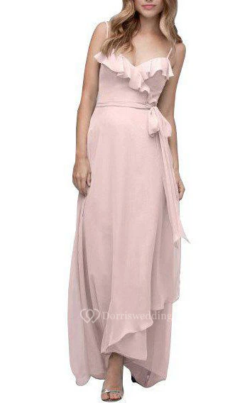 Spagetti Straps Wrap Tea-length Chiffon Bridesmaid Dress