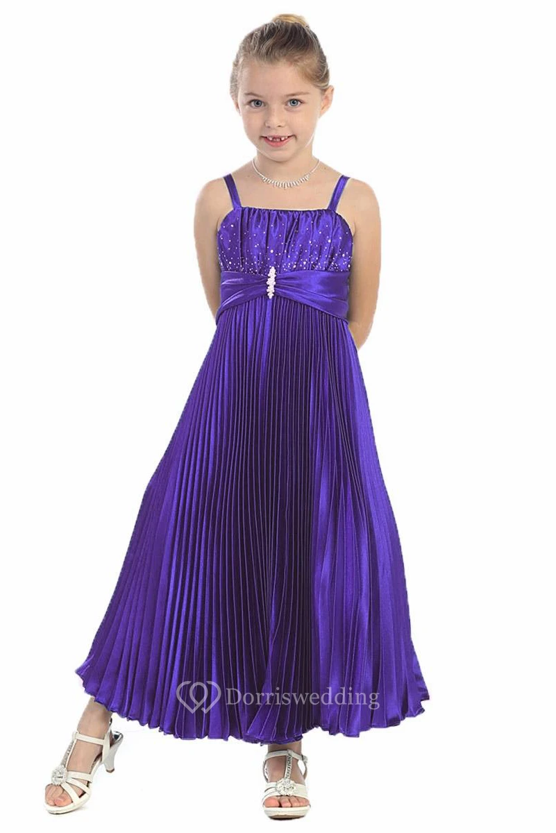 Spaghetti Ankle-Length Pleated Satin Flower Girl Dress