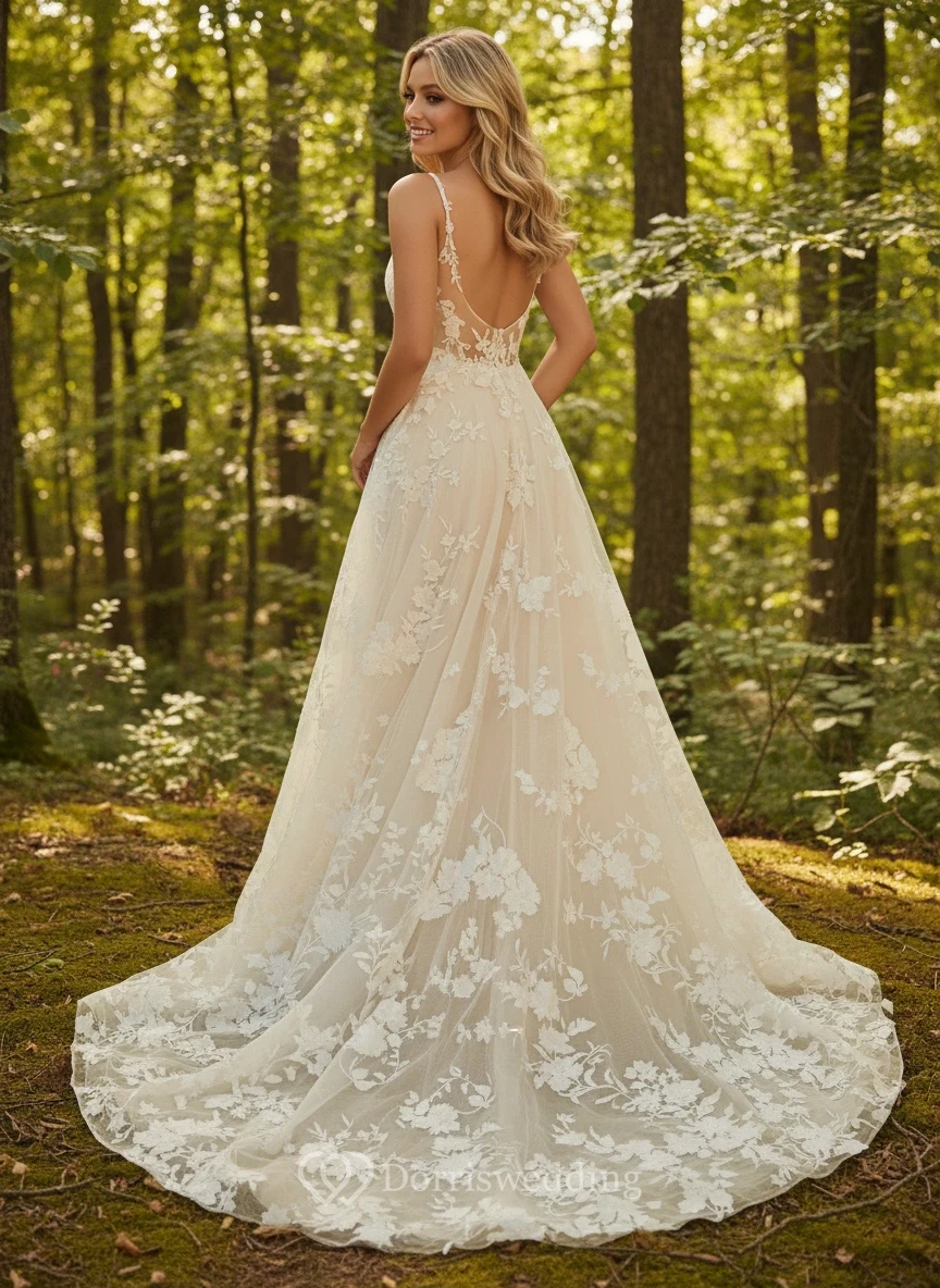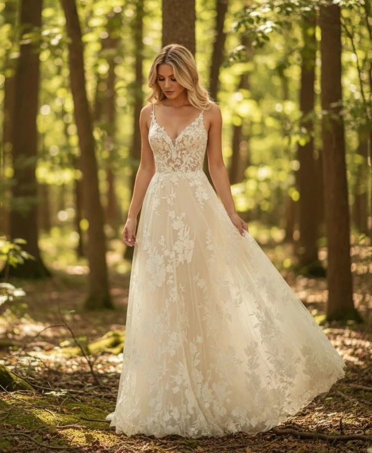 This romantic forest wedding dress features a deep V-neck, spaghetti straps, and a high-slit skirt with lace details. Photographed in a wooded area with sunlight filtering through trees, it creates an enchanting and serene atmosphere for a woodland wedding ceremony.