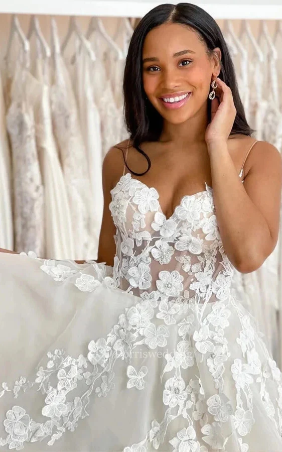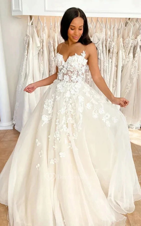 Spaghetti Empire Elegant A-line Lace Applique Sleeveless Wedding Dress