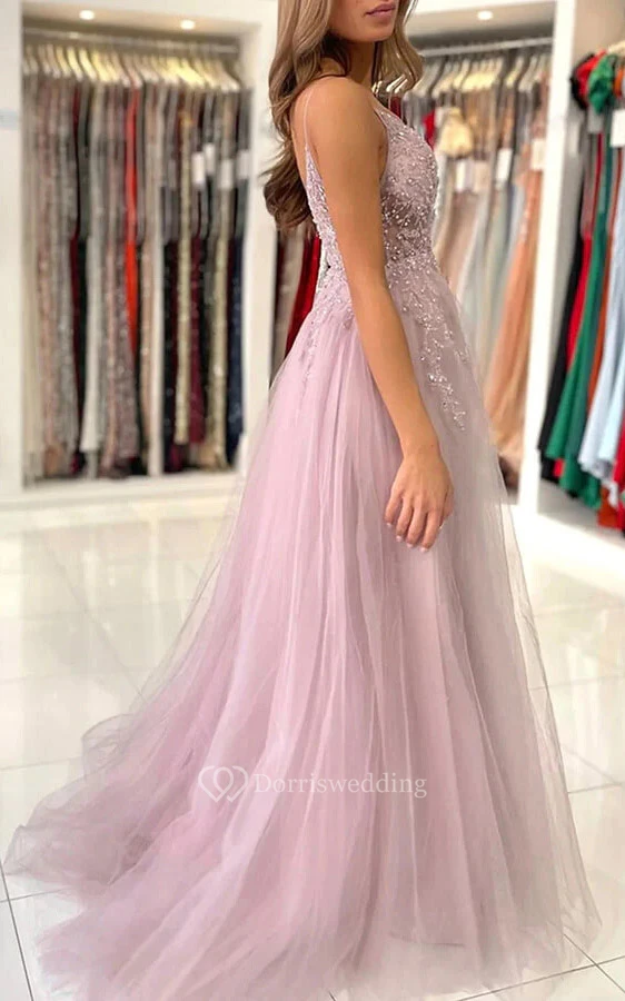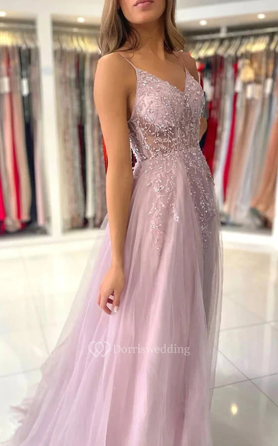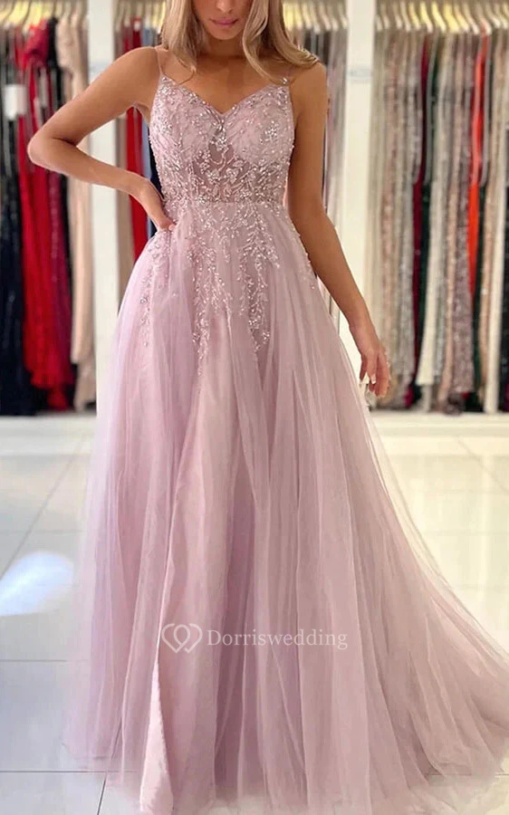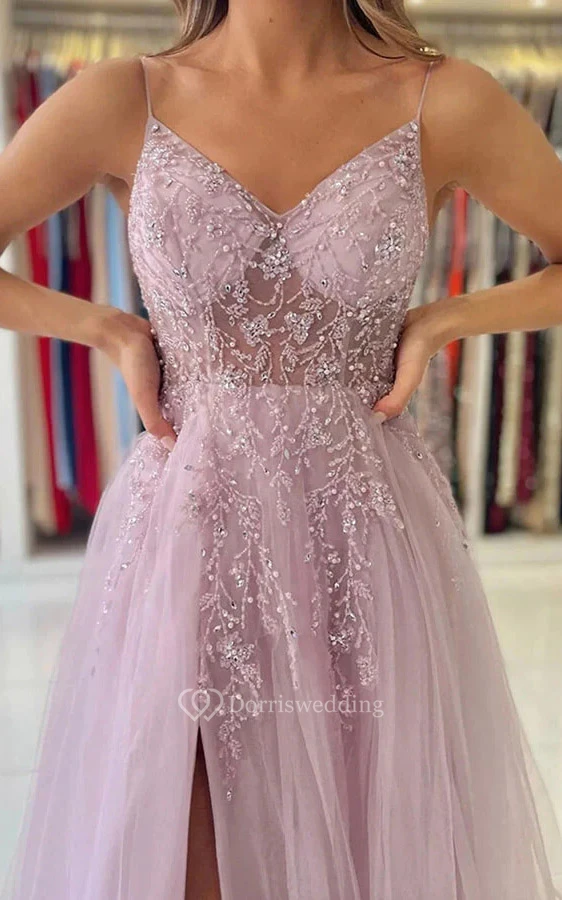 Spaghetti Front Split Beaded Applique Front Split Tulle Evening Prom Dress