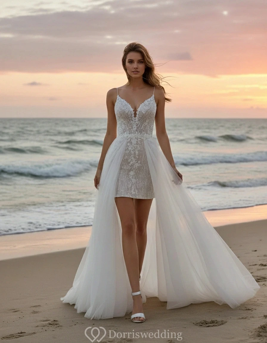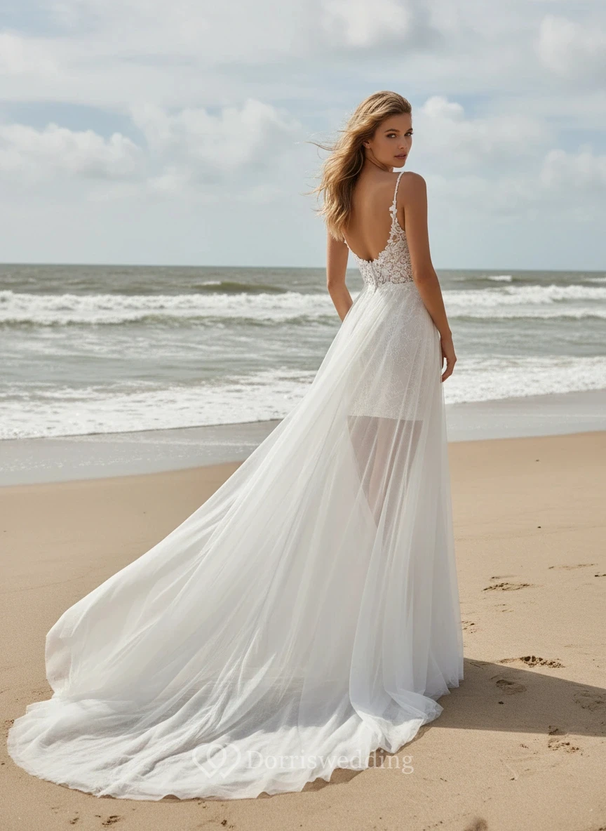 Spaghetti Lace Beach Wedding Dress with Detachable Skirt