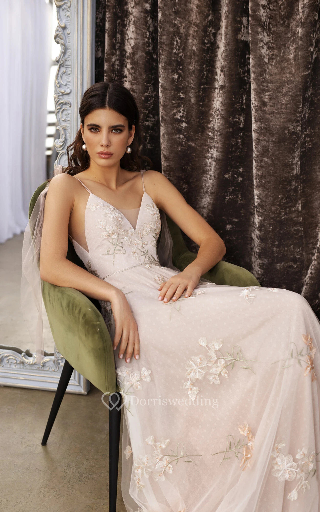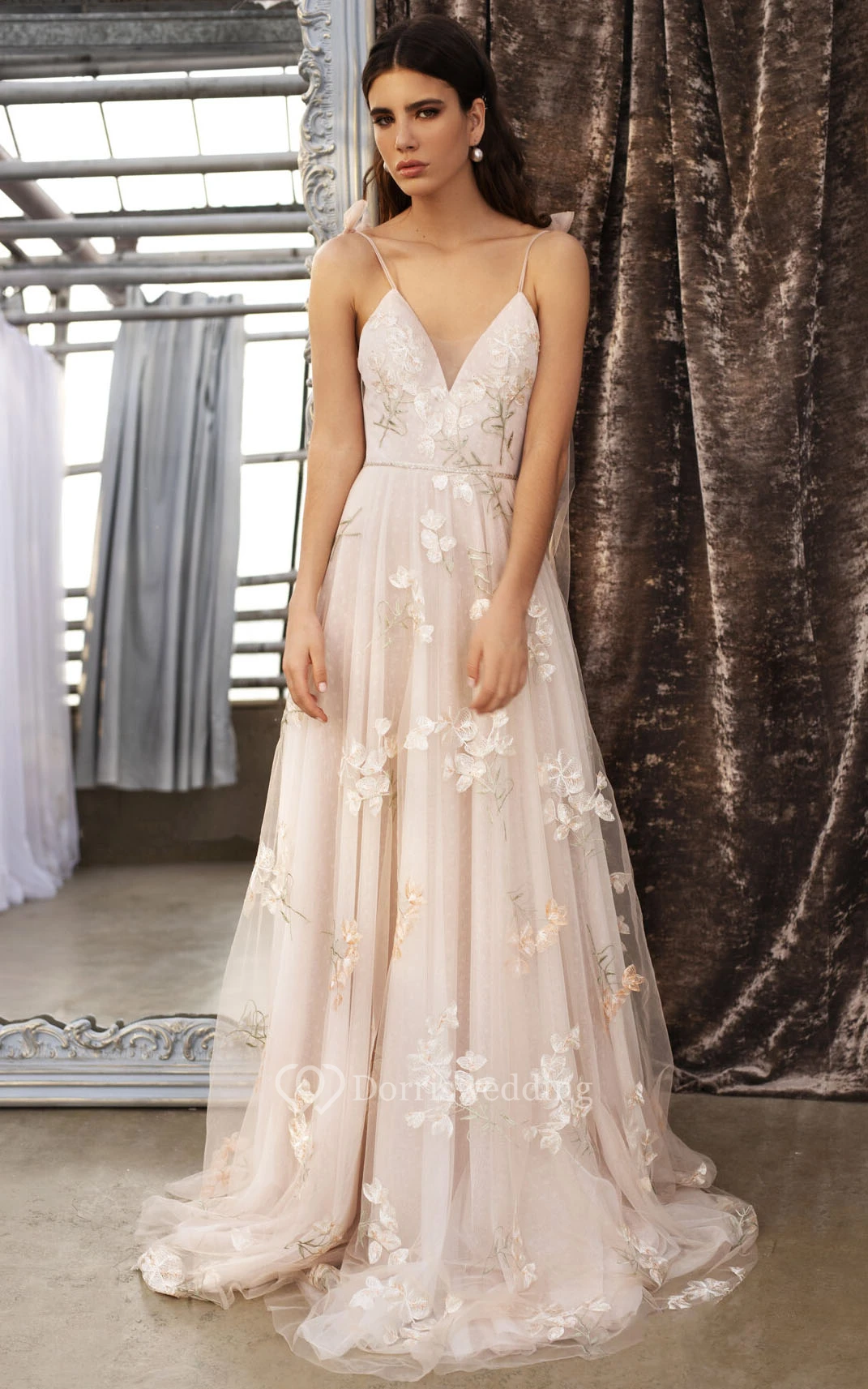 Spaghetti Plunged Embroideried Empire Blush A-line Tulle Pleated Wedding Dress