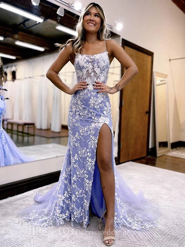 Spaghetti Sky Blue Mermaid Lace Applique Sexy Front Split Prom Dress