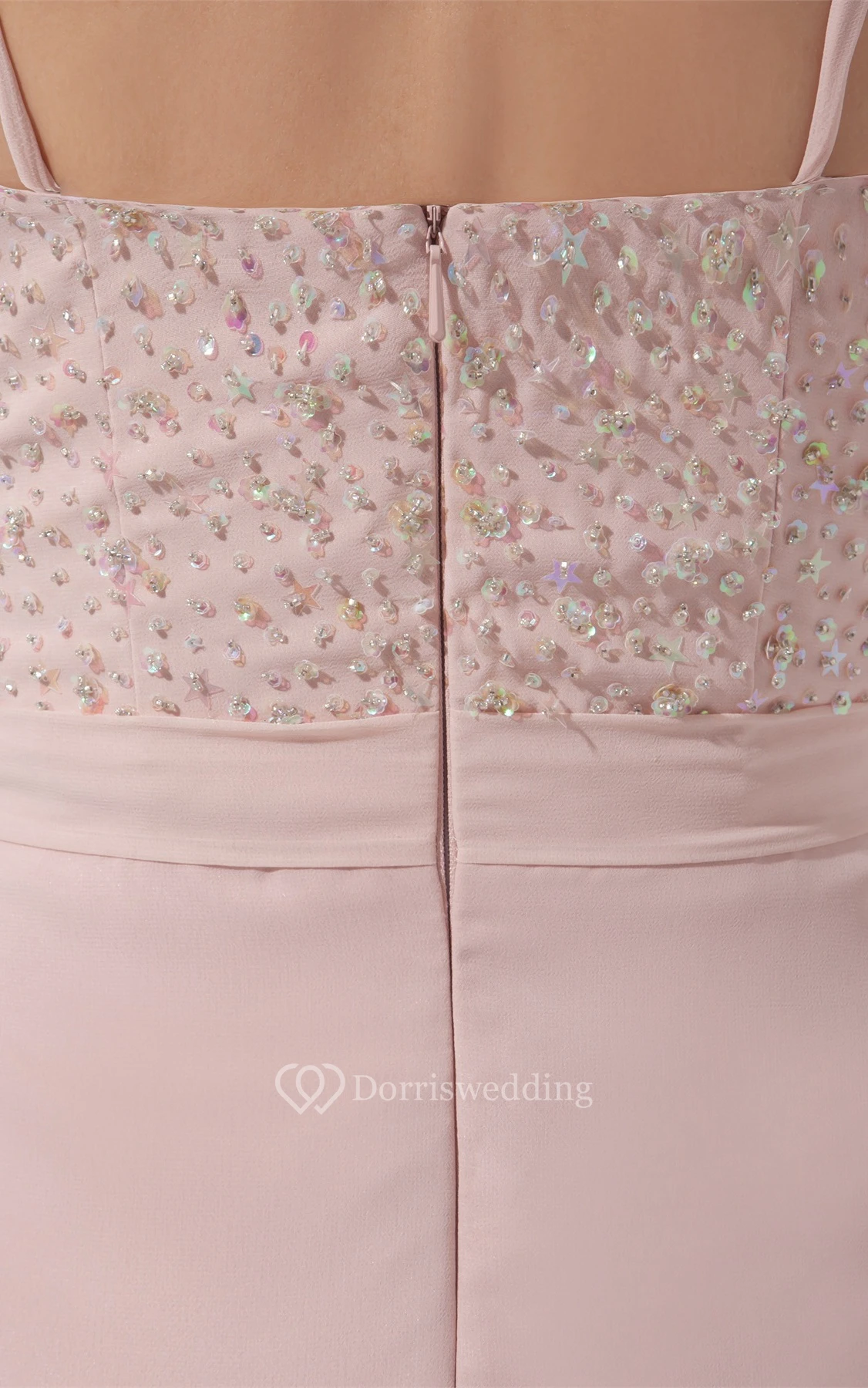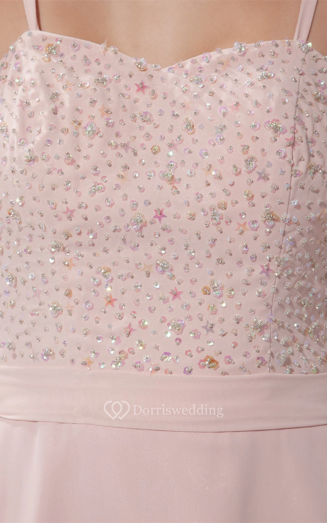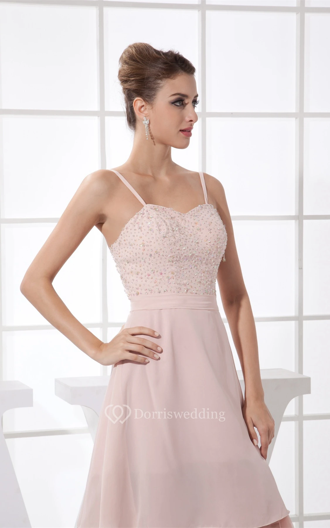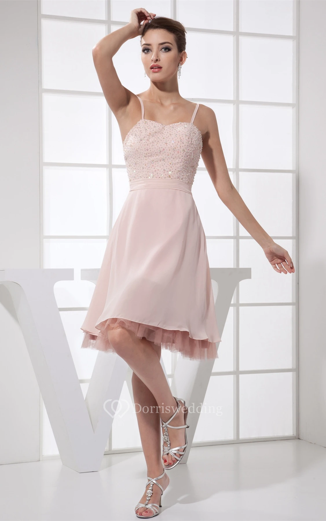 Spaghetti Straps Knee Length A-Line Chiffon Dress With Beadings and Zipper Back