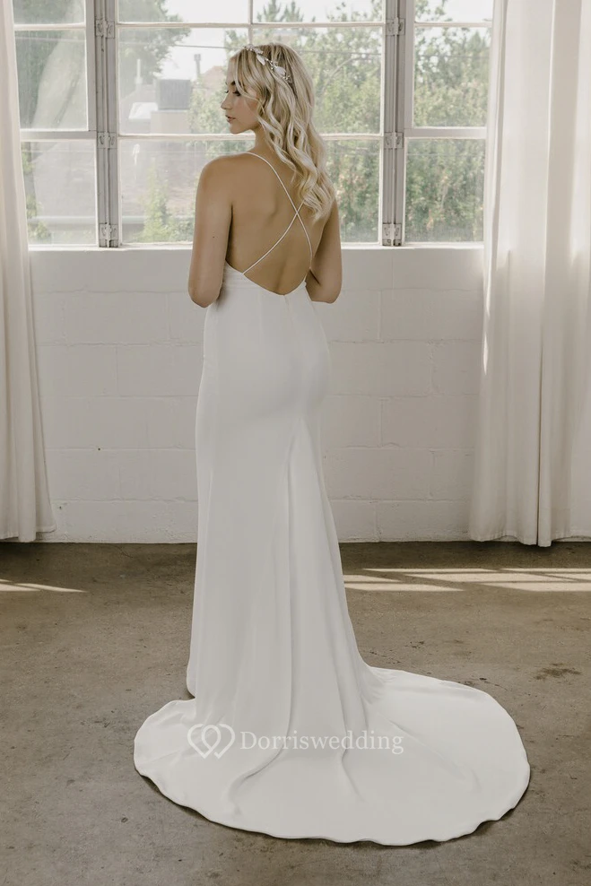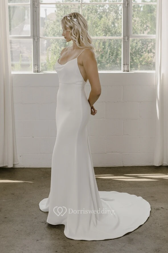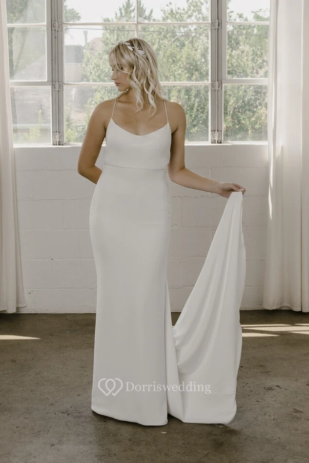Spaghetti Straps With Open Back And Straps Simple Sheath Wedding Dress In Court Train