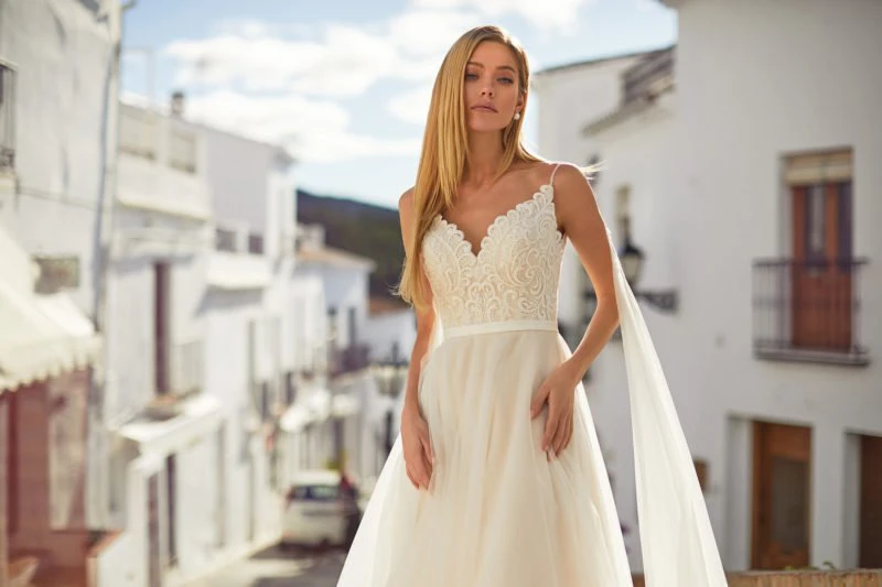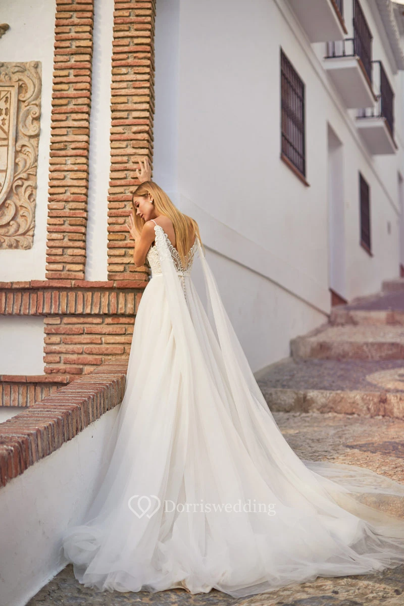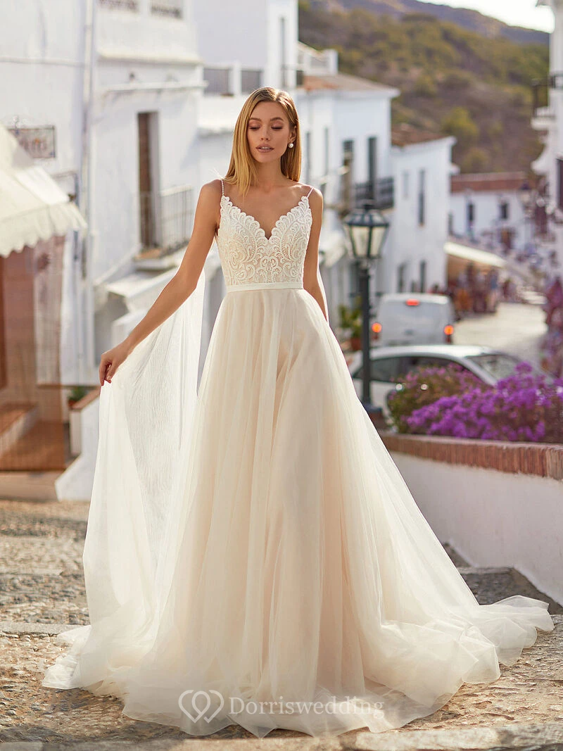 Spaghetti Summer Sleeveless Tulle Wedding Dress with Lace Top