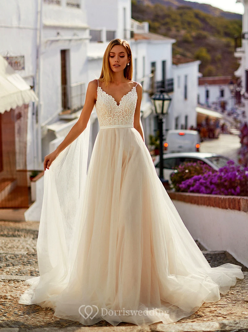 Spaghetti Summer Tulle A-line Wedding Dress with Lace Top