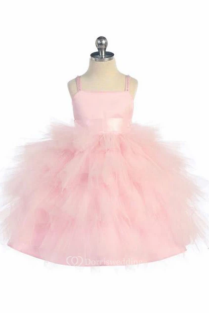 Spaghetti Tea-Length Beaded Tulle&Satin Flower Girl Dress