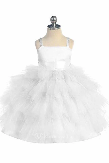 Spaghetti Tea-Length Beaded Tulle&Satin Flower Girl Dress