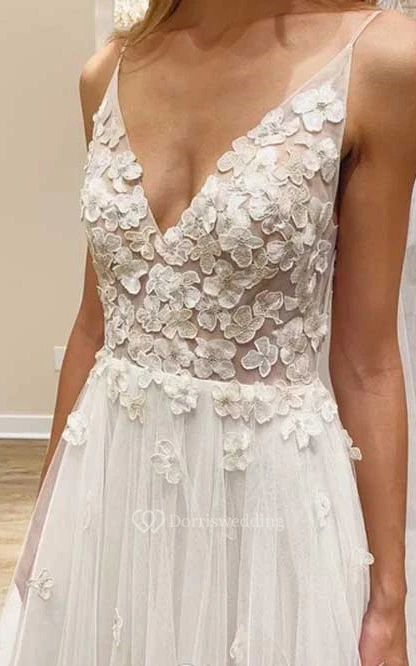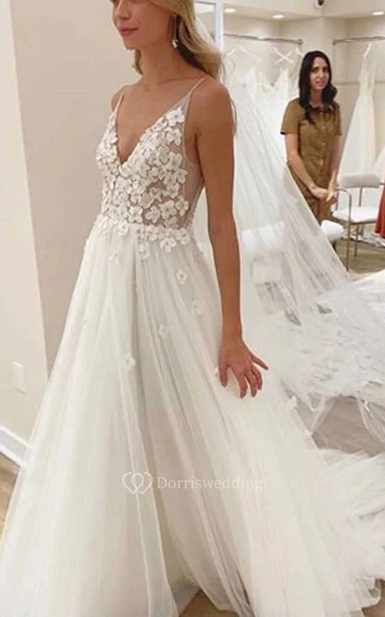 Spaghetti V-neck Empire Tulle Pleated Wedding Dress with Sweep Train and Lace Applique