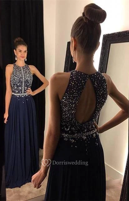 Sparkly Navy Blue Sleeveless Prom Dresses Long Chiffon Beadings