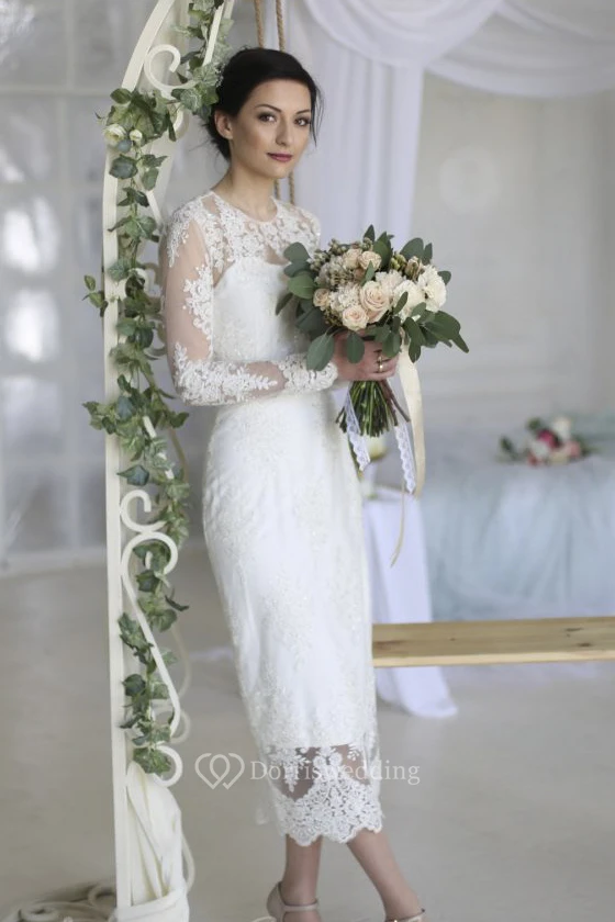 Split Back Sheath Ankle-length Short Wedding Dress With Illusion Lace Appliques