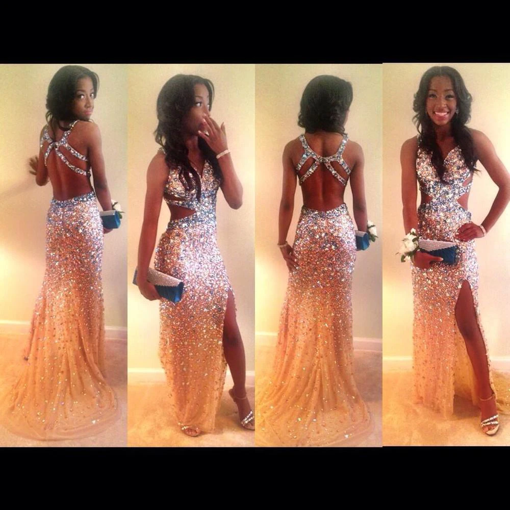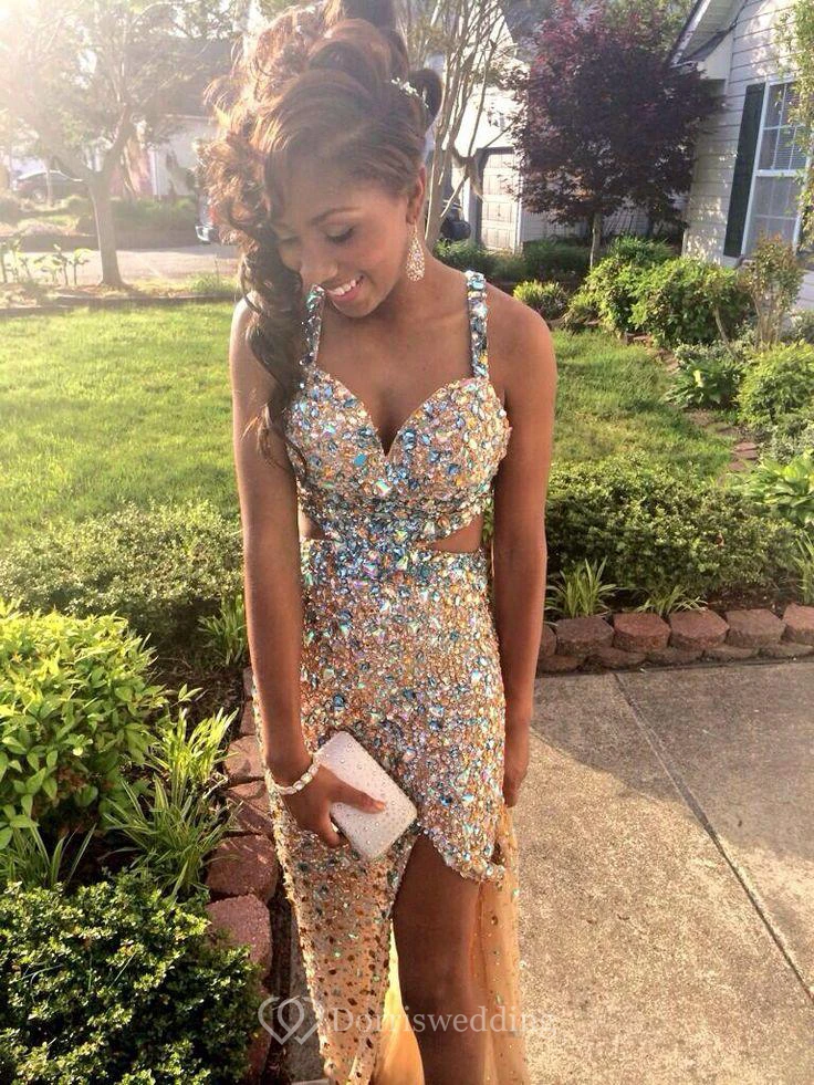 Split Beadings Sexy Prom Dress Stunning Crystal Straps and Front