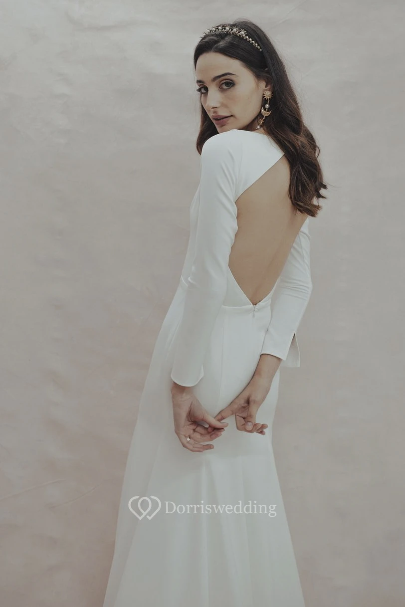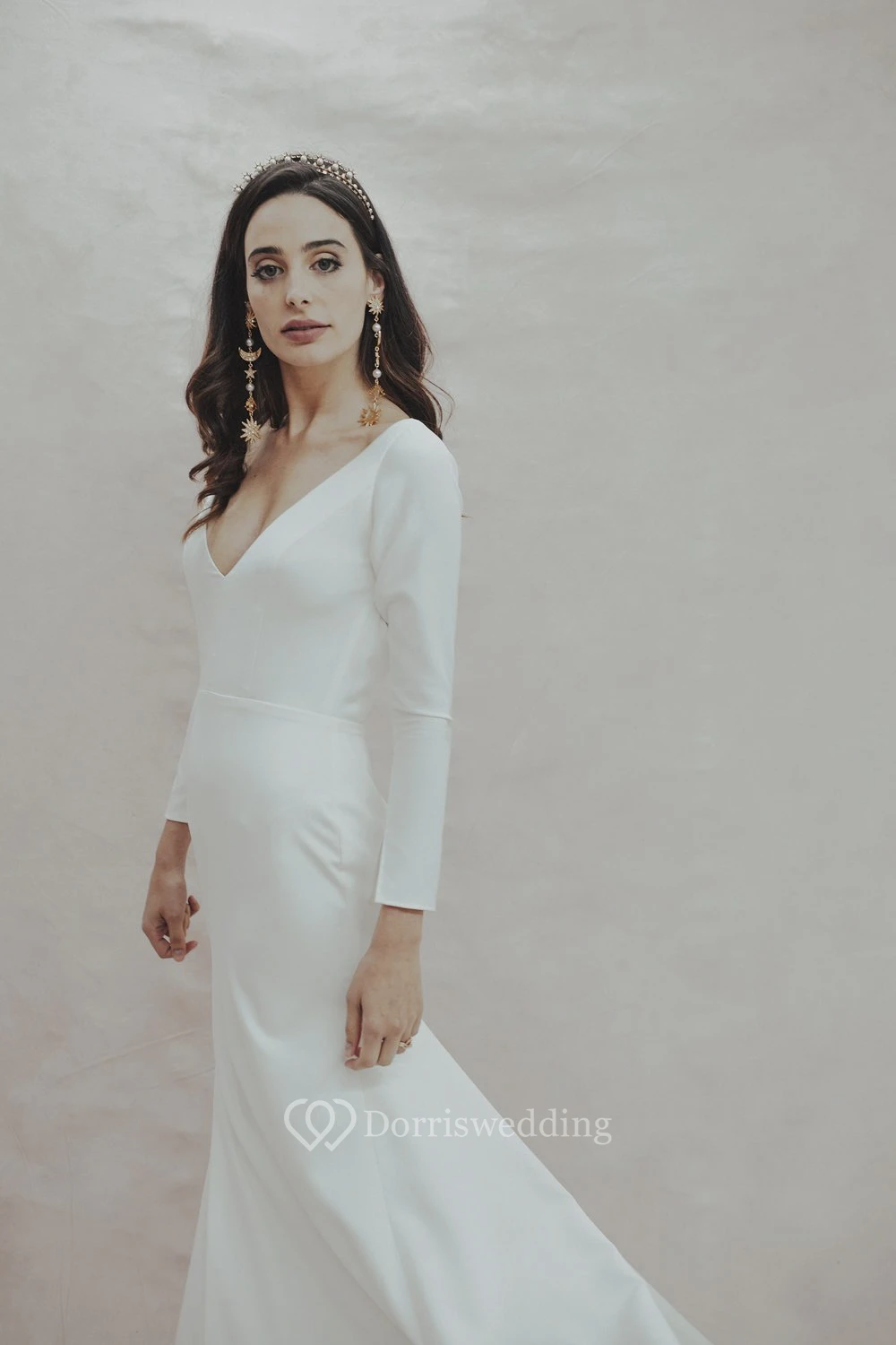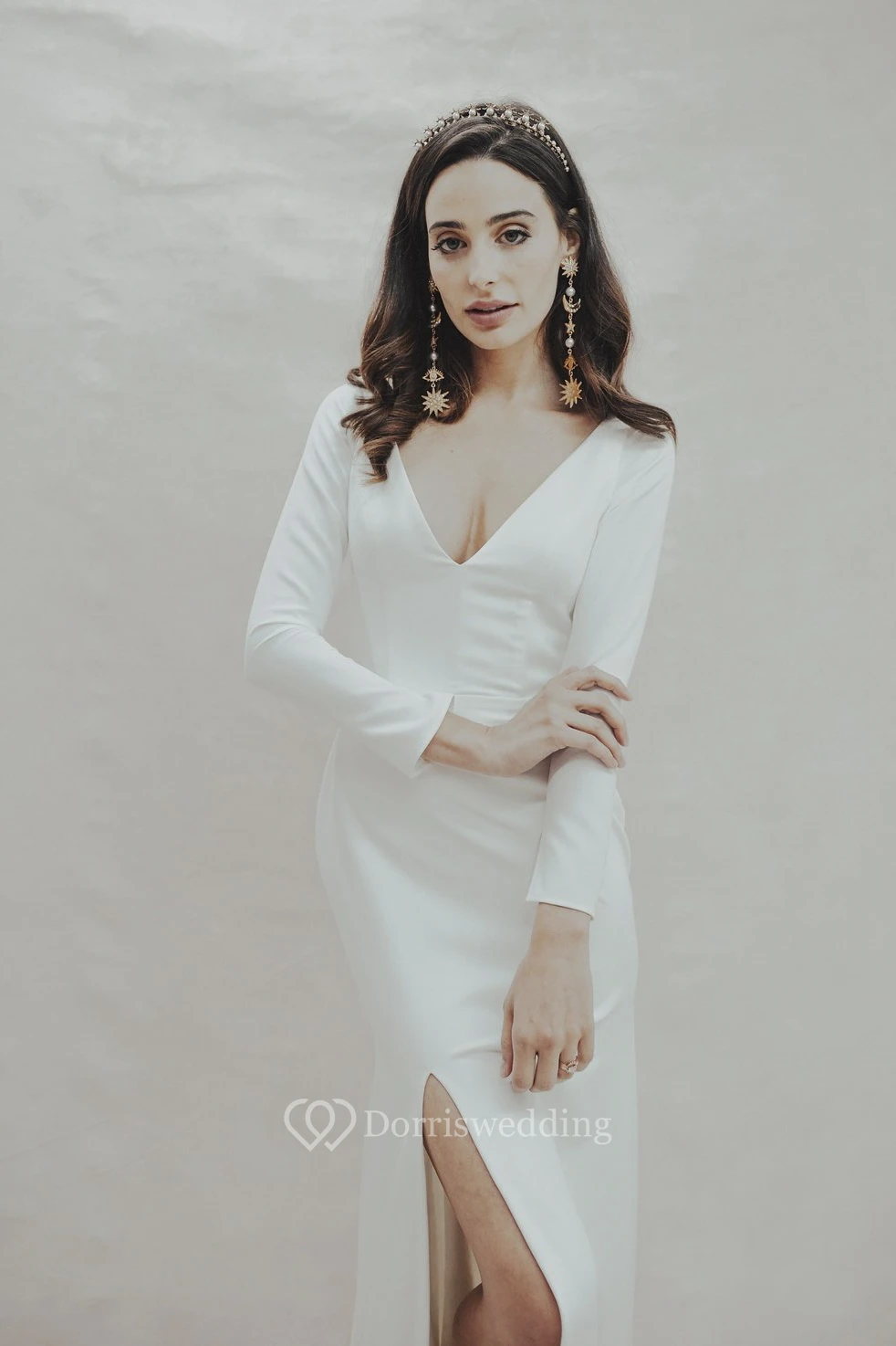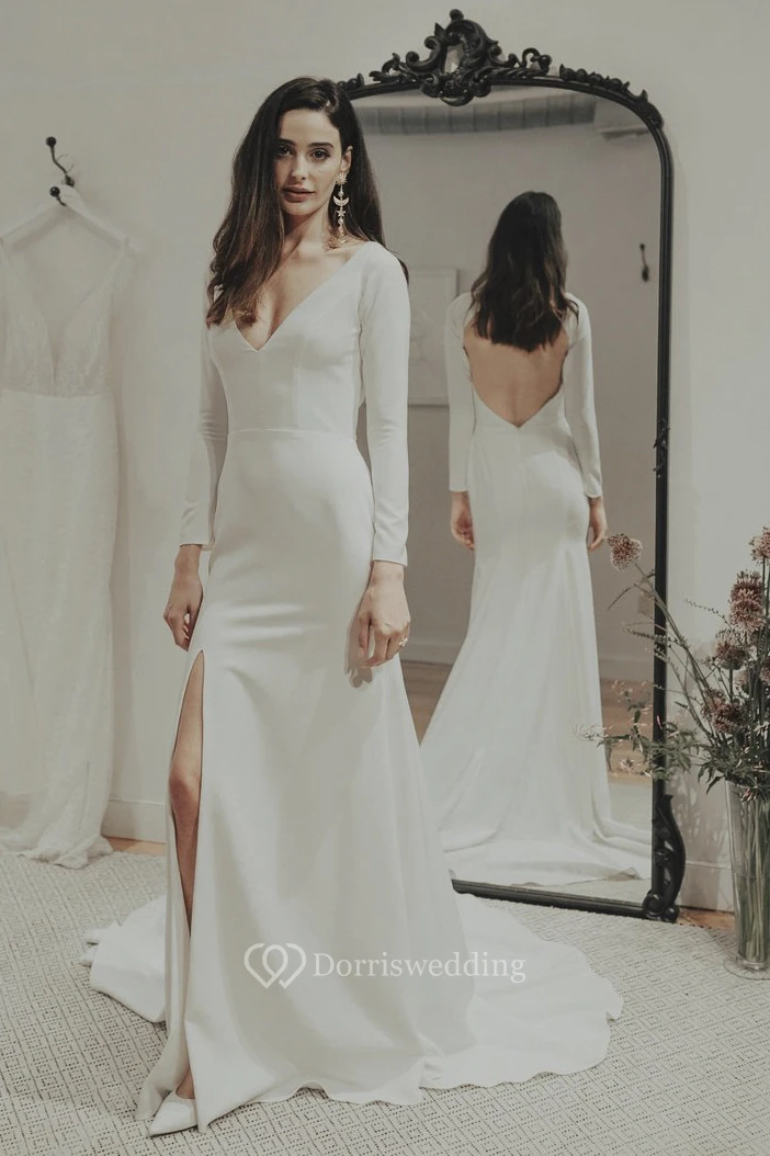 Split Front Satin Sexy Wedding Bridal Gown With Deep V-neck And Keyhole