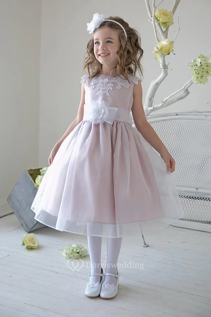 Split-Front Tea-Length Appliqued Beaded Lace&Sequins Flower Girl Dress With Tiers