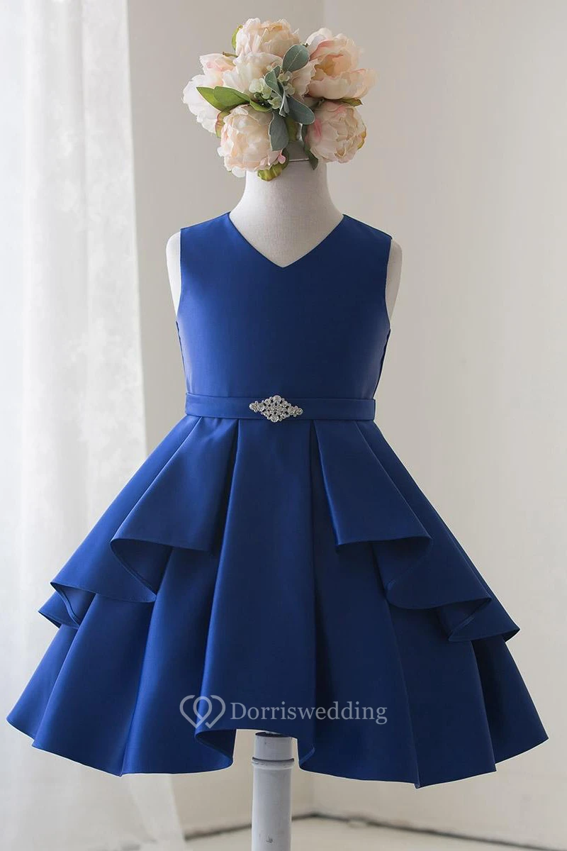 Split Knee-Length Split-Front Beaded Satin Flower Girl Dress With Sash