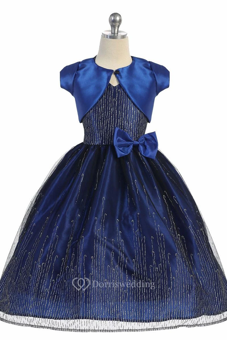 Split Tea-Length Bowed Split-Front Tulle&Taffeta Flower Girl Dress With Sash