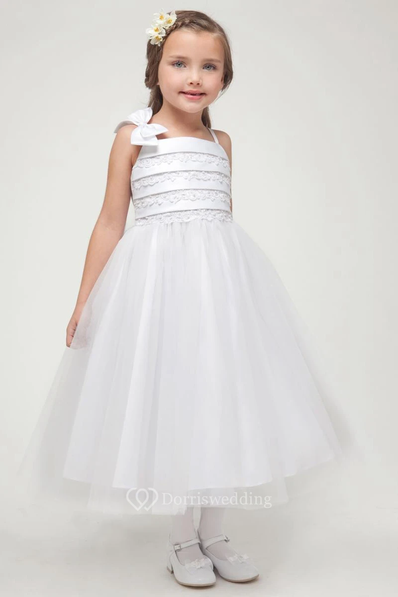 Split Tea-Length Split-Front Bowed Tulle&Satin Flower Girl Dress With Embroidery