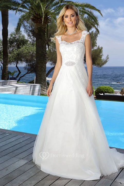 Square Floor-Length Appliqued Tulle Wedding Dress With Waist Jewellery And Keyhole