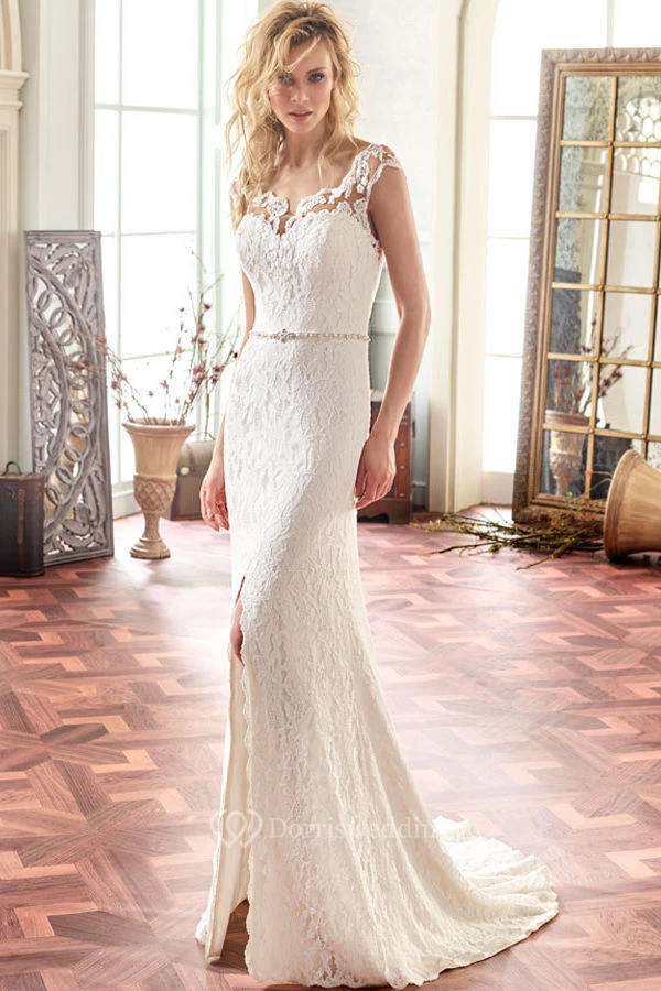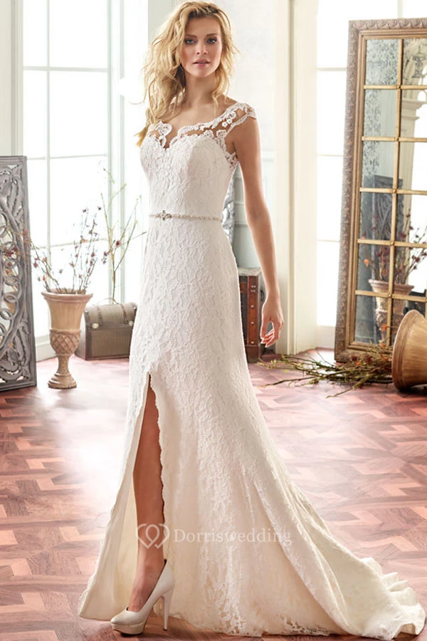 Square Long Split-Front Lace Wedding Dress Styles With Sweep Train And Illusion