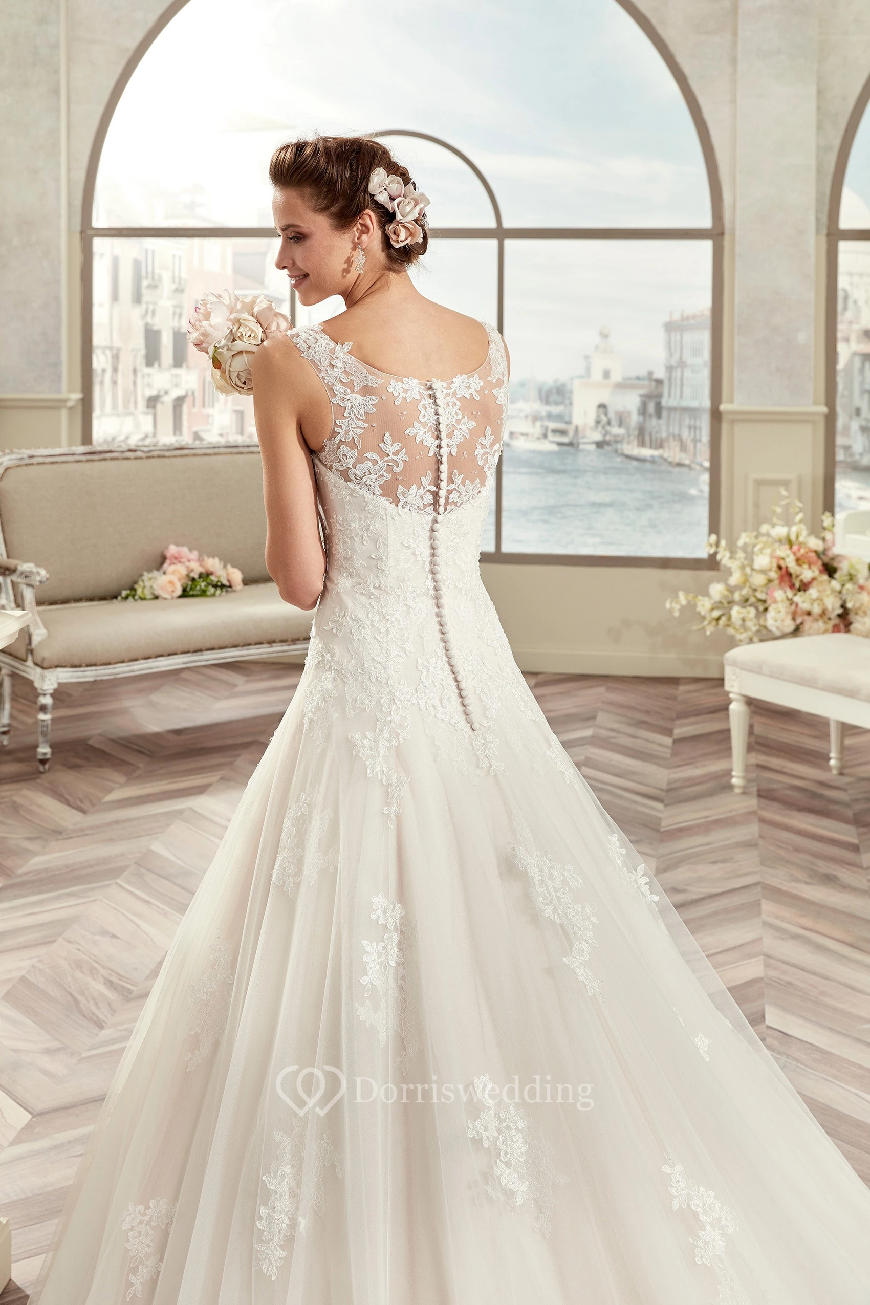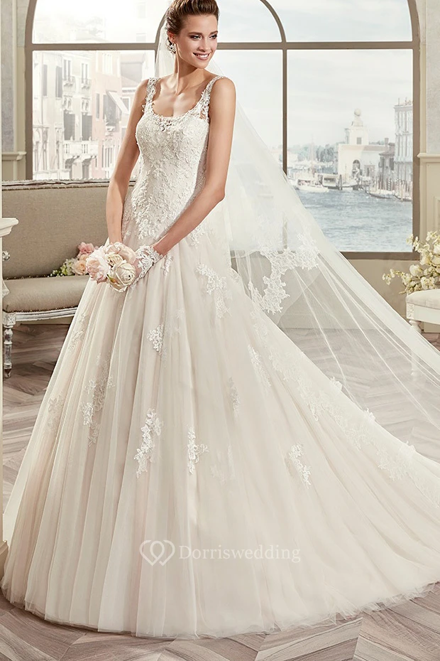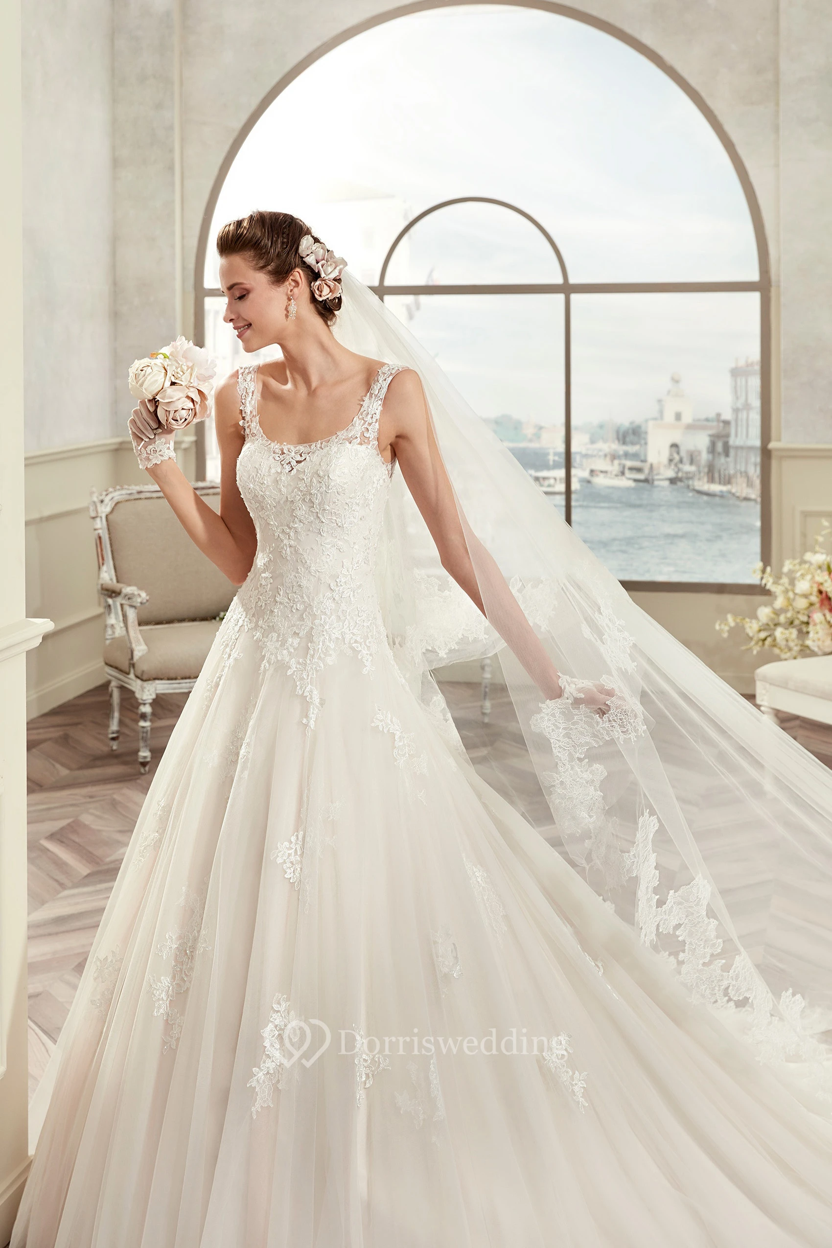 Square-Neck A-Line Lace Bridal Gown With Appliques Straps And Illusive Back