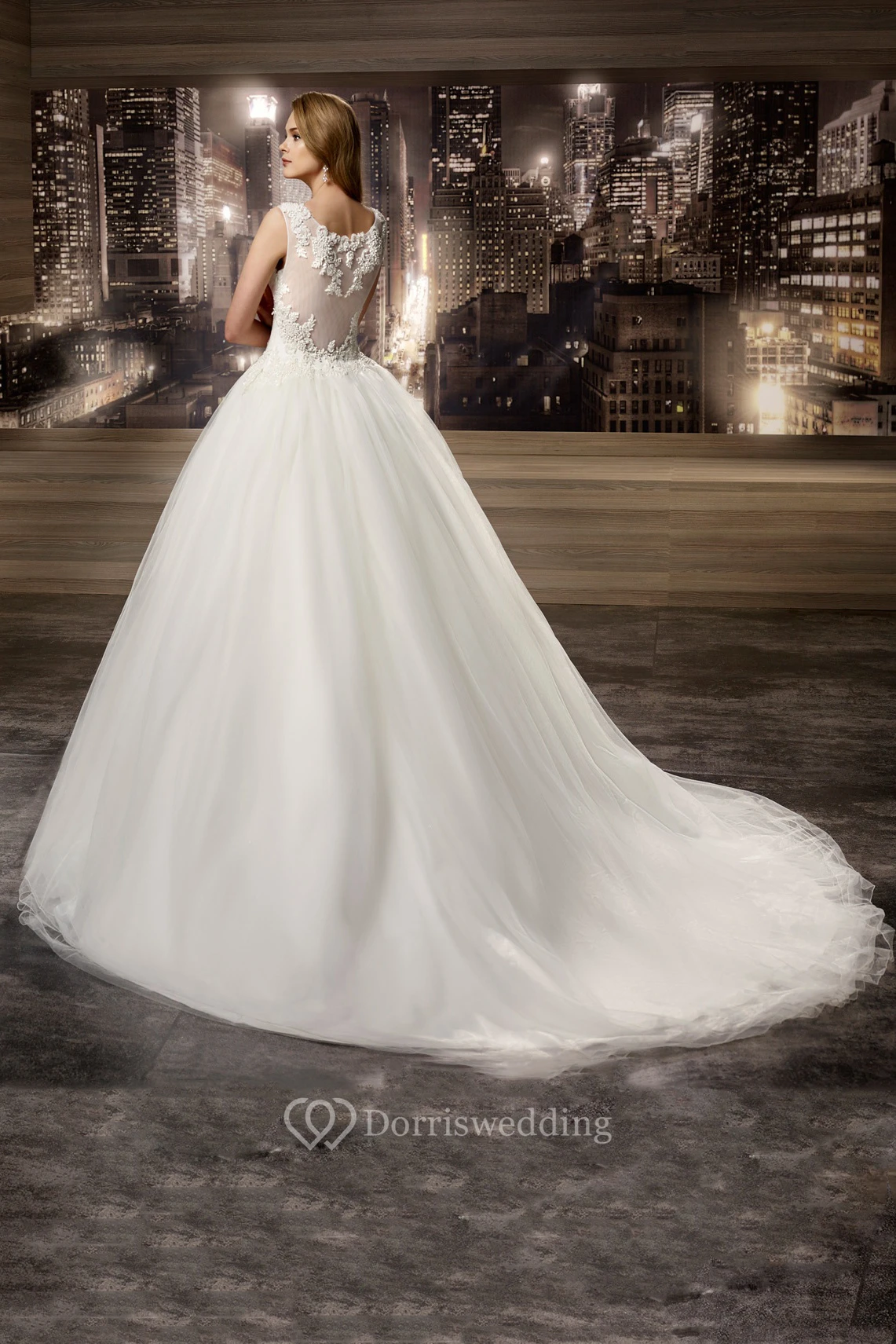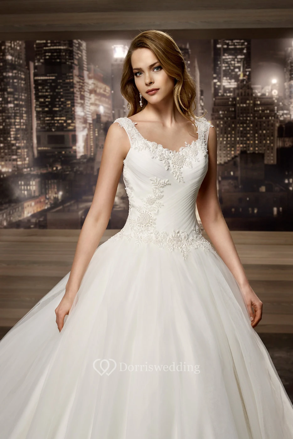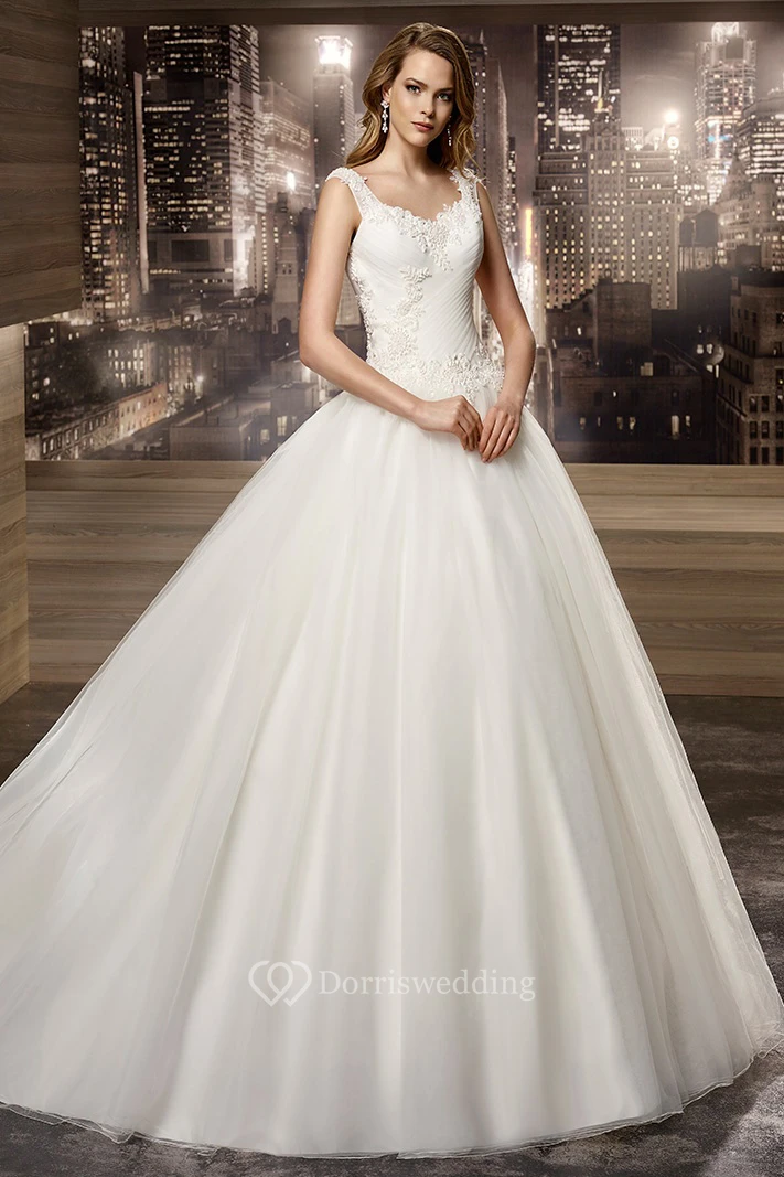Square-Neck Brush-Train A-Line Bridal Gown With Fine Appliques And Pleated Details