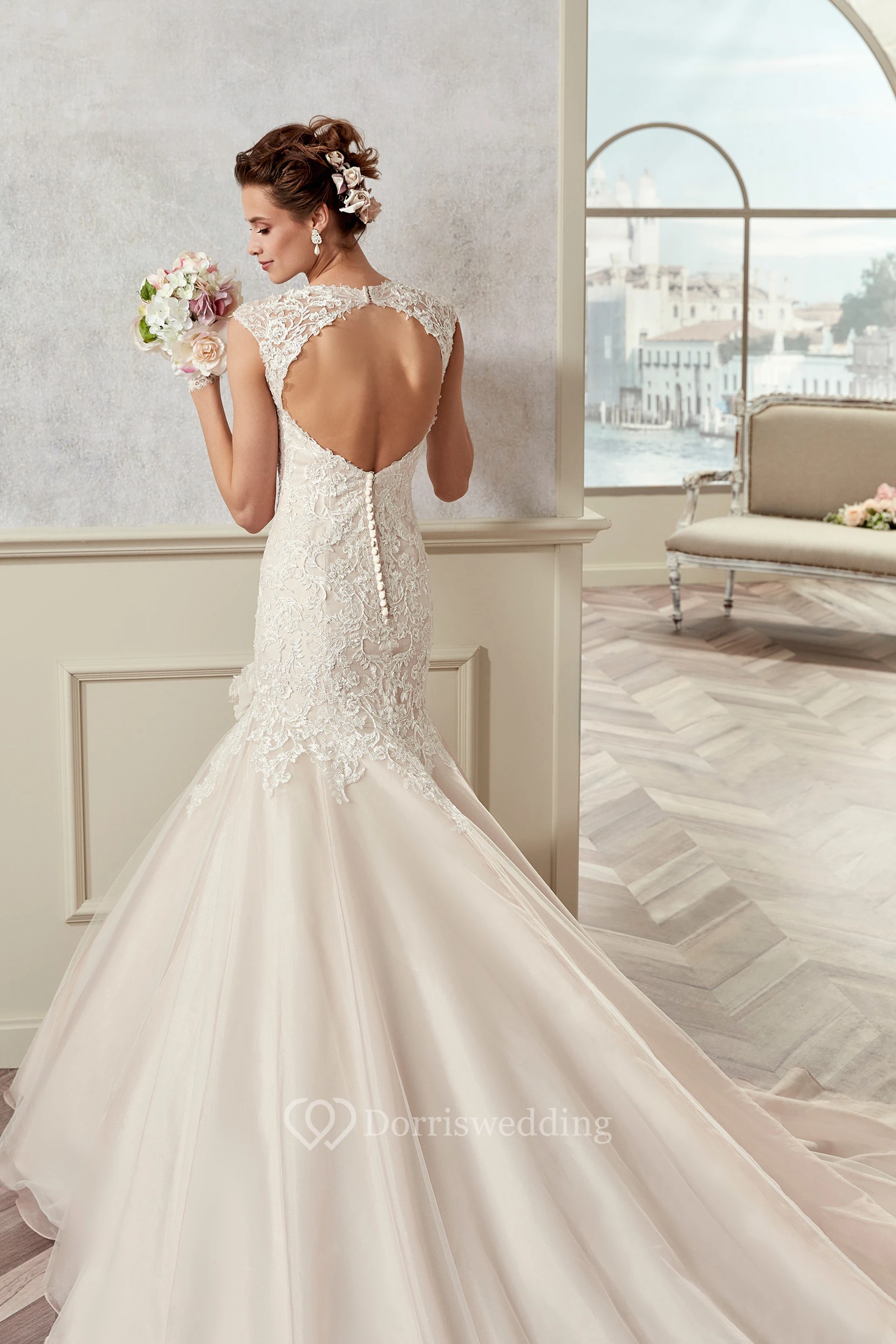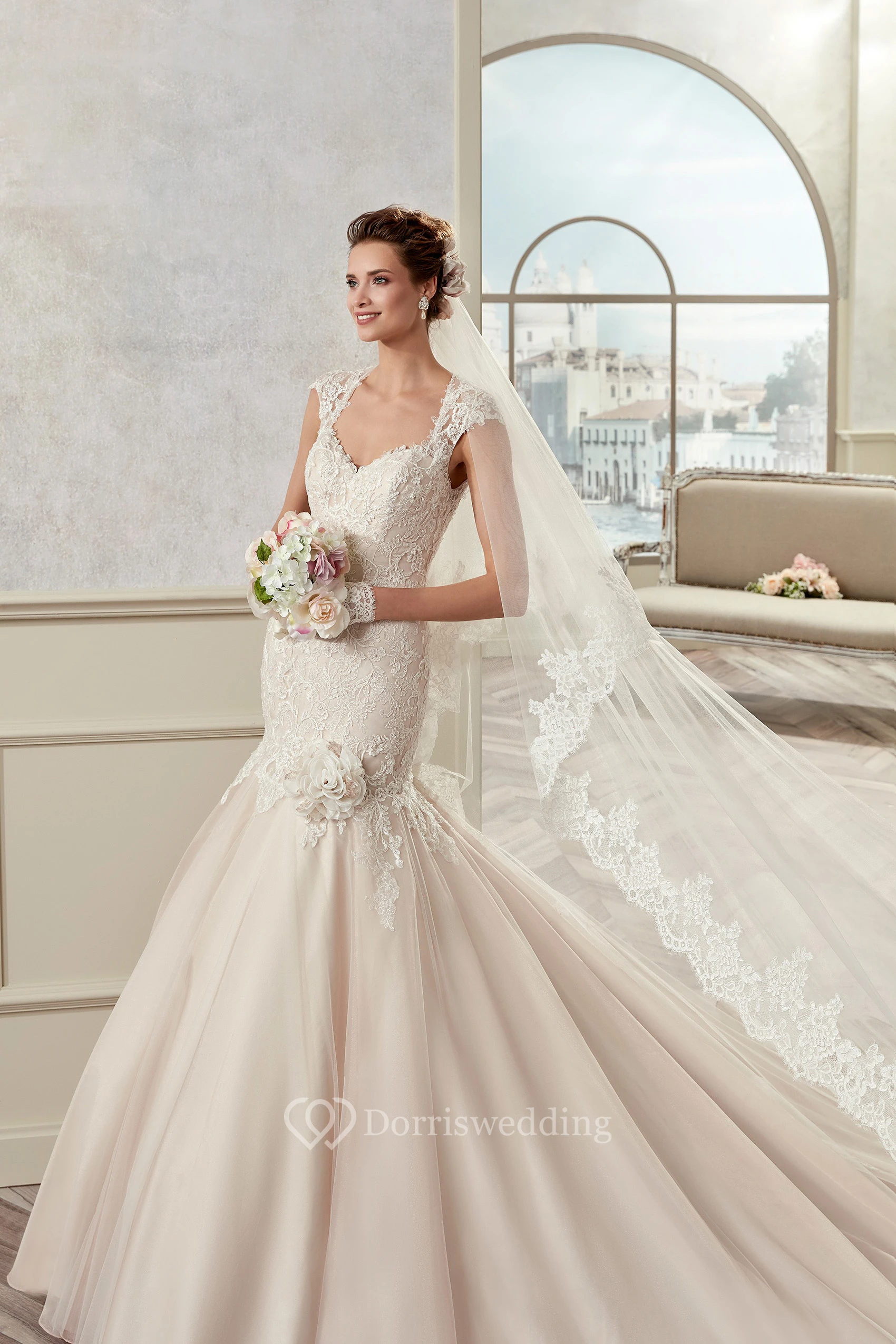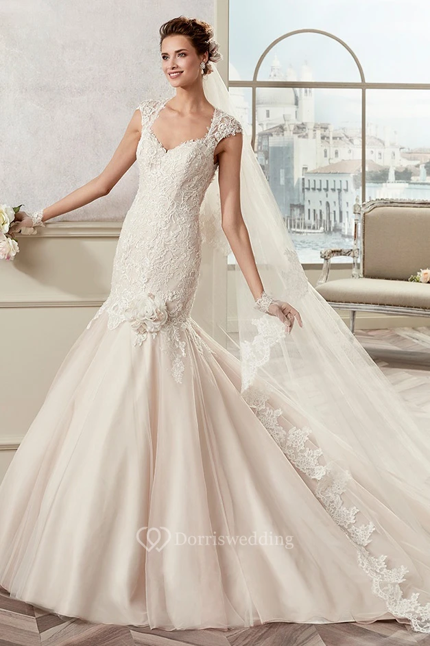 Square-Neck Cap Sleeve Mermaid Bridal Gown With Floral Decorations And Keyhole Back