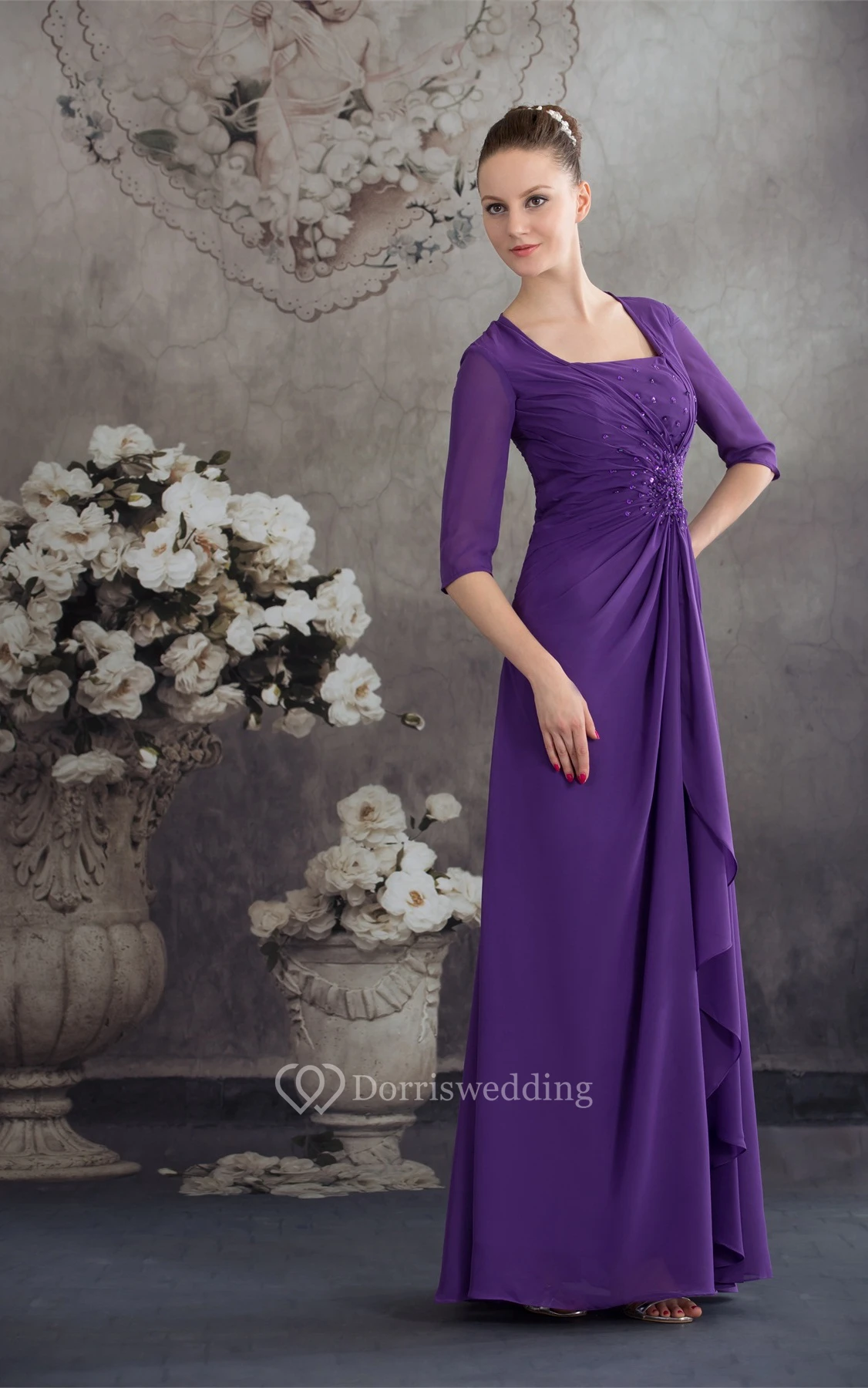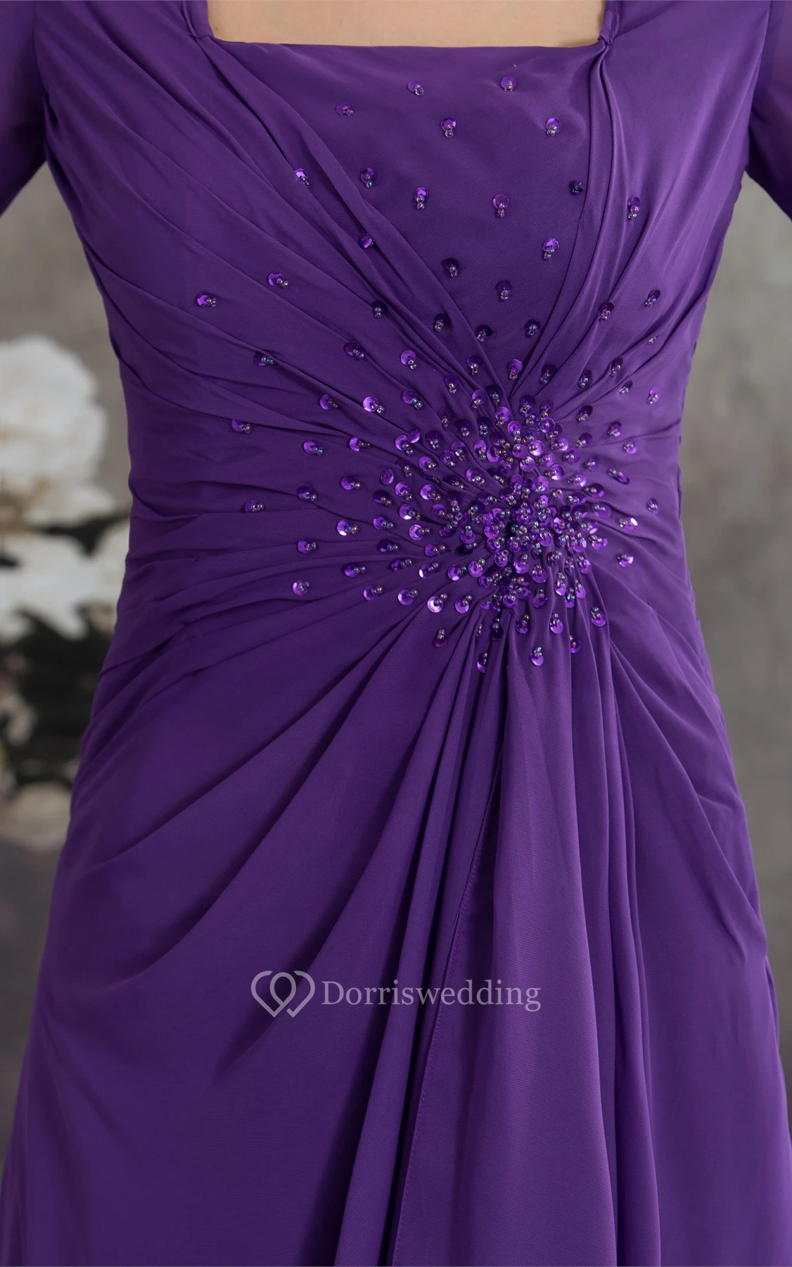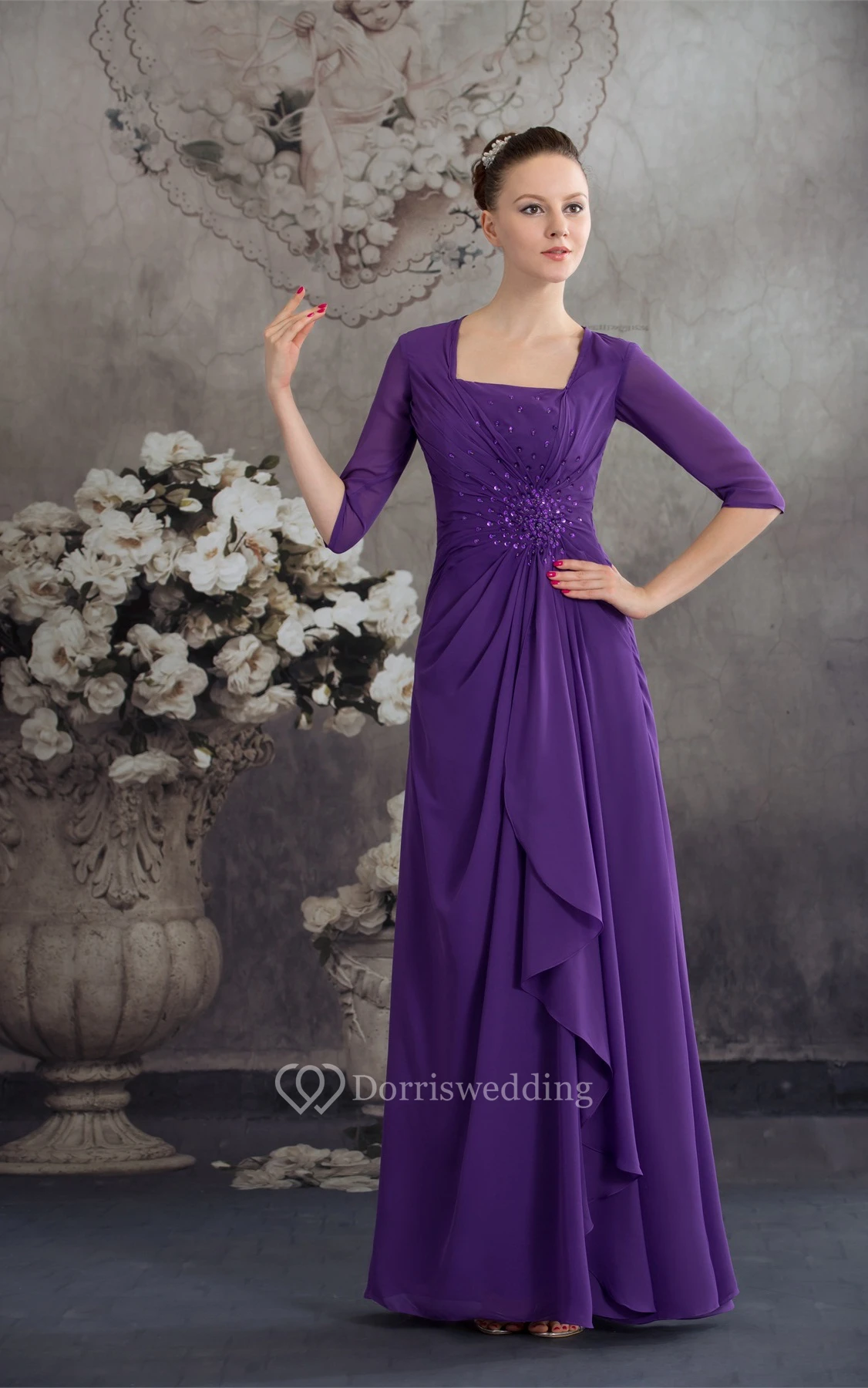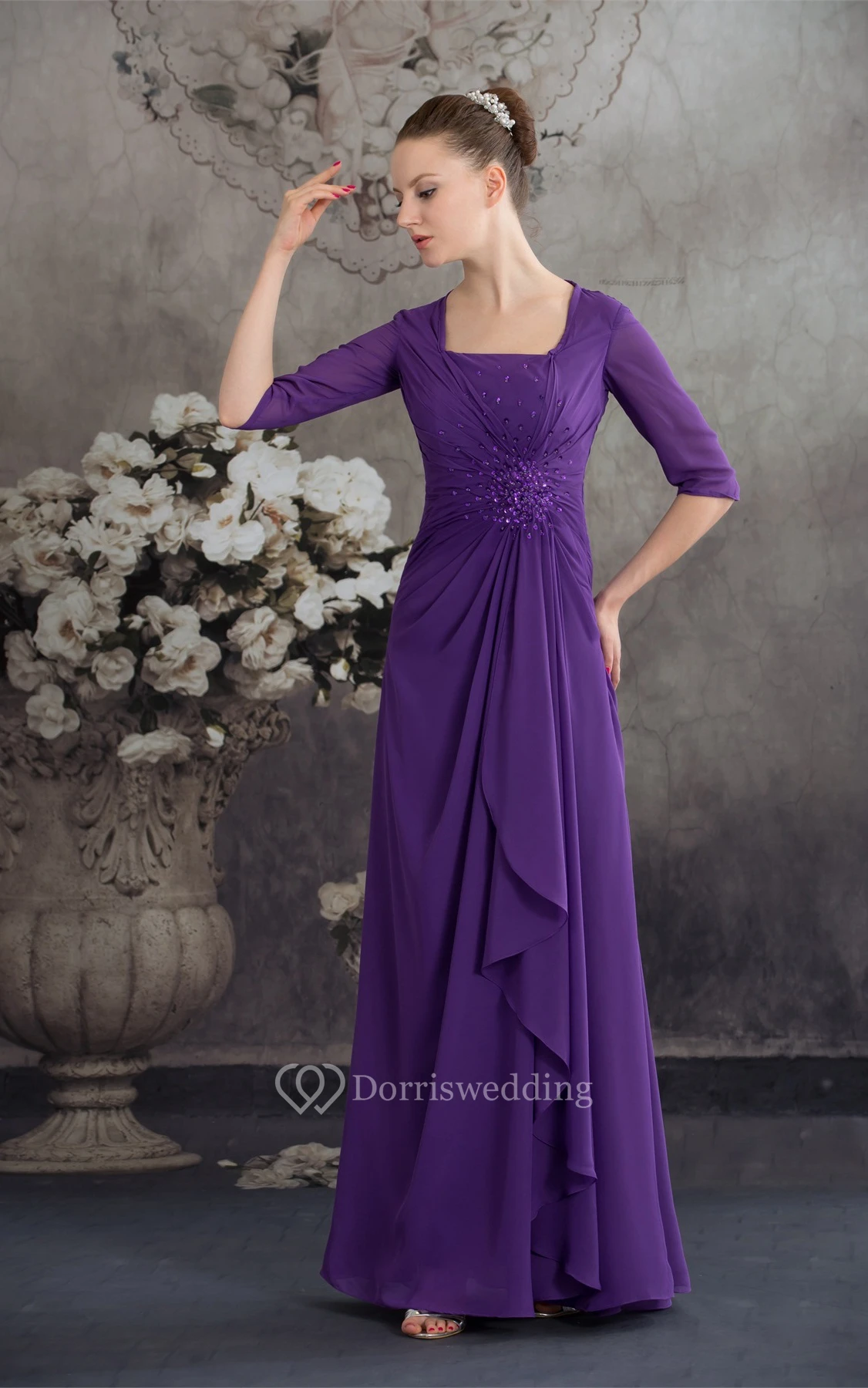 Square-Neck Chiffon Floor-Length Half-Sleeve Beading and Dress With Central Ruching