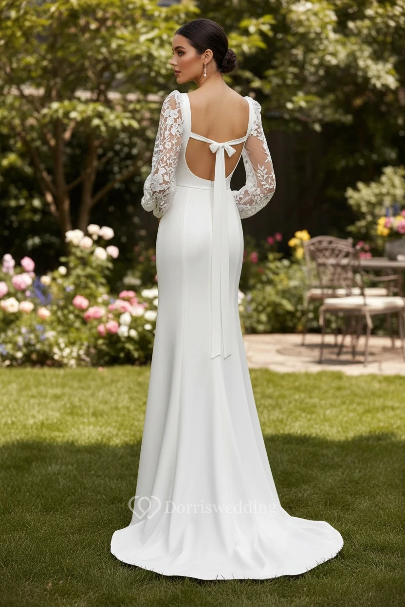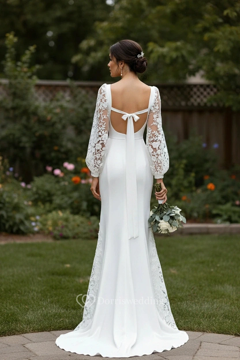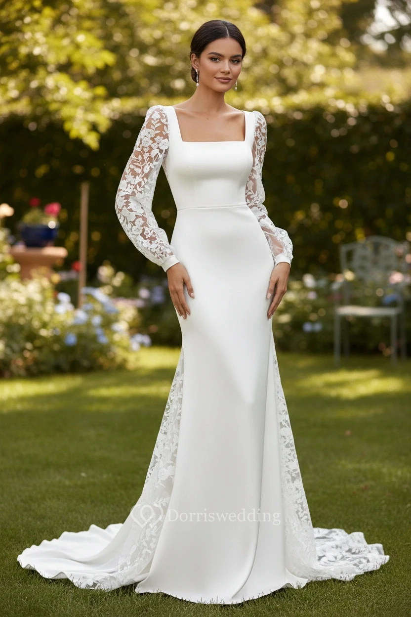 Square Neck Long Sleeve Simple Wedding Dress