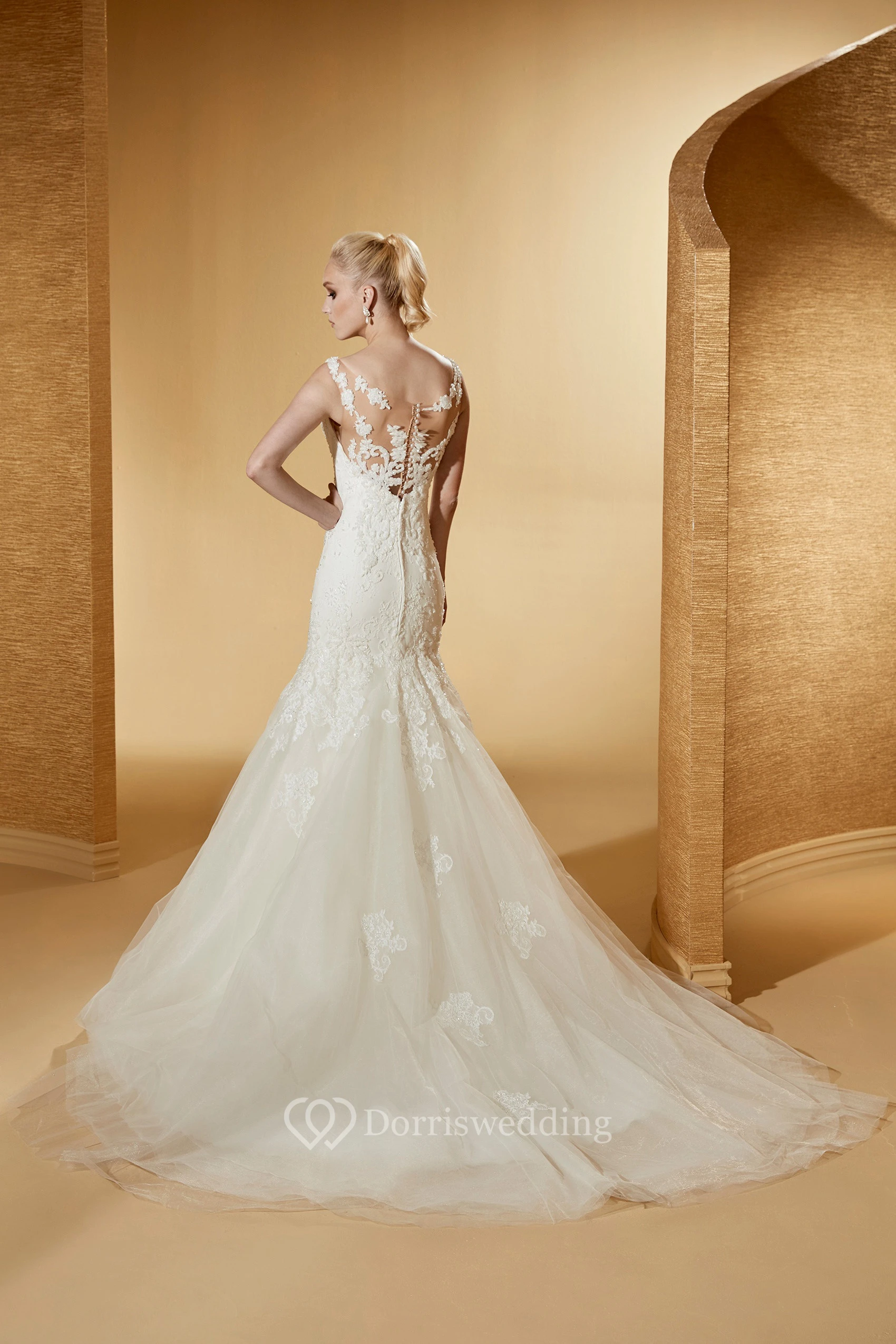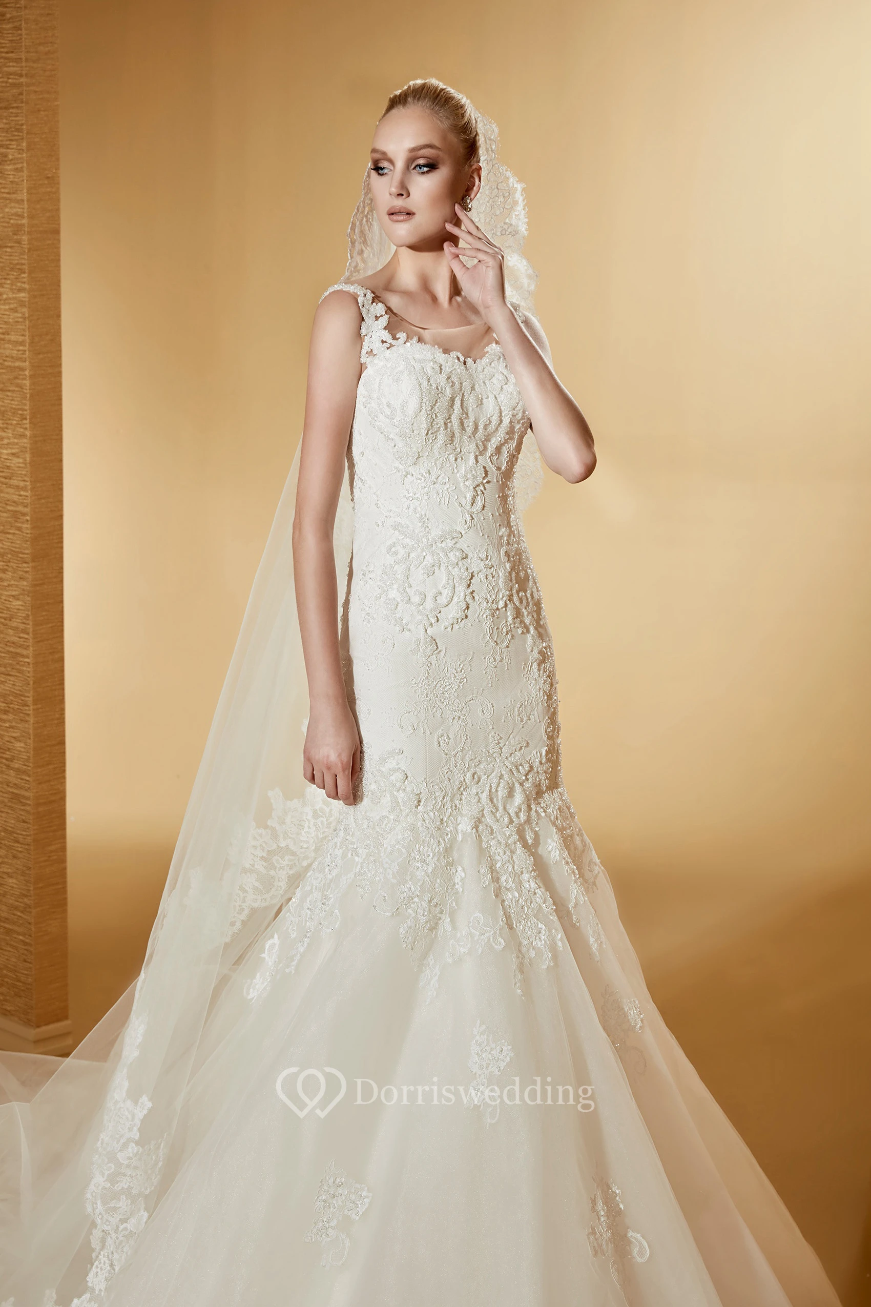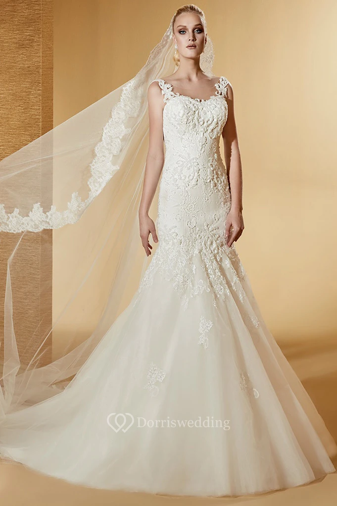 Square-Neck Mermaid Lace Long Wedding Dress With Exquisite Appliques And Brush Train