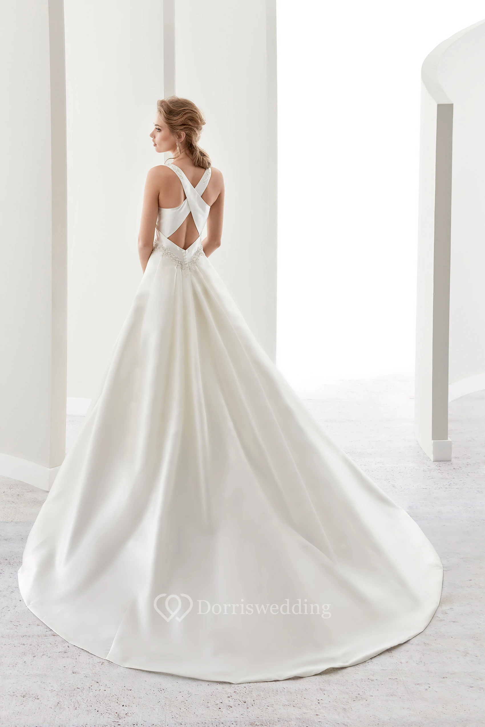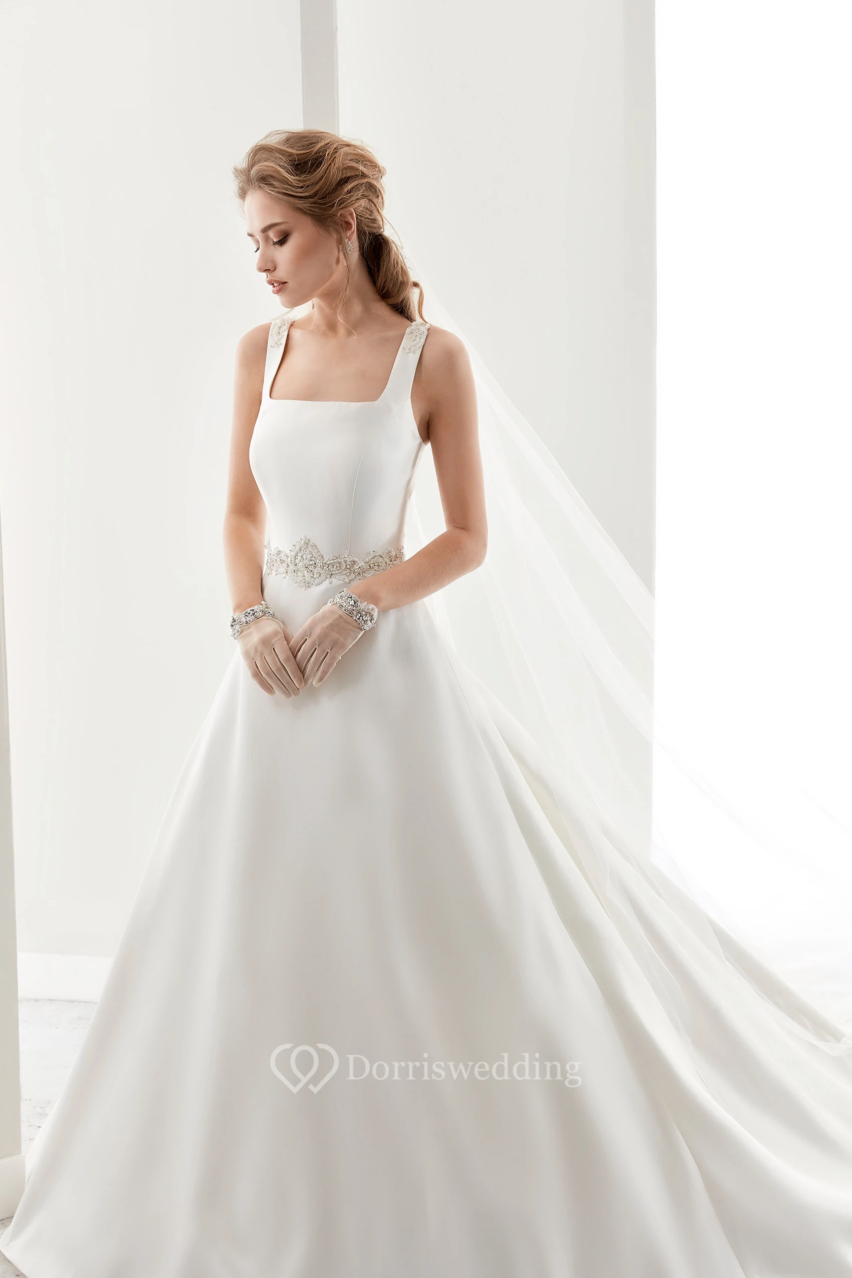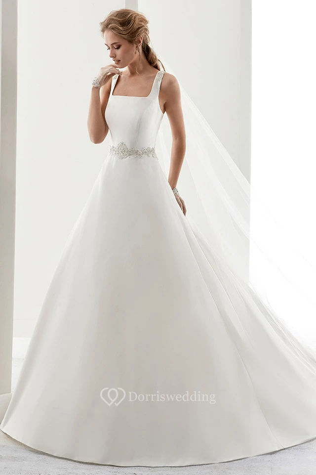 Square-Neck Satin A-Line Bridal Gown With Beaded Belt And Crisscross Straps Back