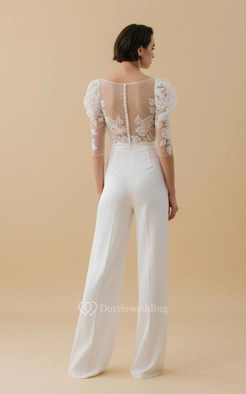 Square Neck Short Sleeve Lace Trim High Waist Wedding Jumpsuit