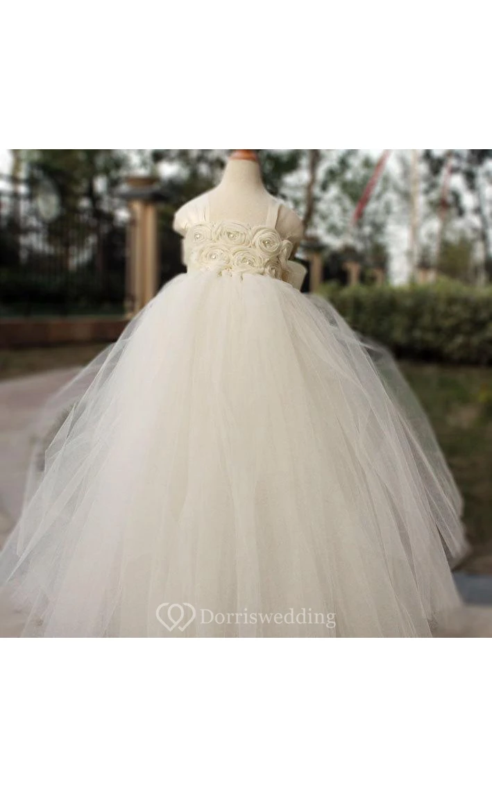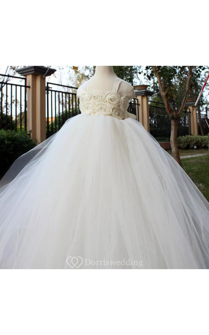 Square Neckline Cap Sleeve Empire Tulle Ball Gown With Flowers