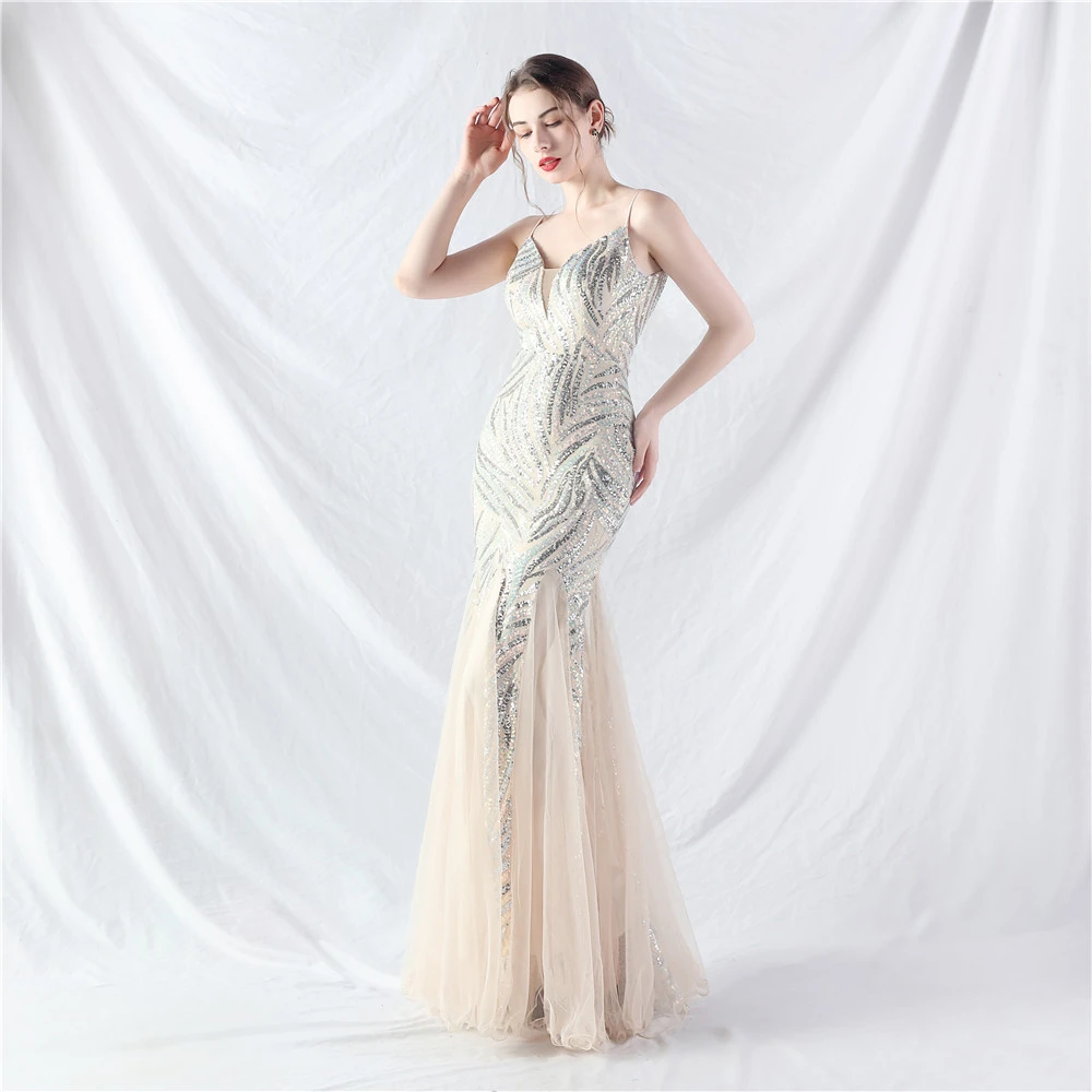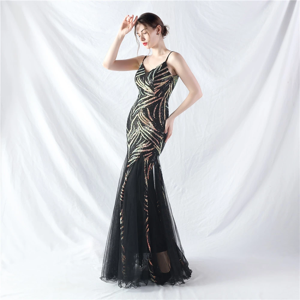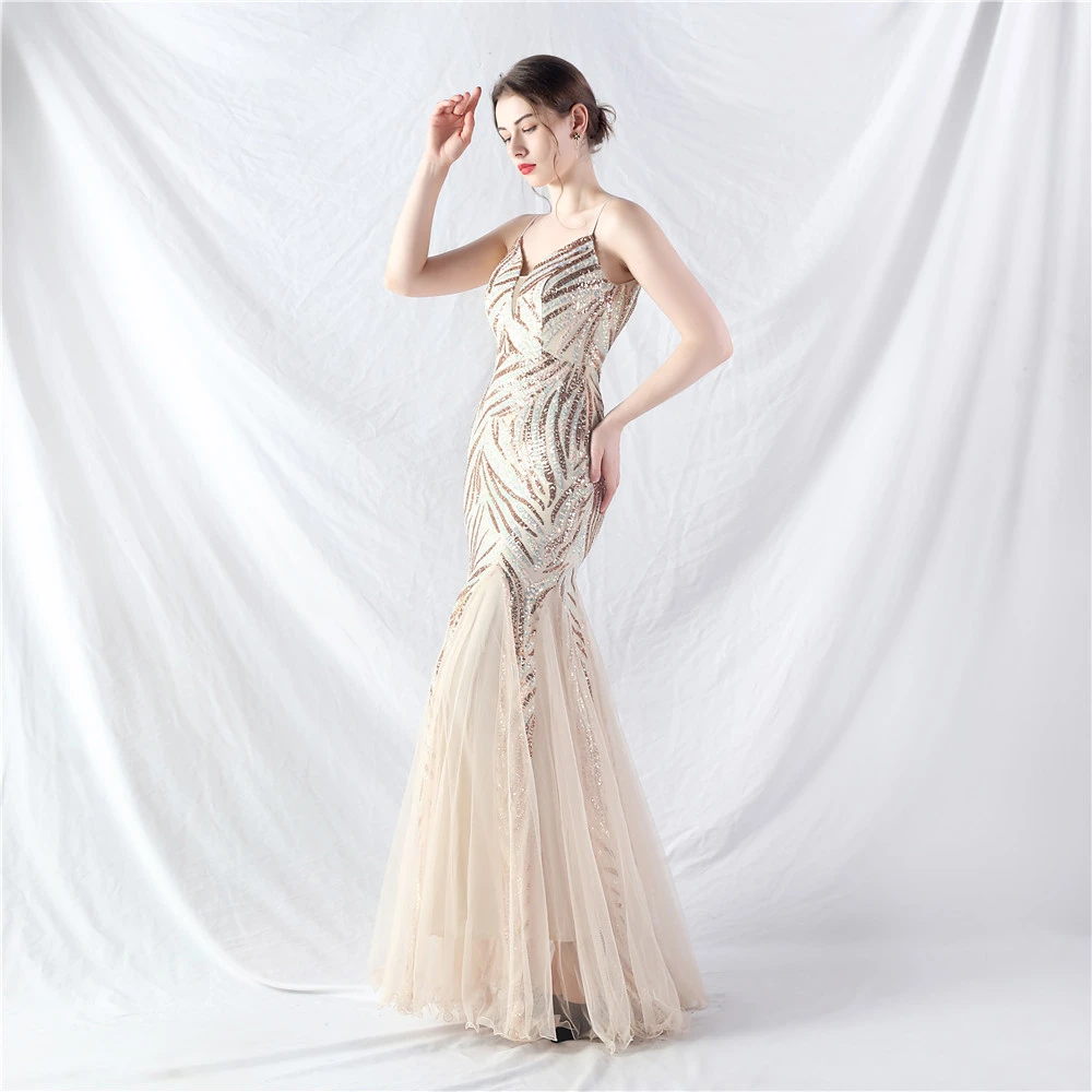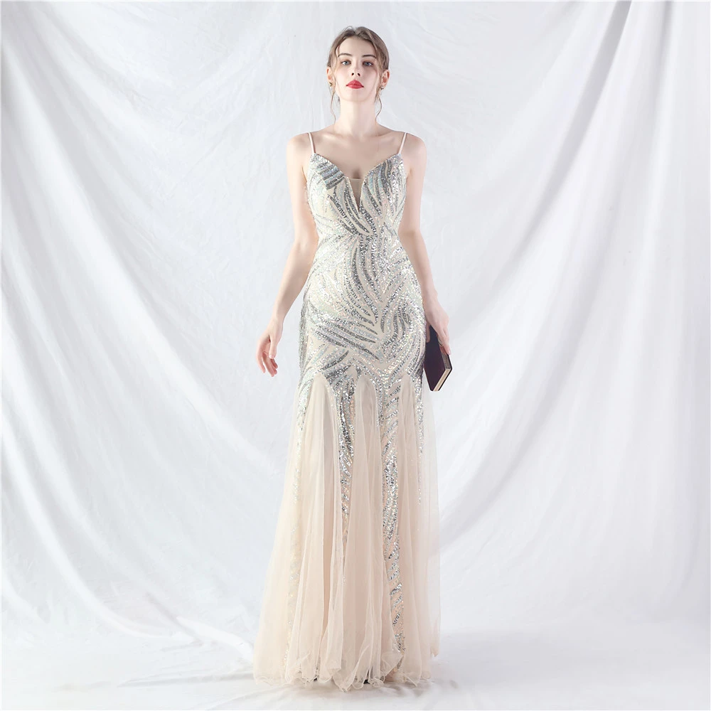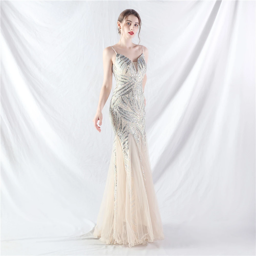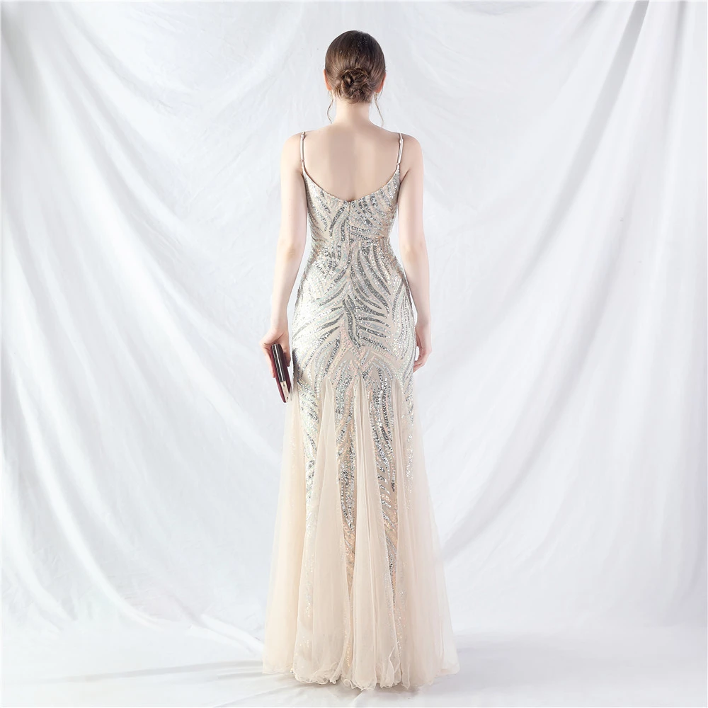 Stacked Sequins Splicing Mesh Gauze Sling Evening Dress