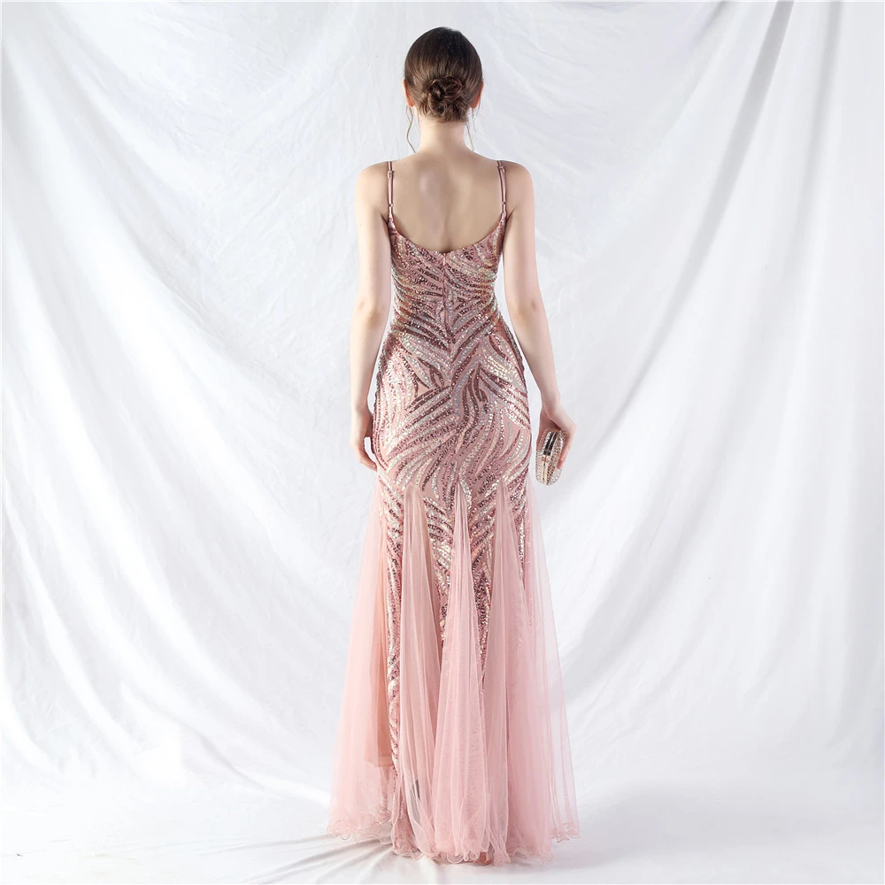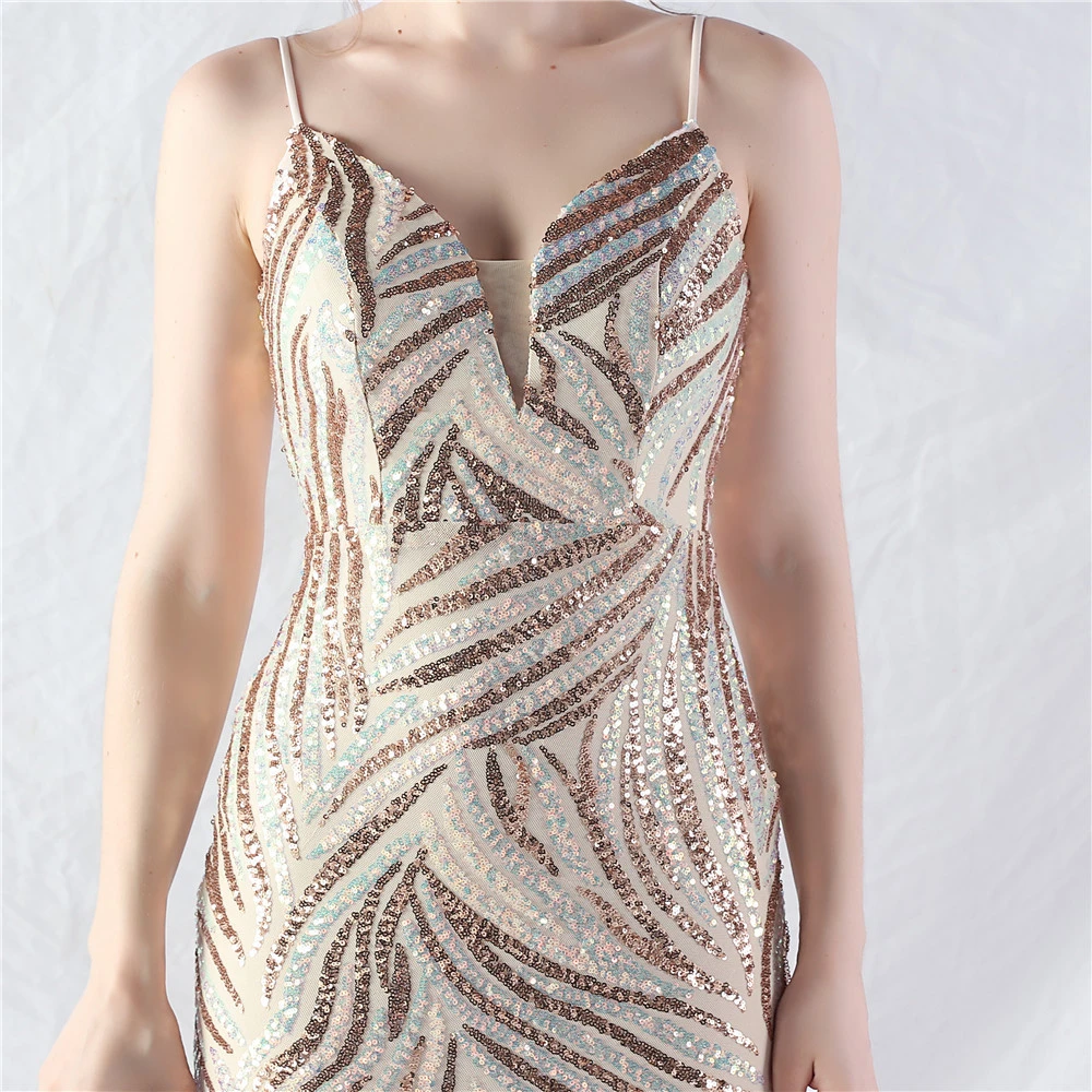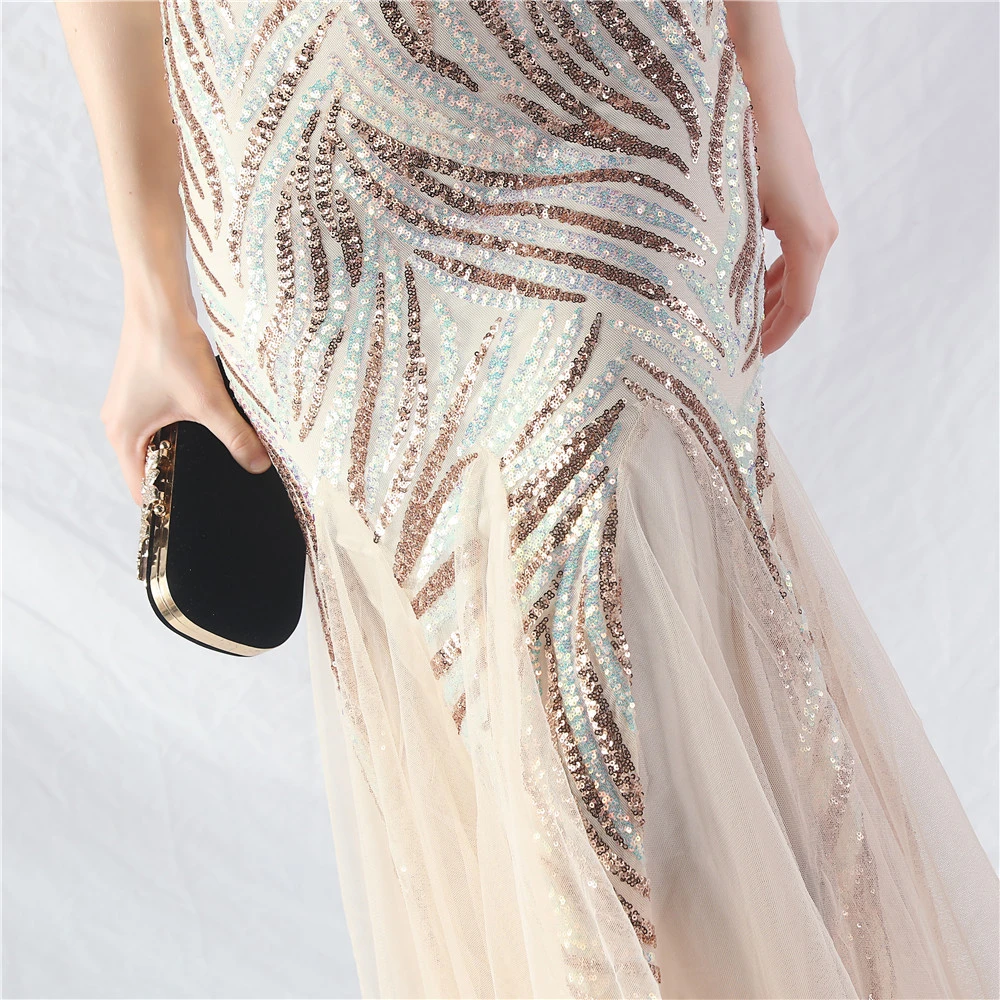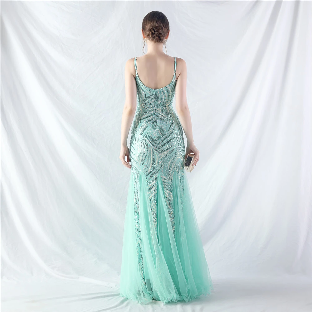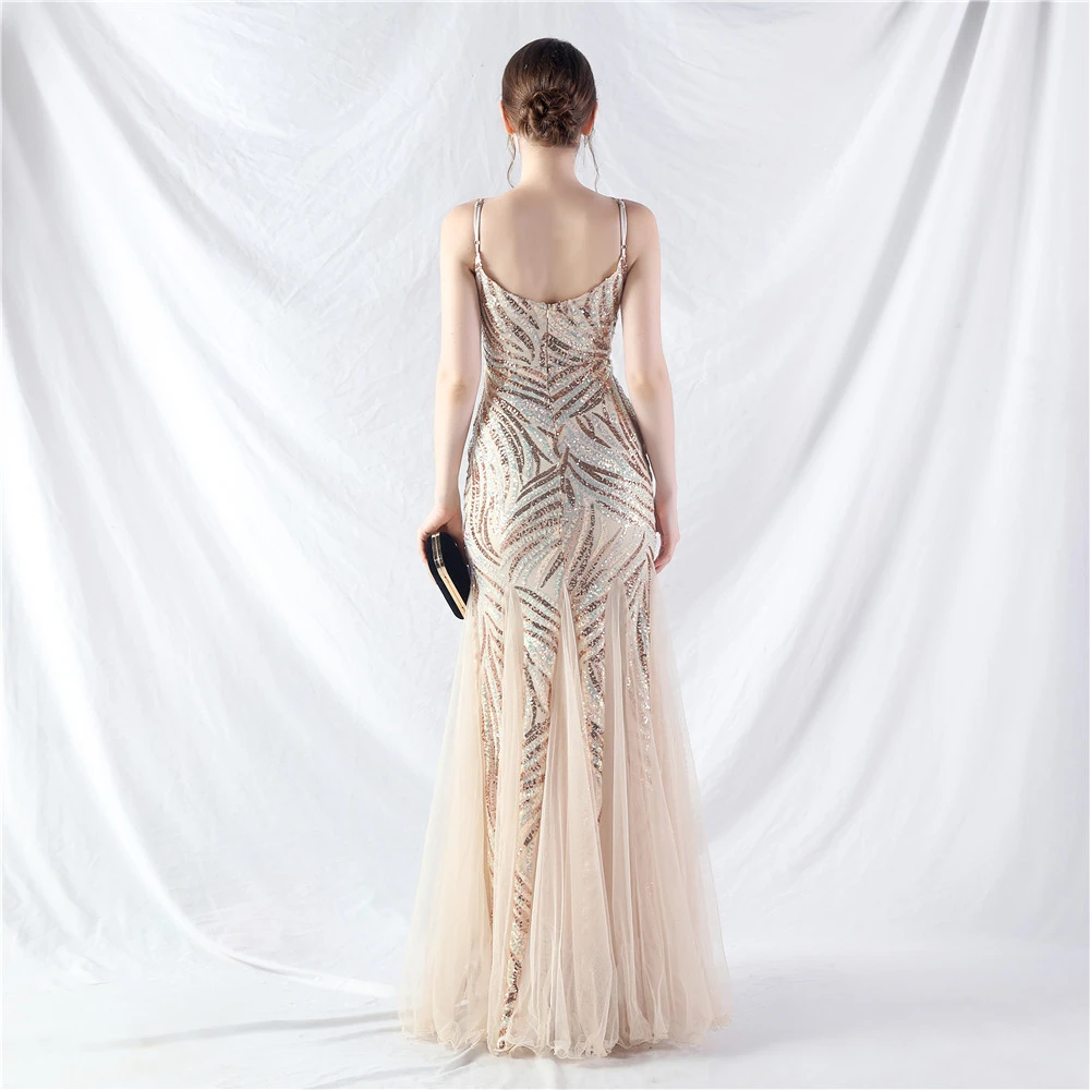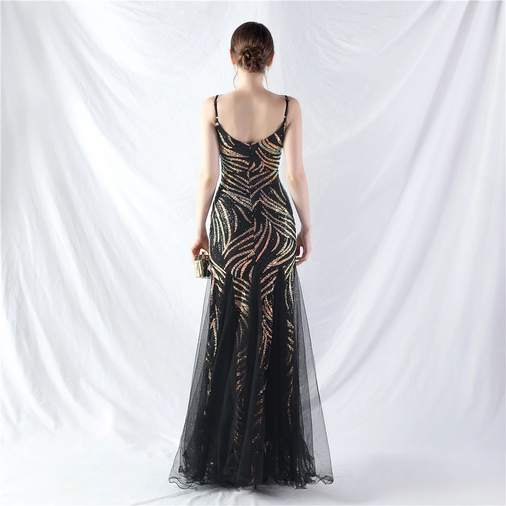 Stacked Sequins Splicing Mesh Gauze Sling Evening Dress