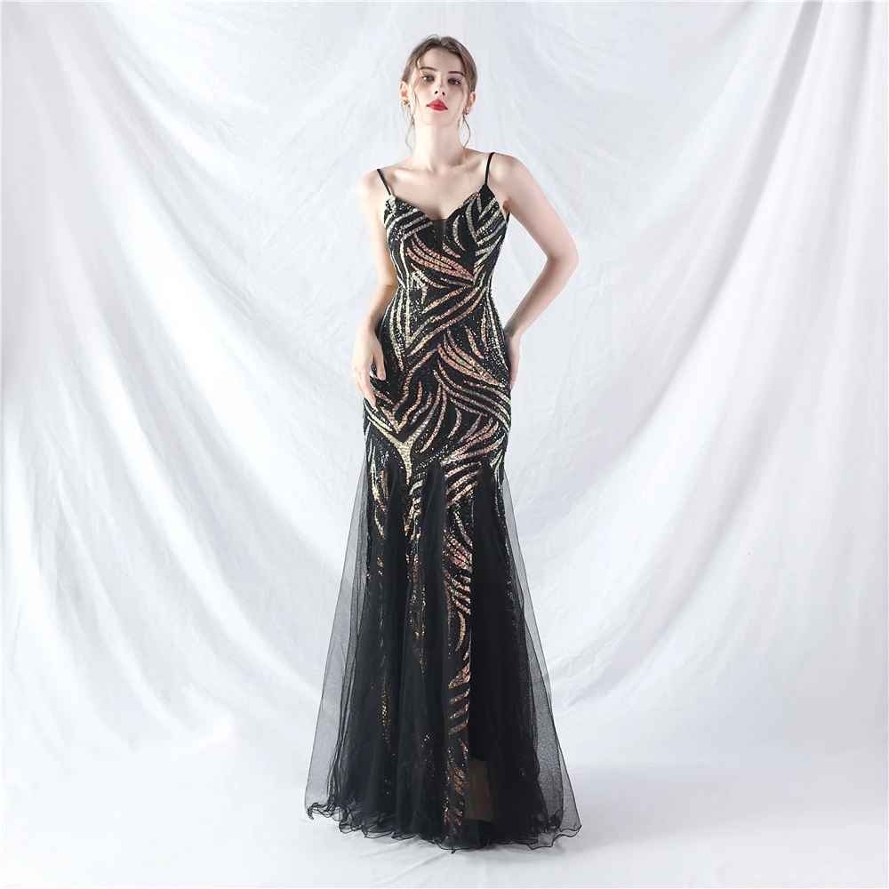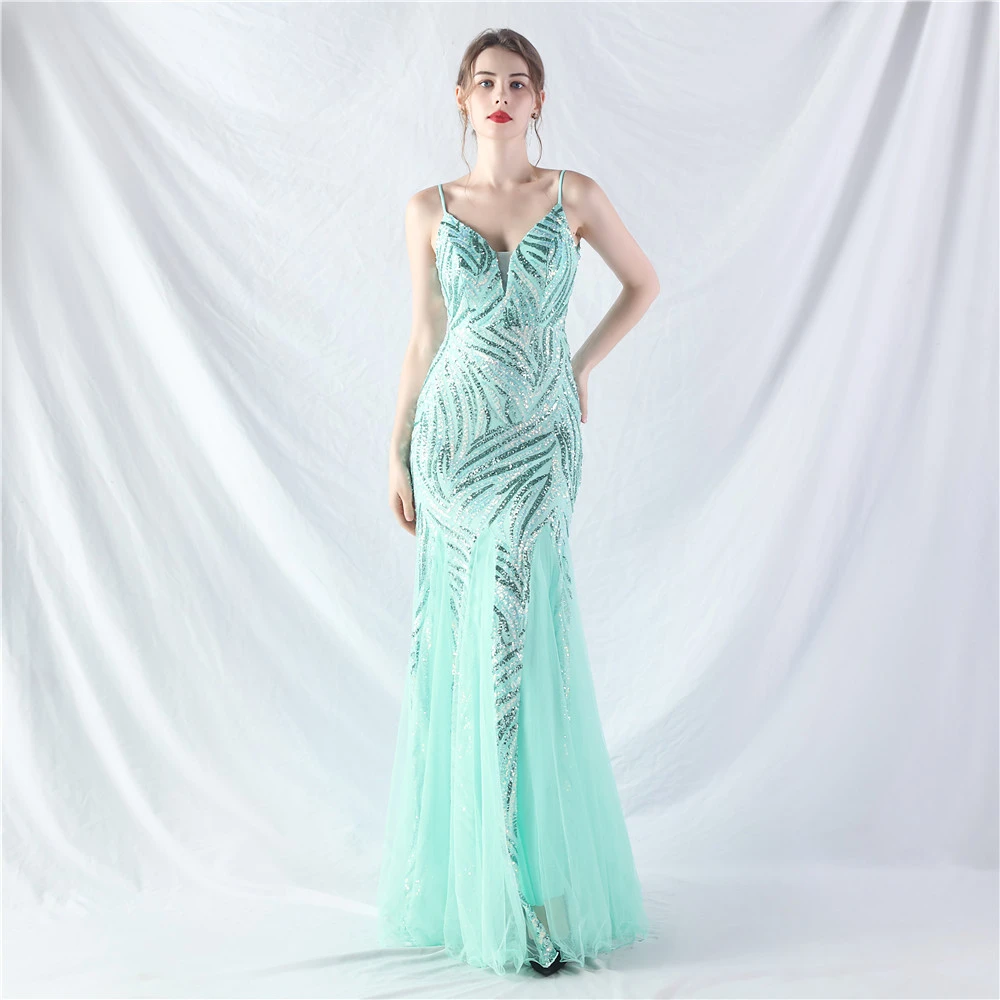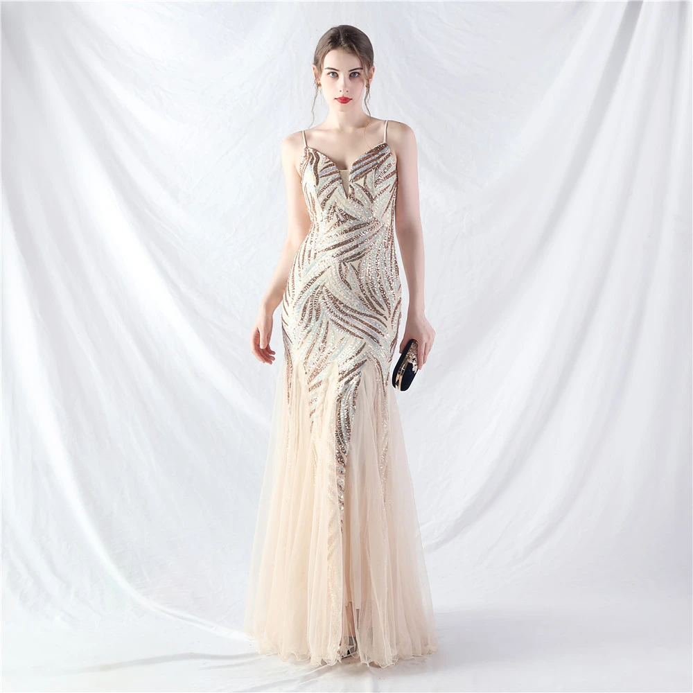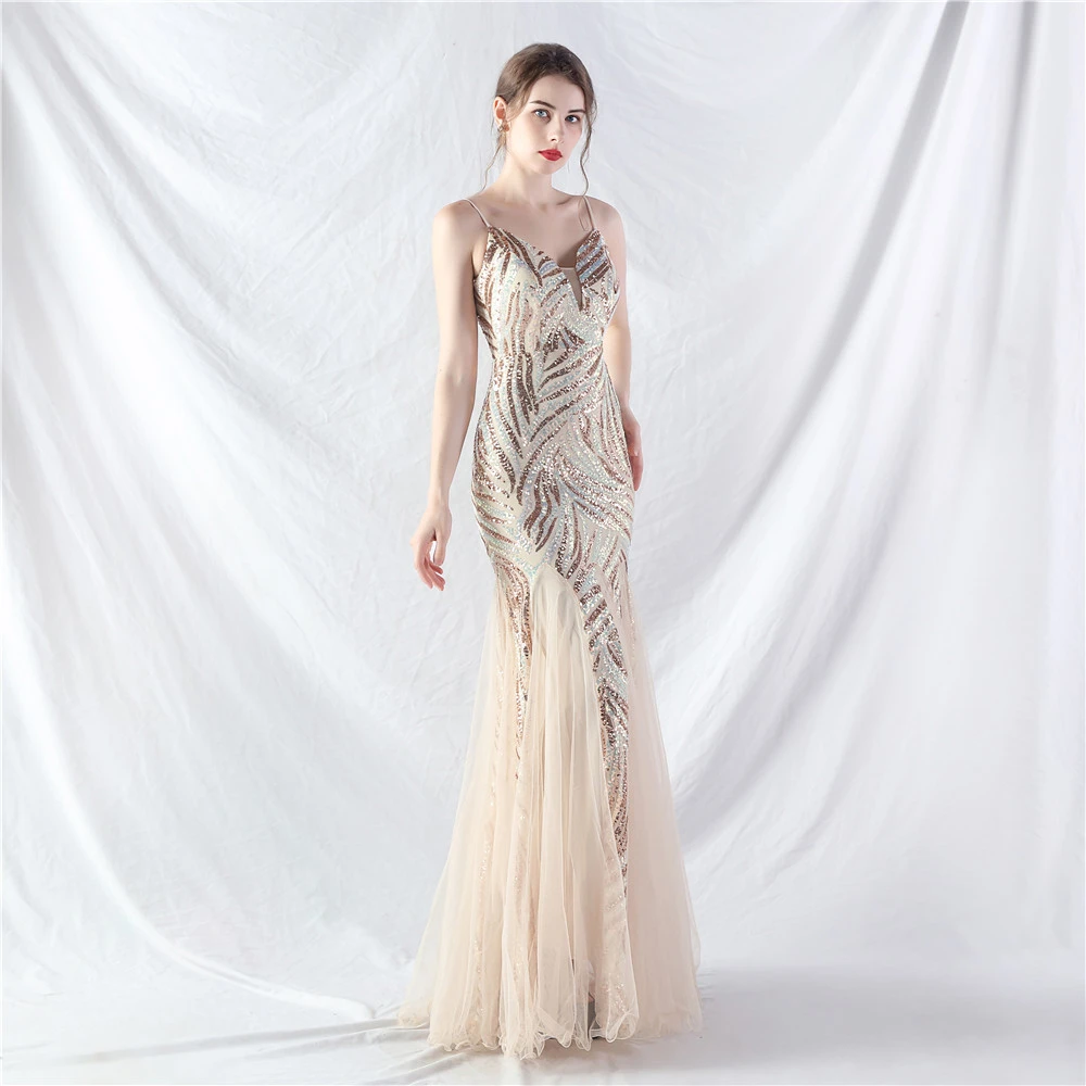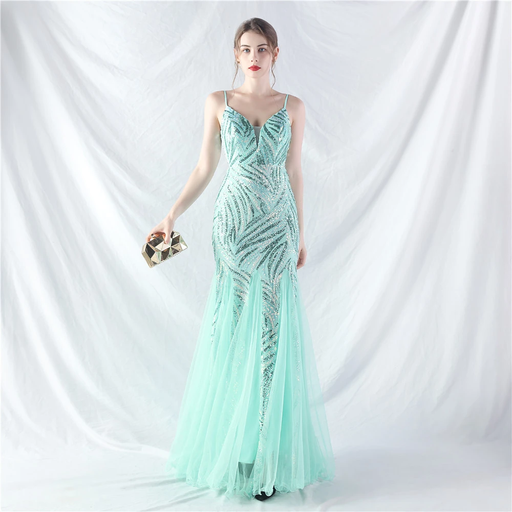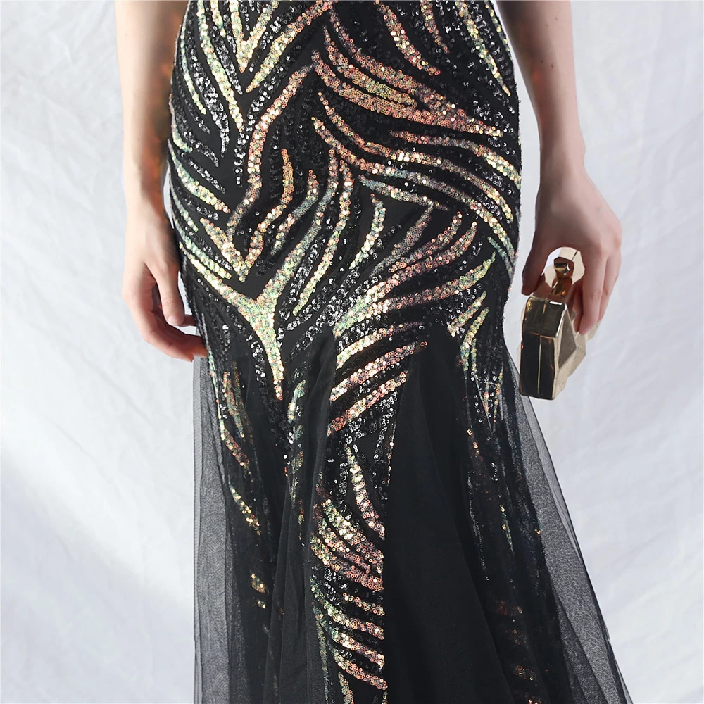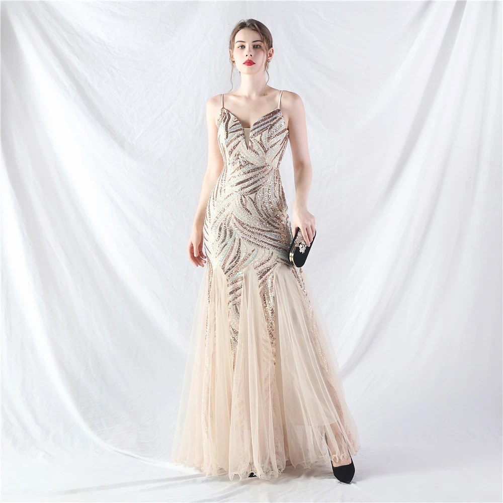 Stacked Sequins Splicing Mesh Gauze Sling Evening Dress