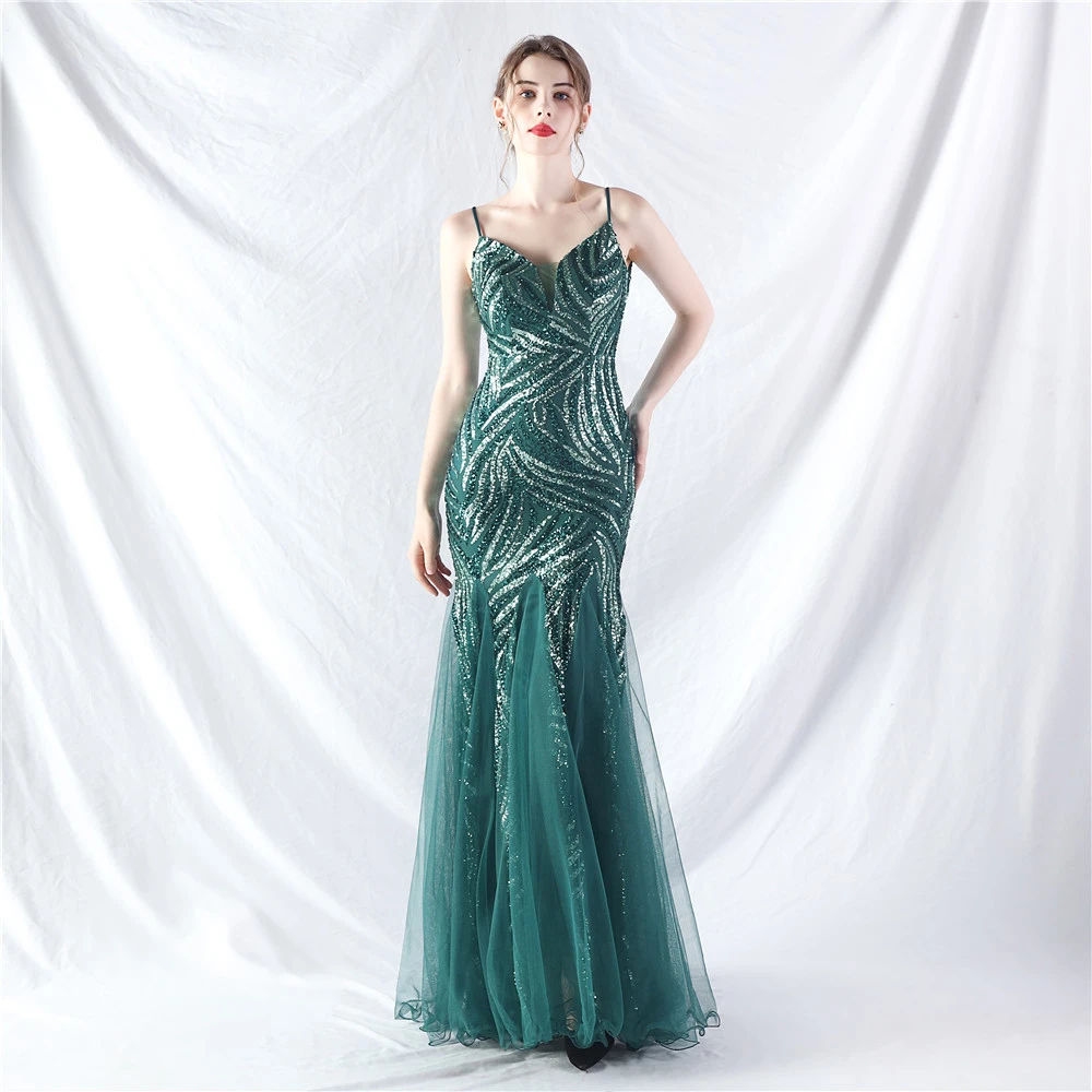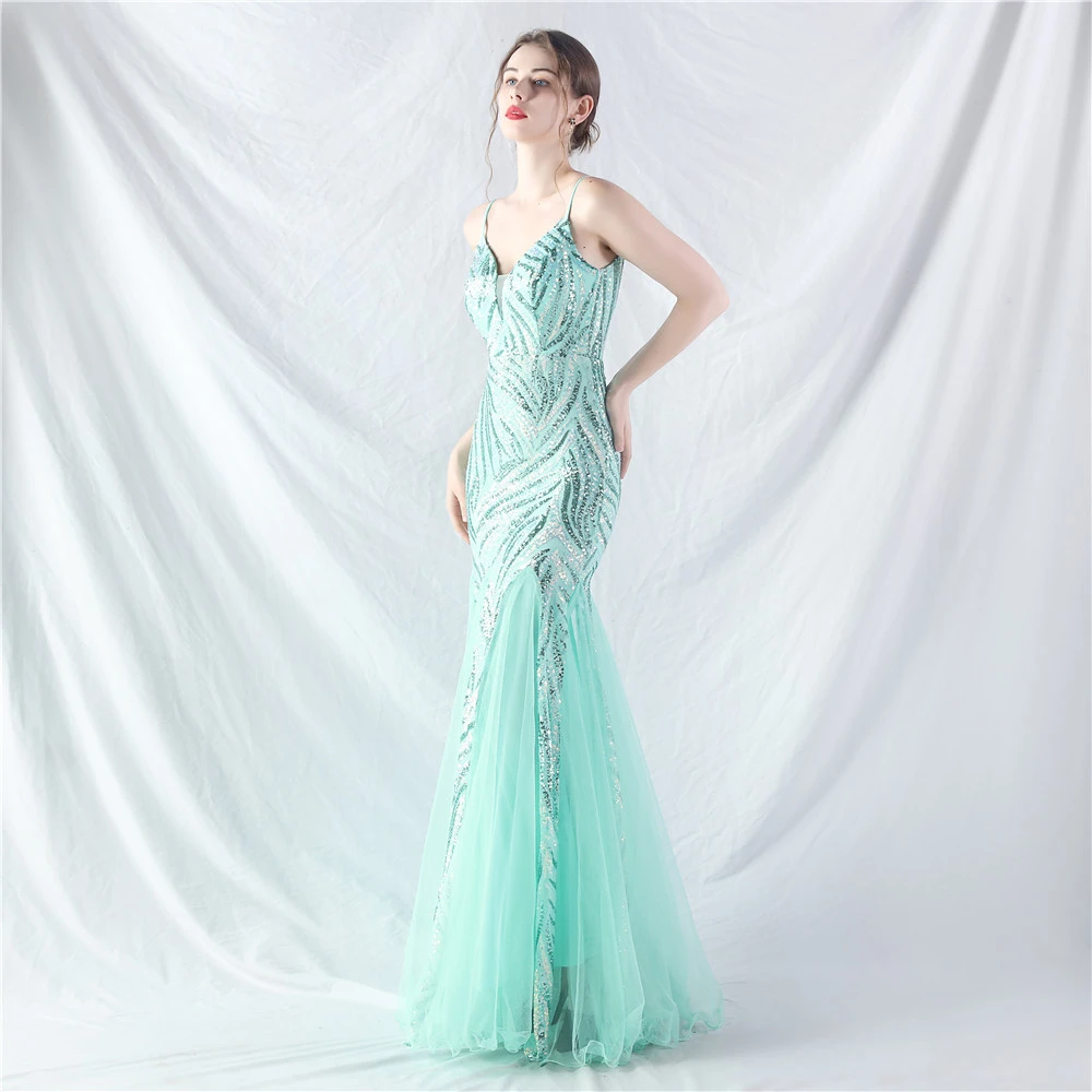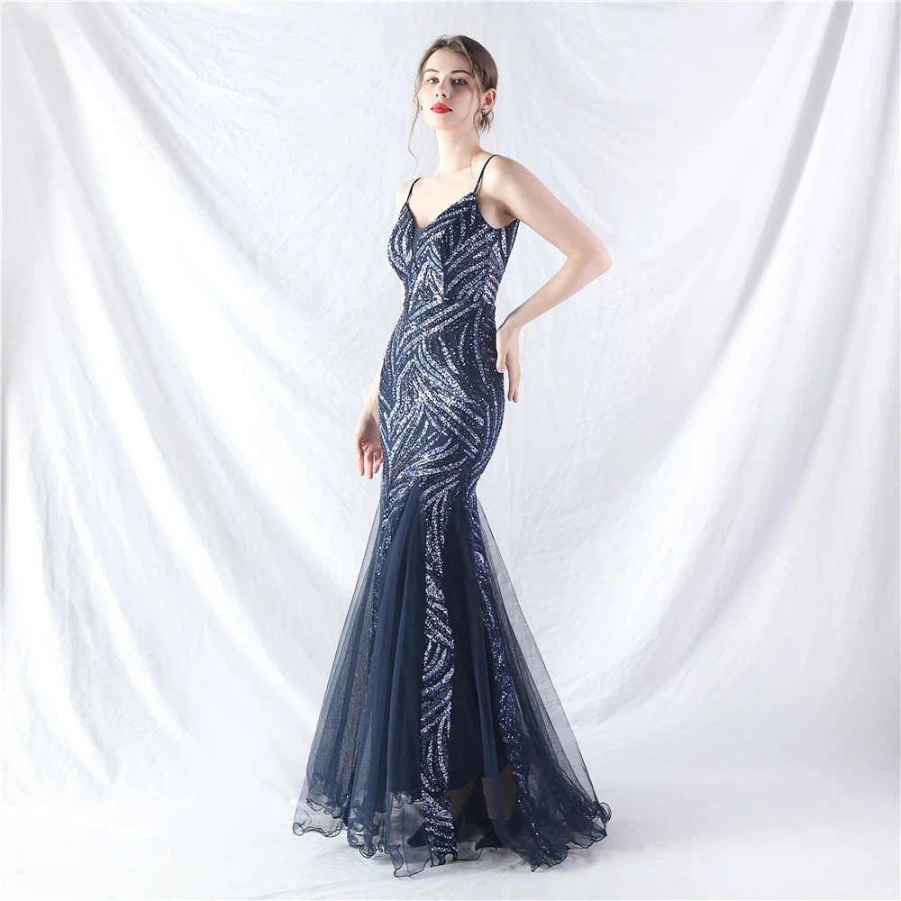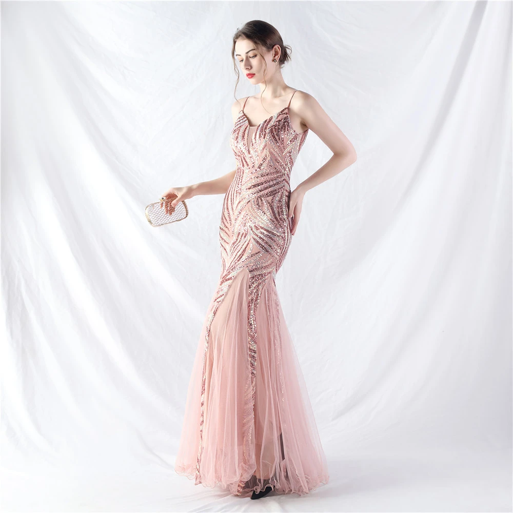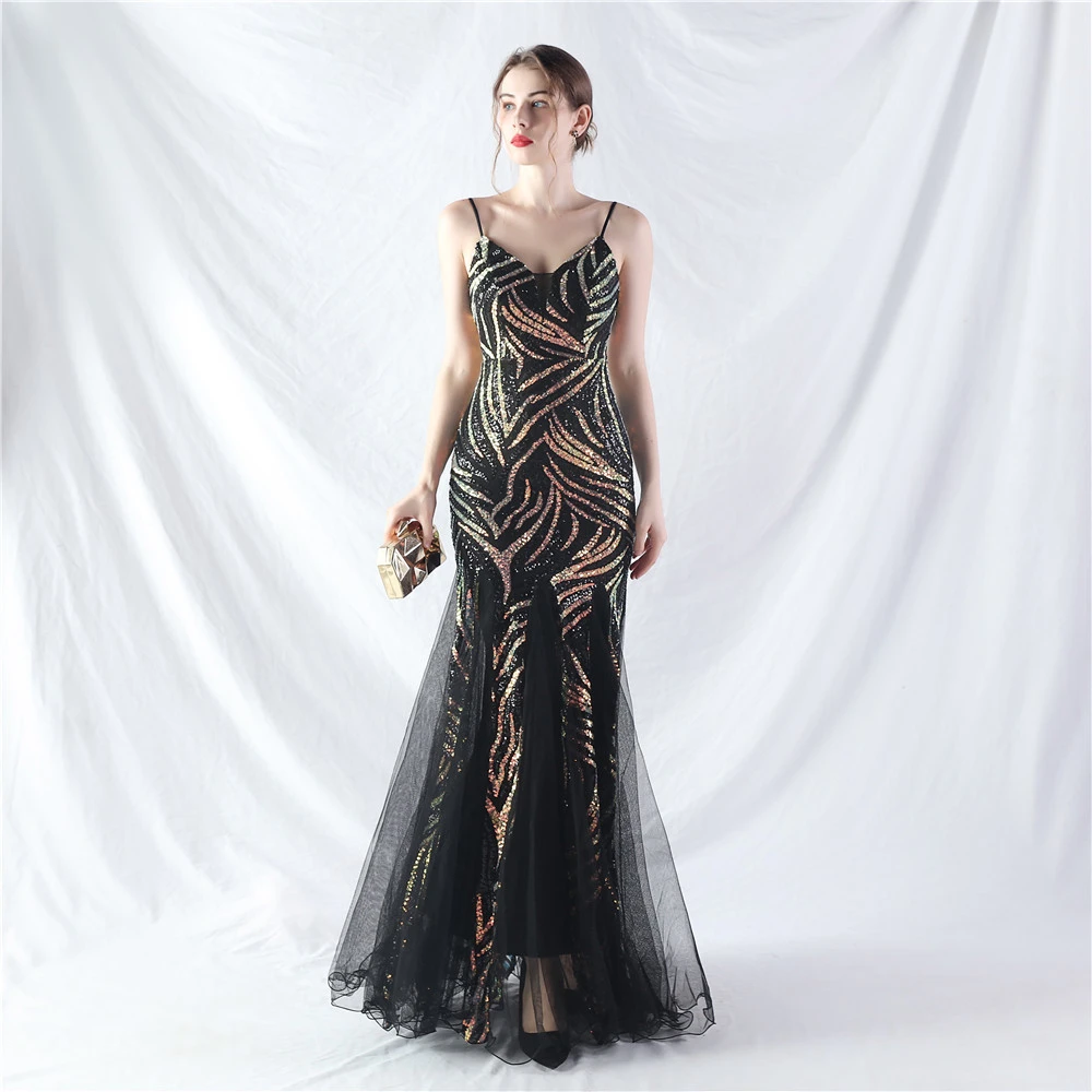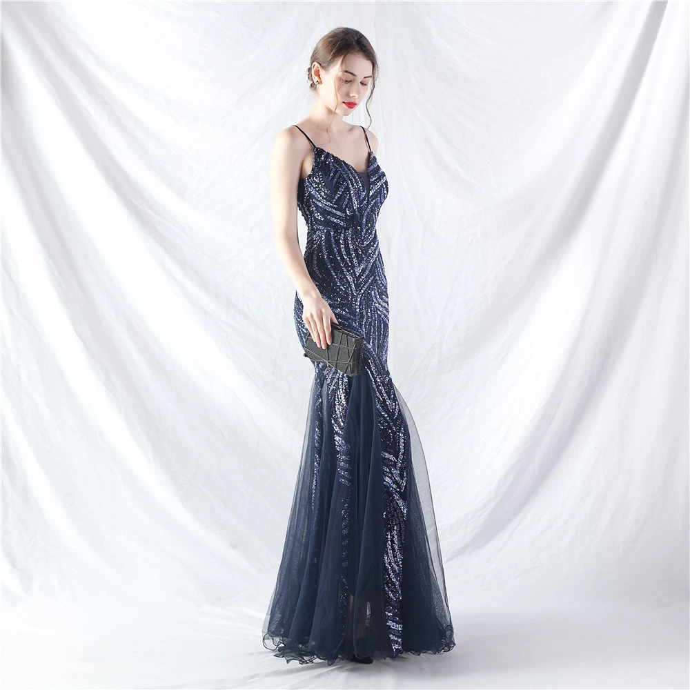 Stacked Sequins Splicing Mesh Gauze Sling Evening Dress