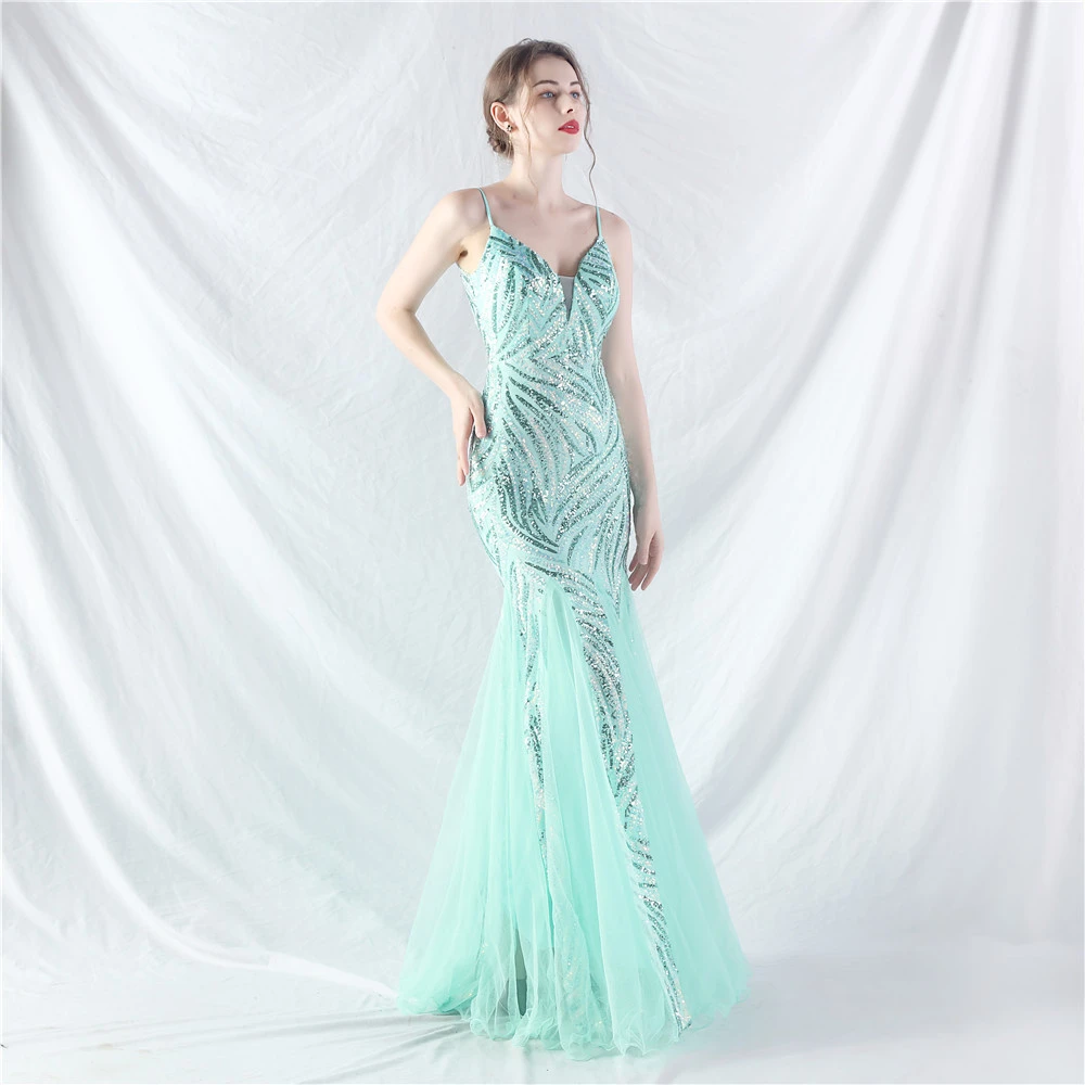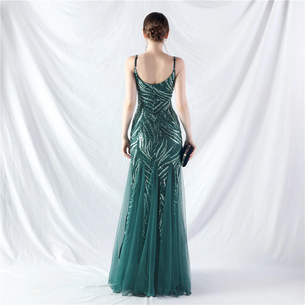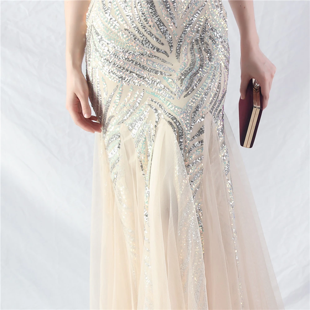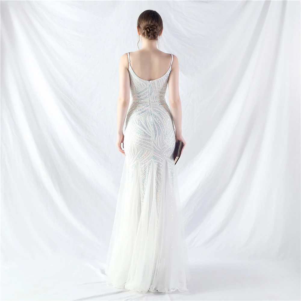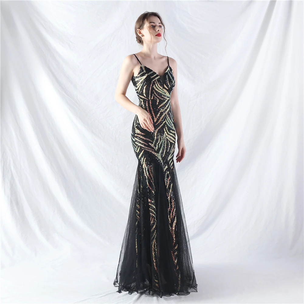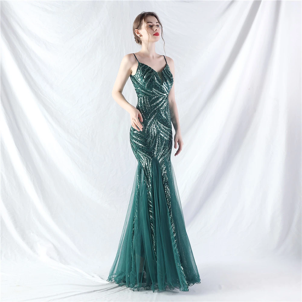 Stacked Sequins Splicing Mesh Gauze Sling Evening Dress
