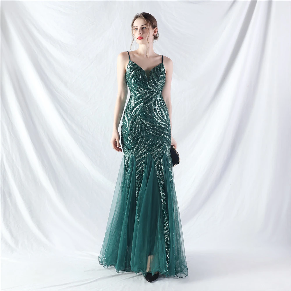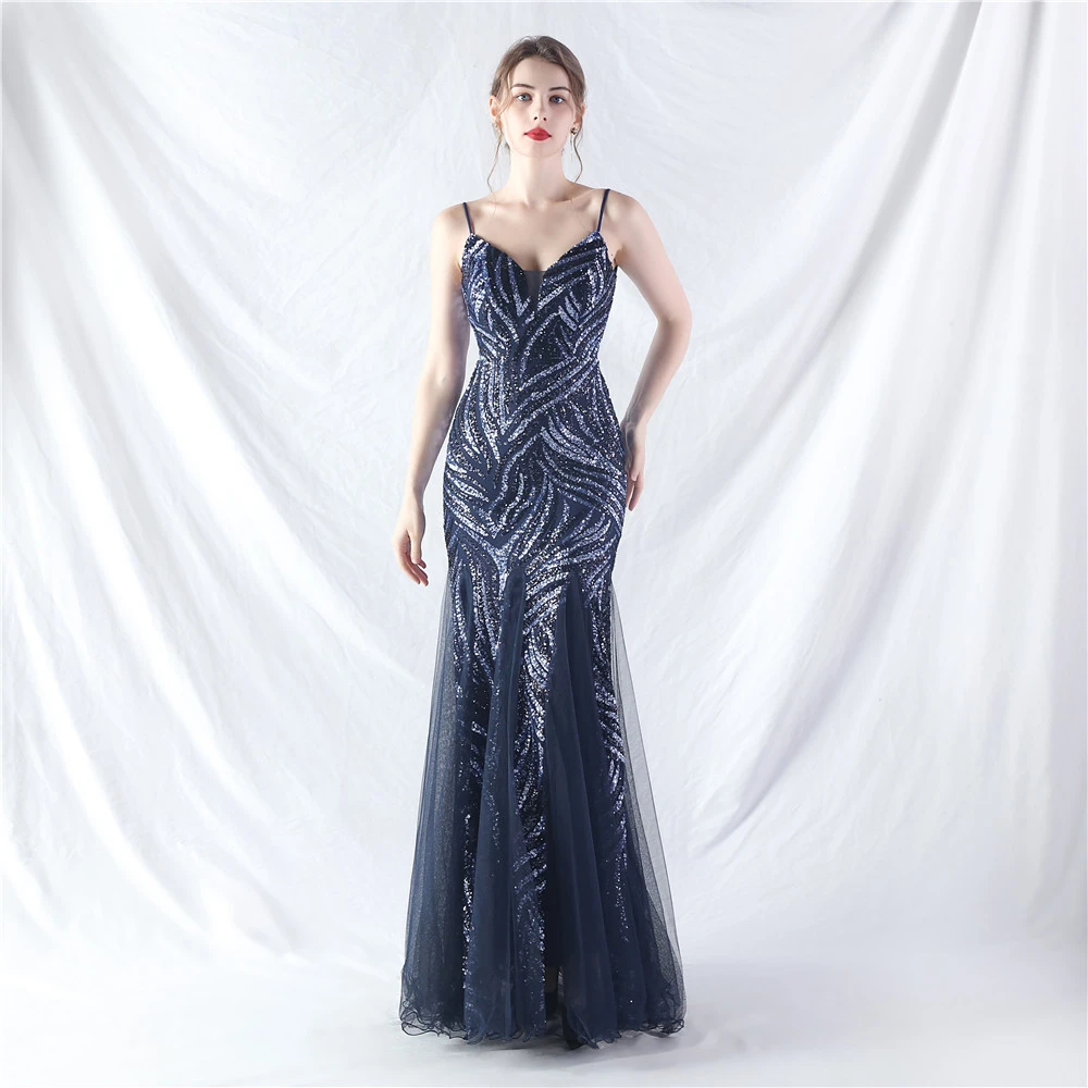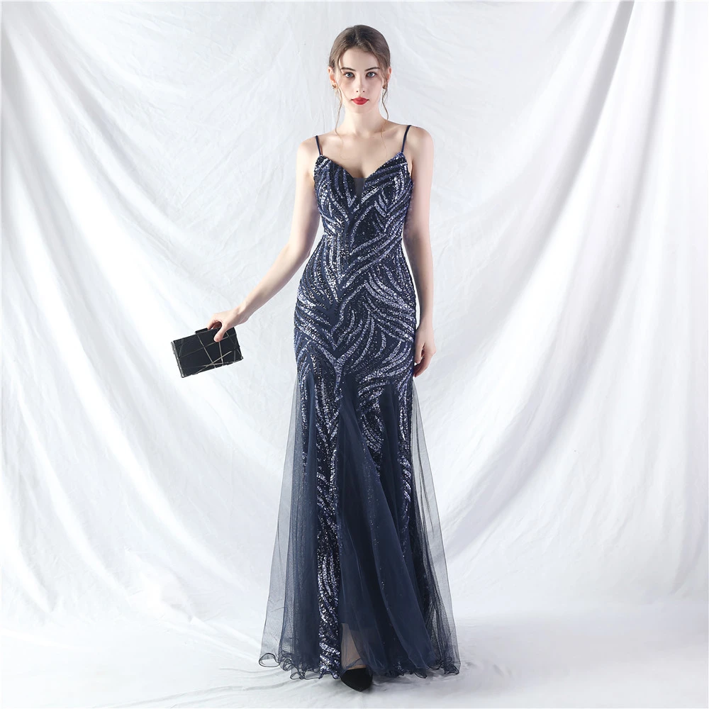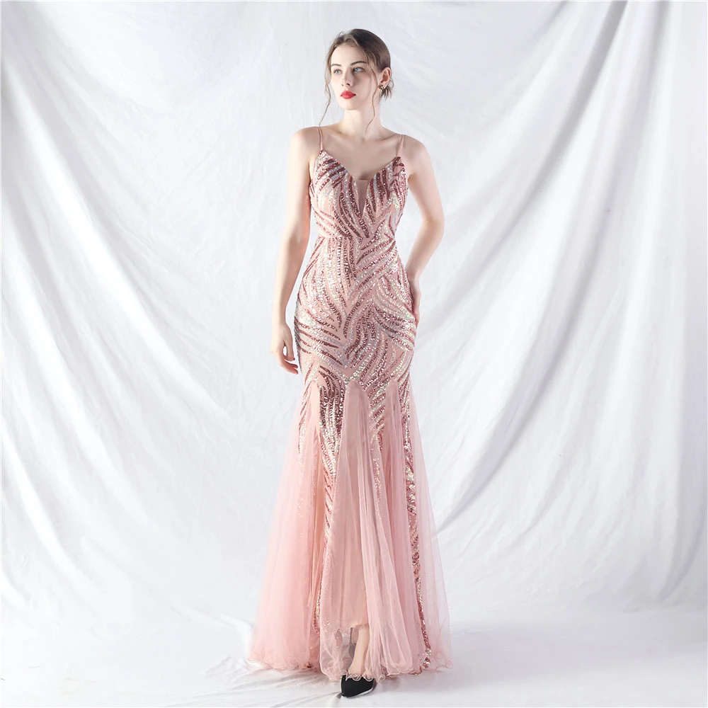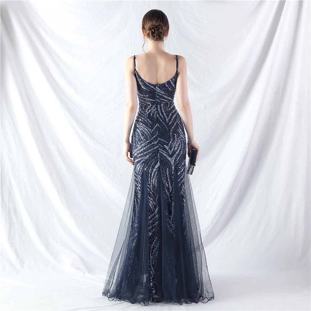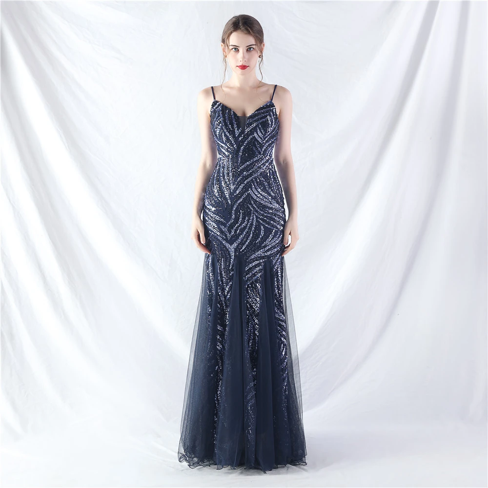 Stacked Sequins Splicing Mesh Gauze Sling Evening Dress