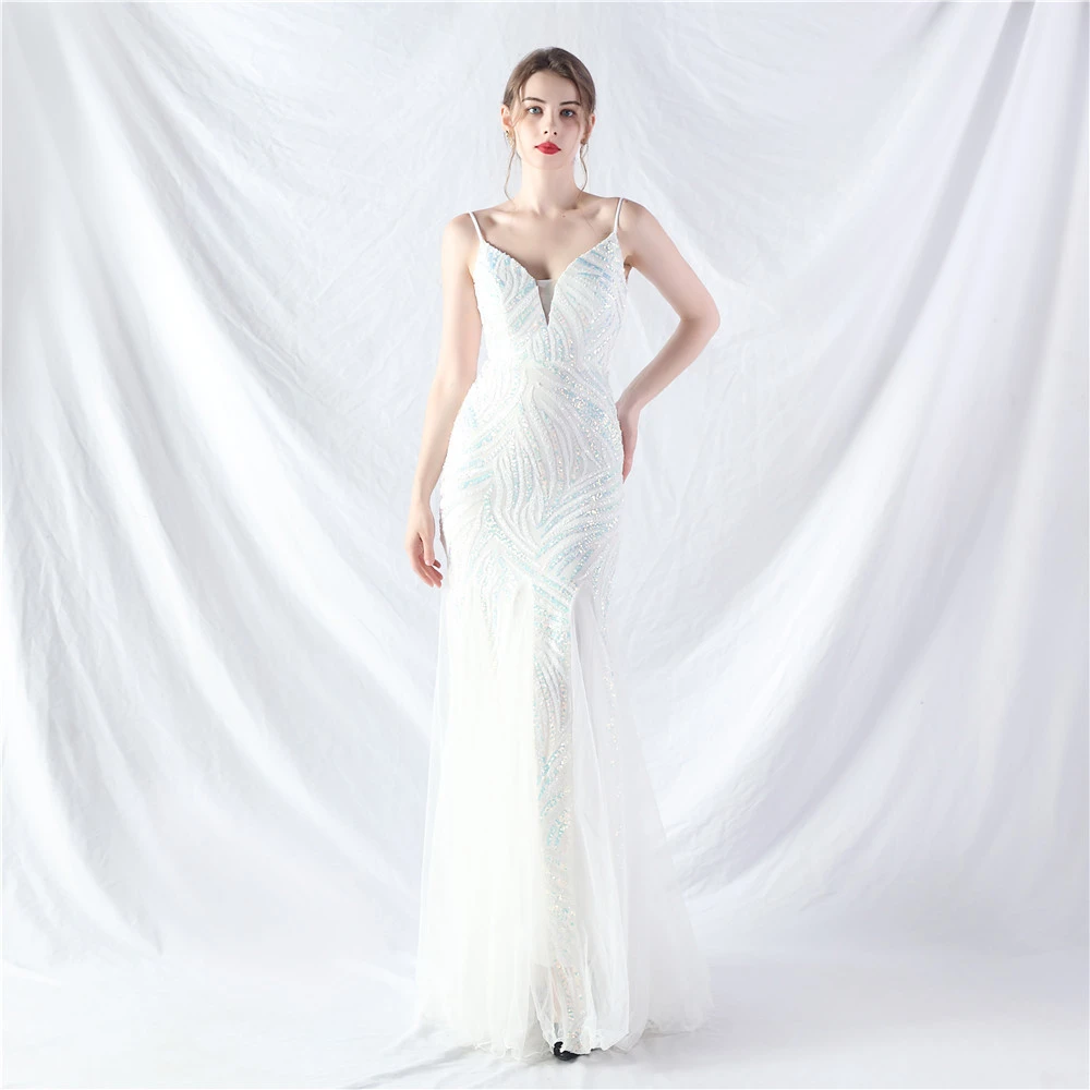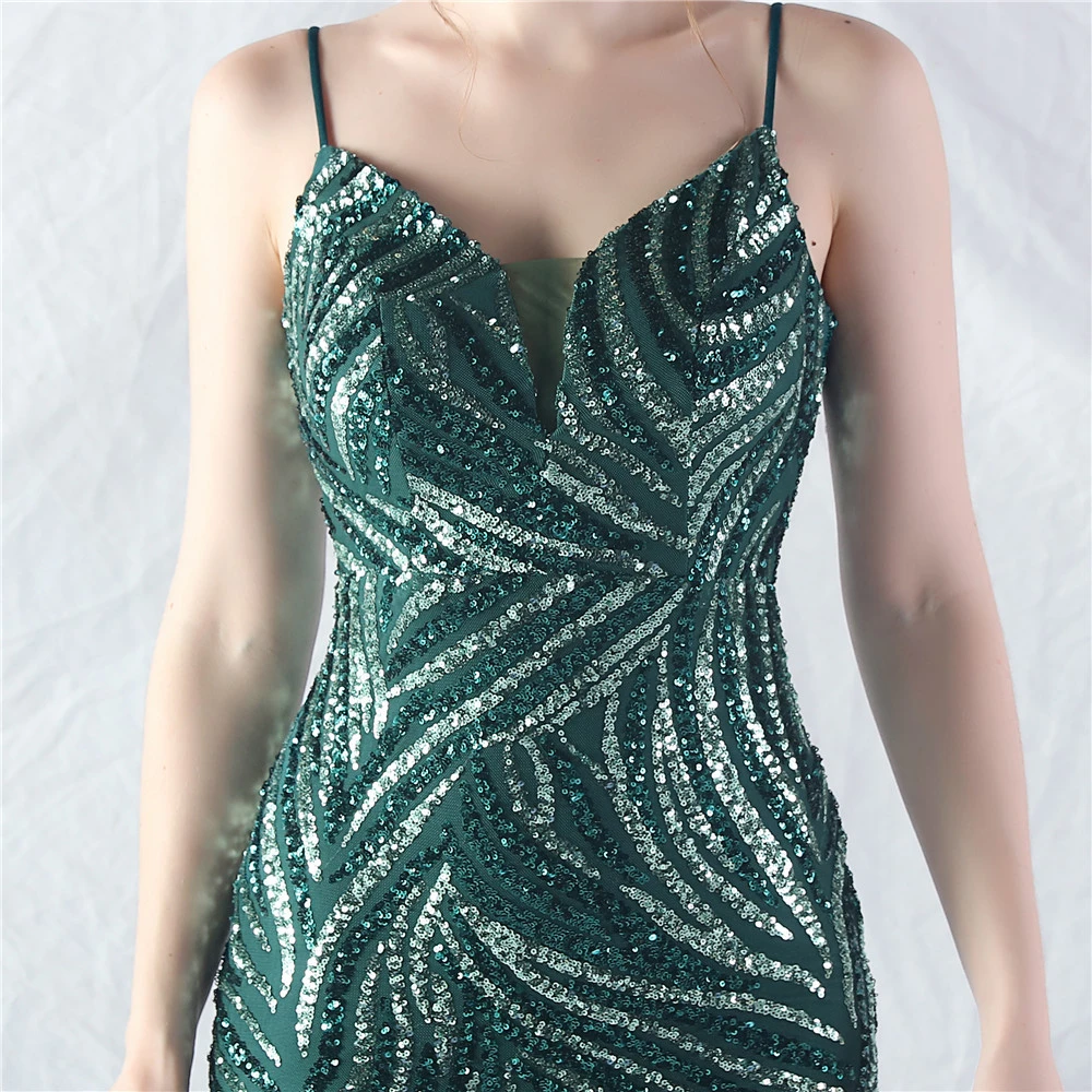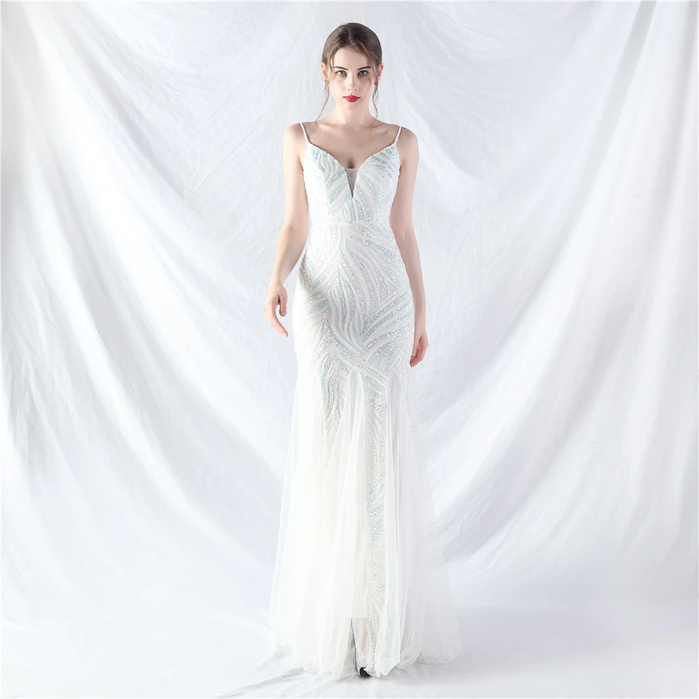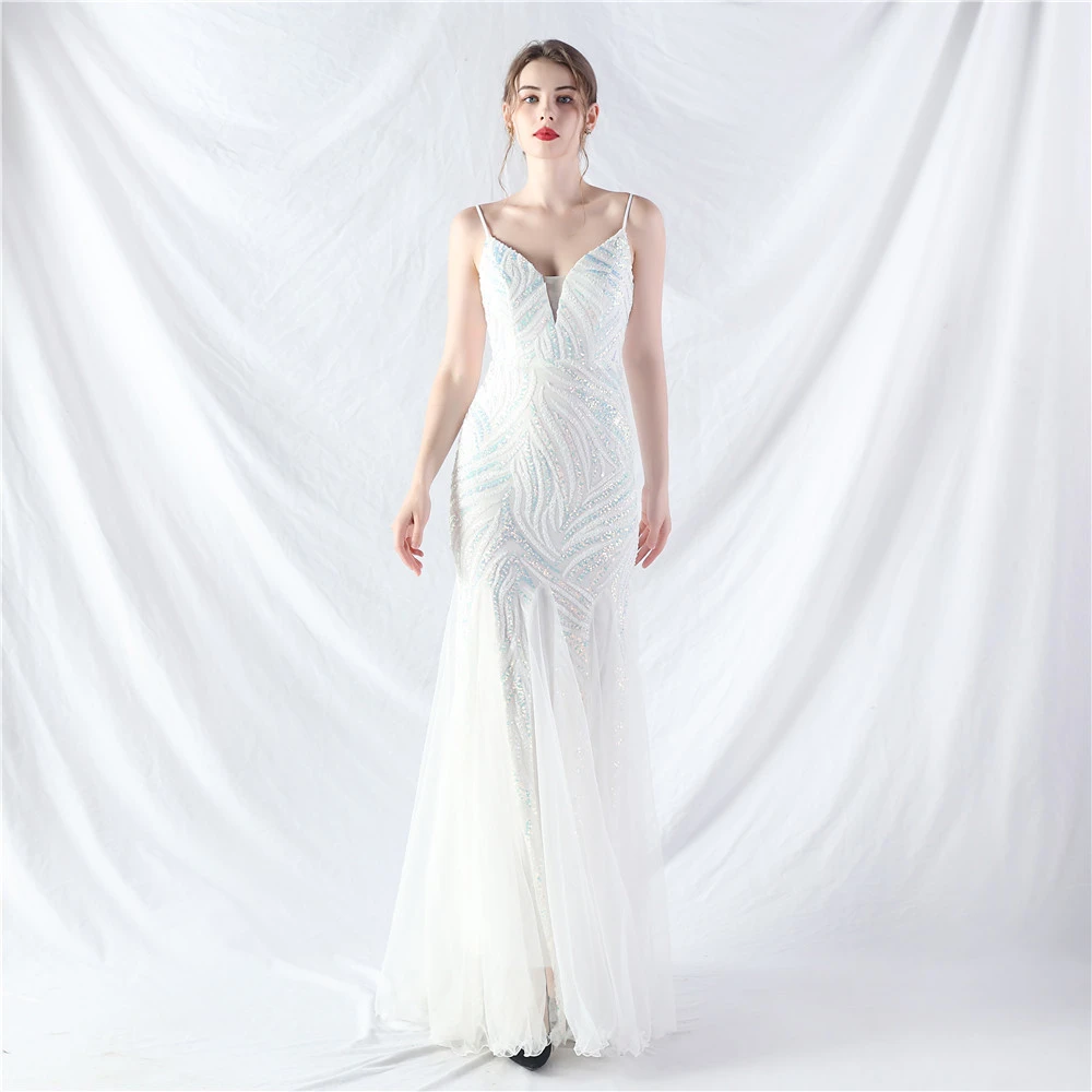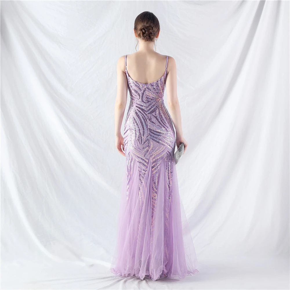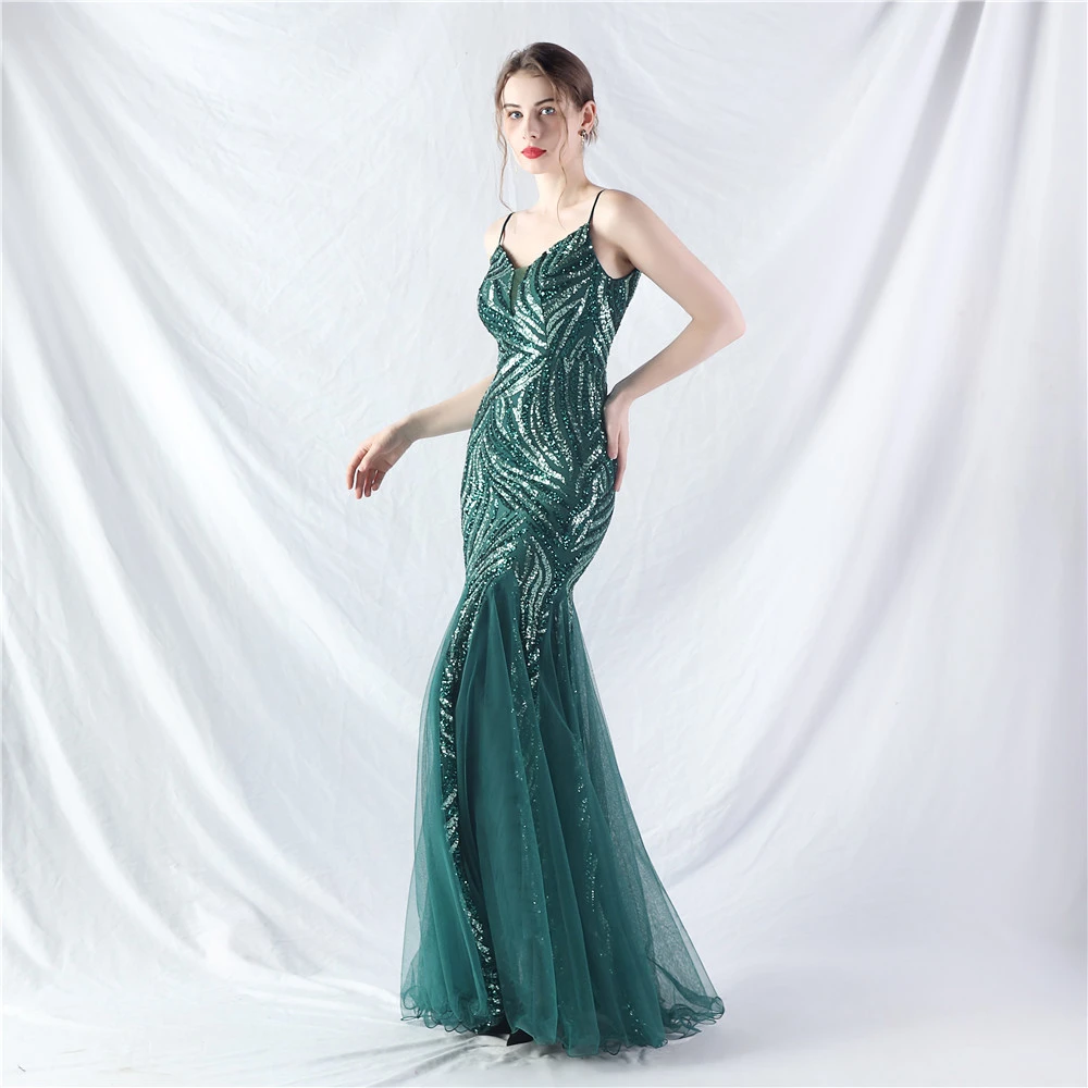 Stacked Sequins Splicing Mesh Gauze Sling Evening Dress